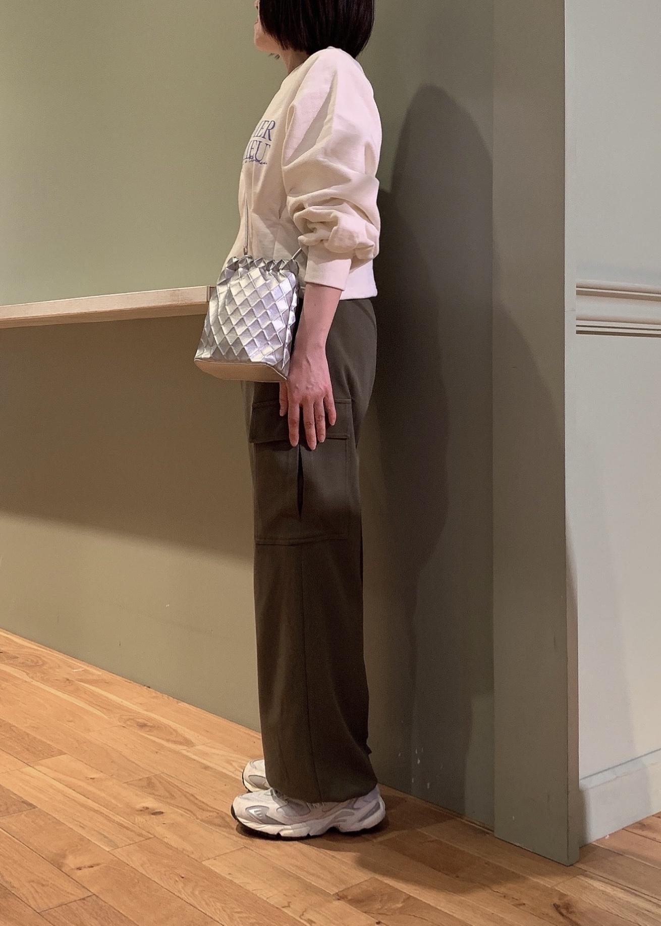 ウエスト部分がシェイプされてるスウェットなのでゆったりしたカーゴパンツと合わせてスポーティにしました。