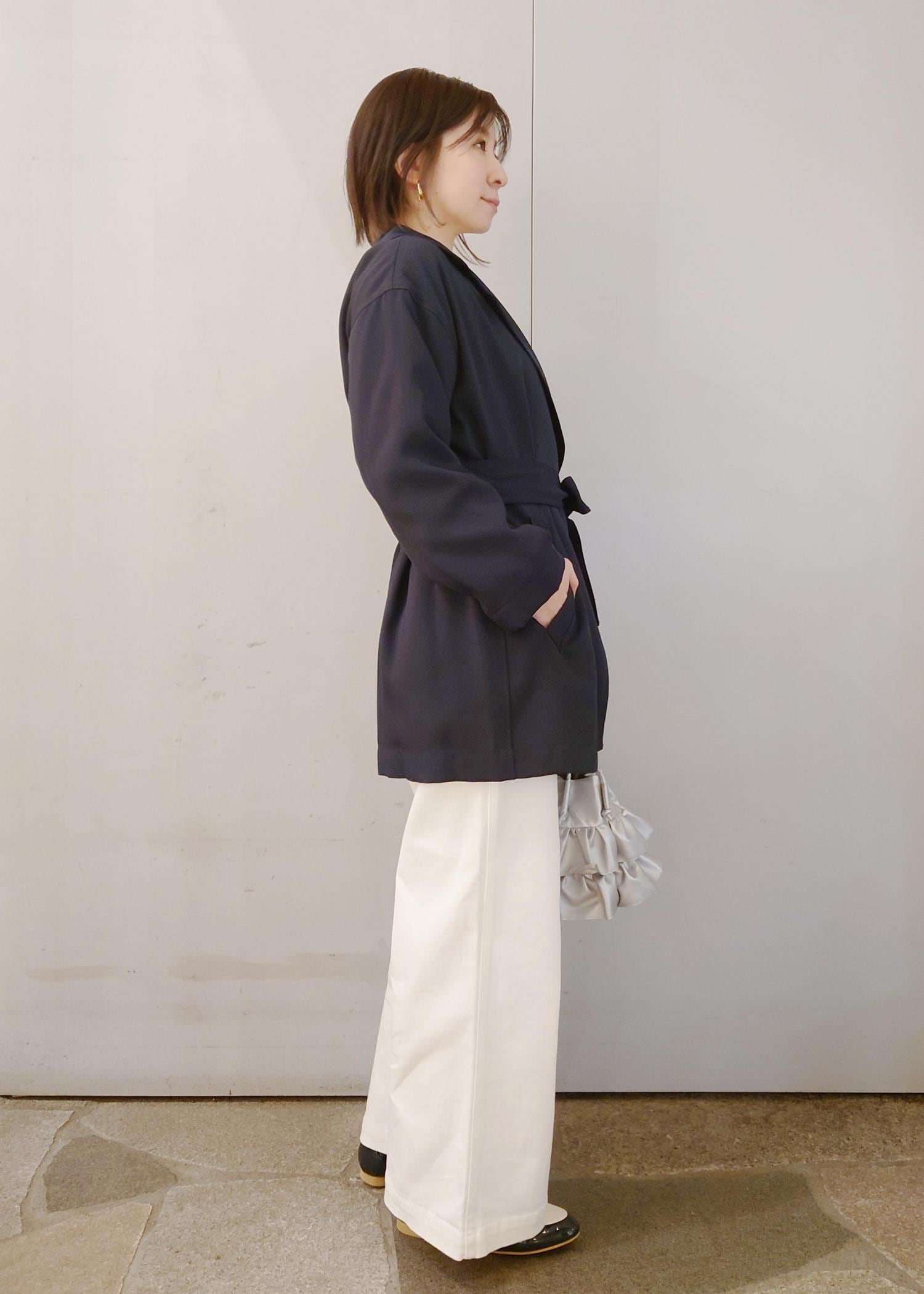 春らしいホワイトを貴重としたワントーンコーデに、ネイビーのショート丈アウターをさらりと羽織ったスタイル。