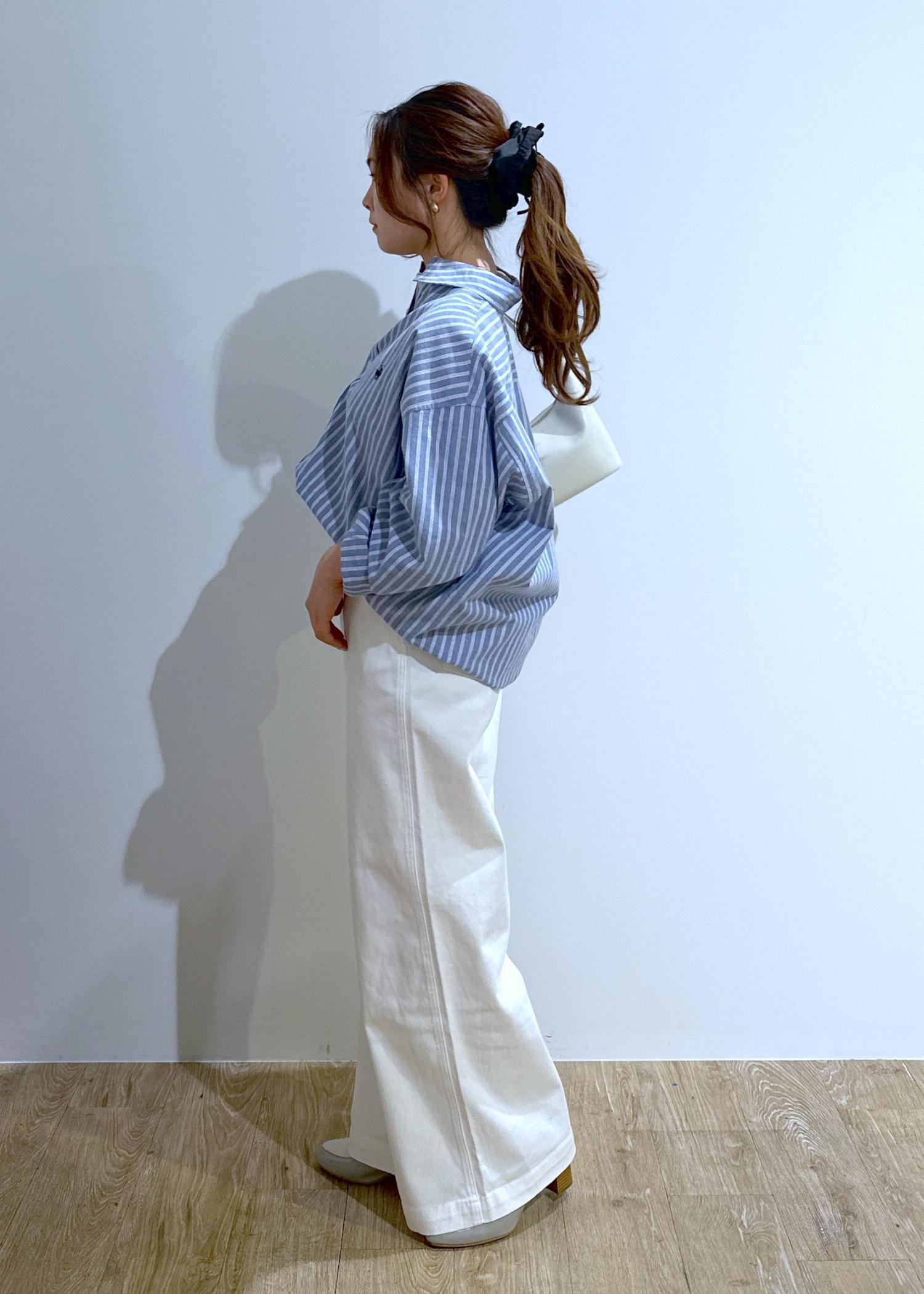 オーバーサイズなストライプシャツを前だけインしてこなれ感のあるコーデに⟡.·