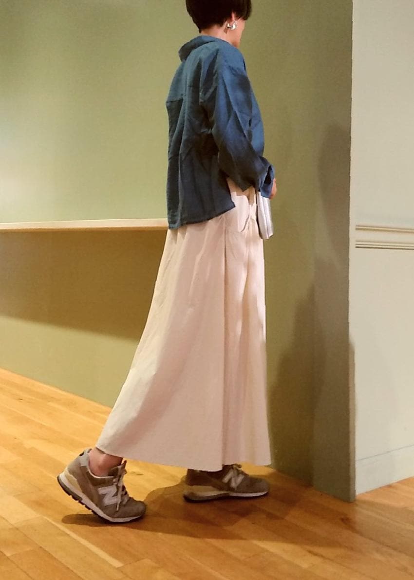 シアーシャツの羽織りスタイルです。ショート丈とロング丈のバランスが◎。デニム風に見えるシャツはとても軽い着心地で着やすく、今年らしいクロップド丈でおすすめです。ワンピースに羽織っても素敵です。