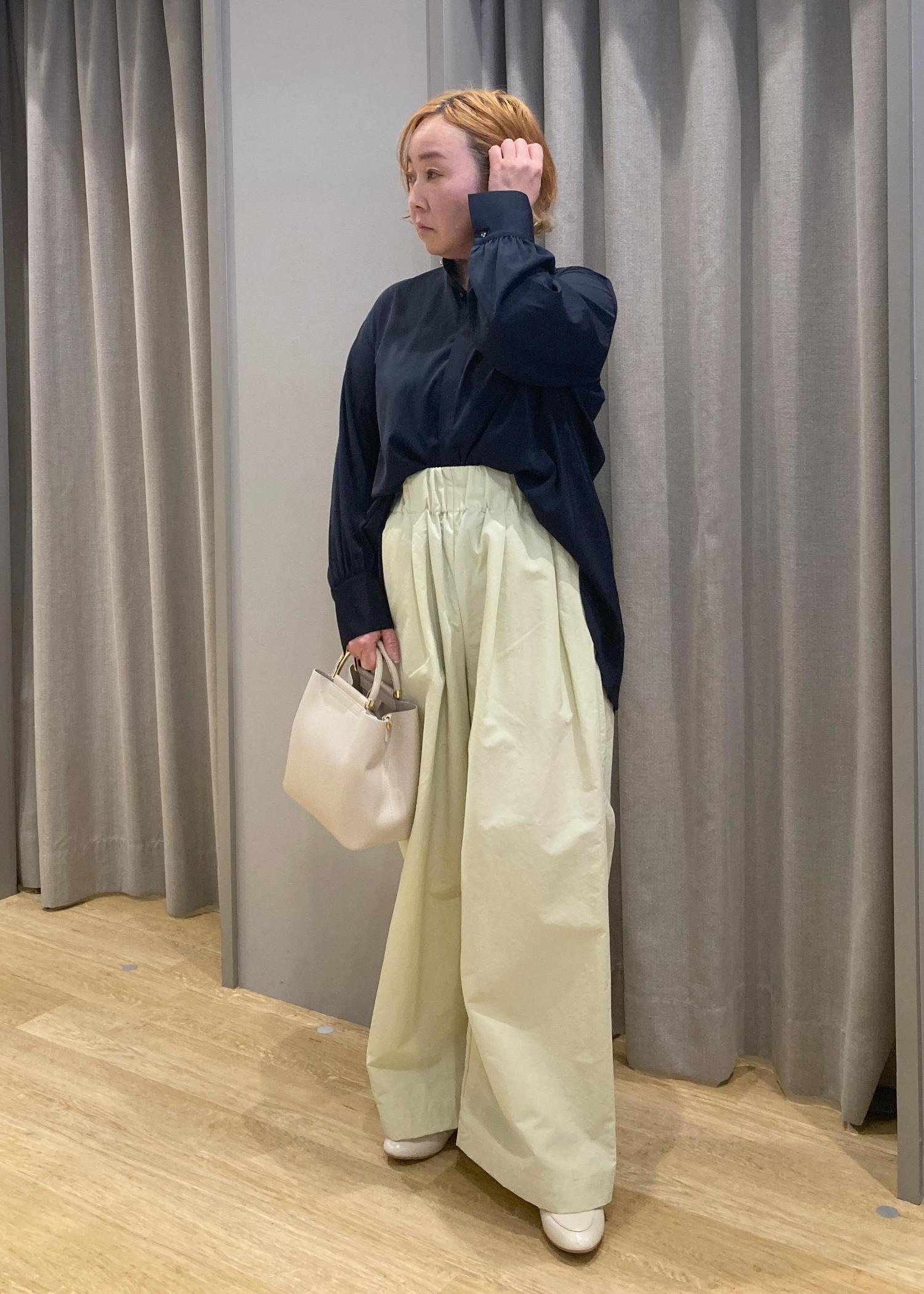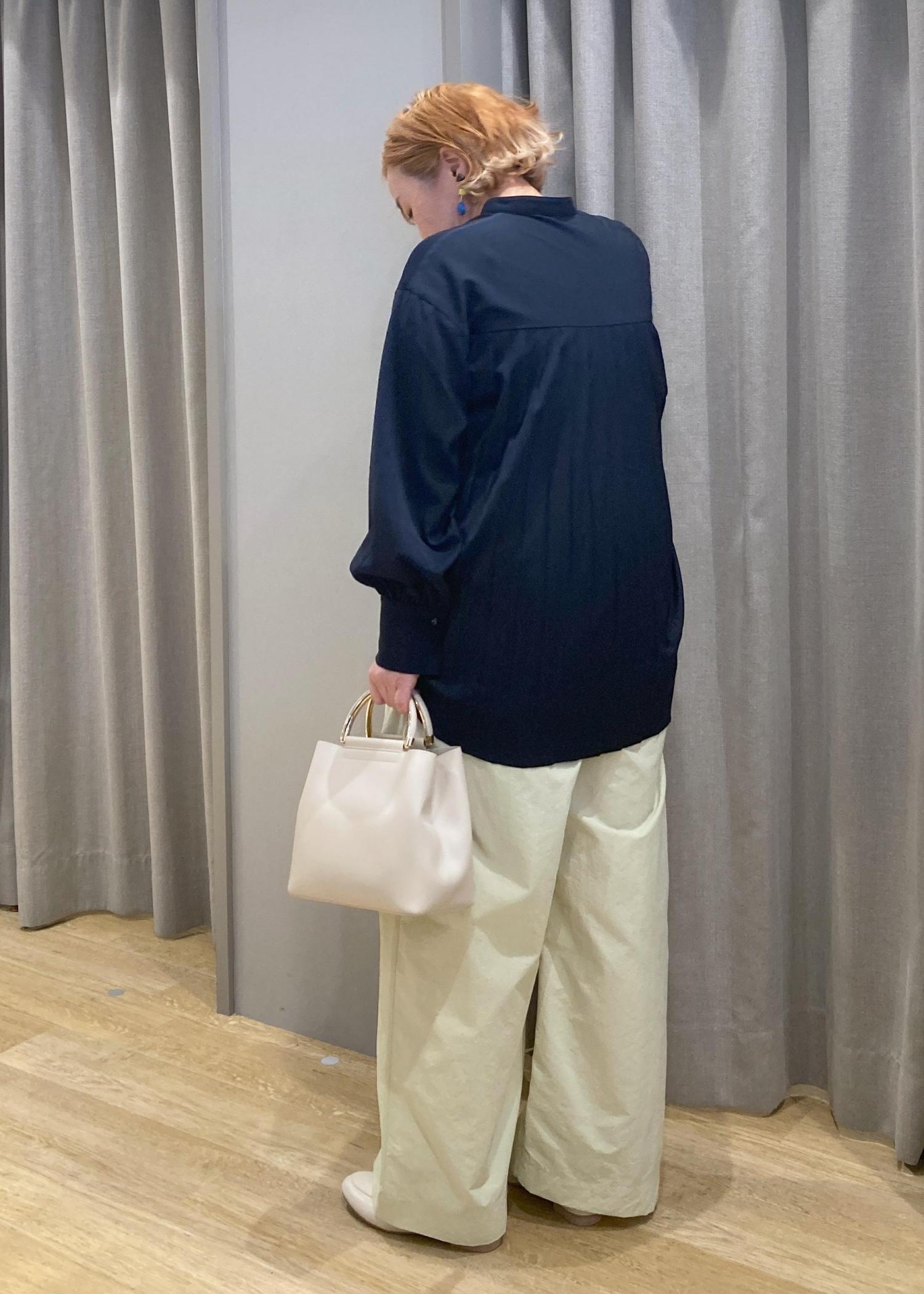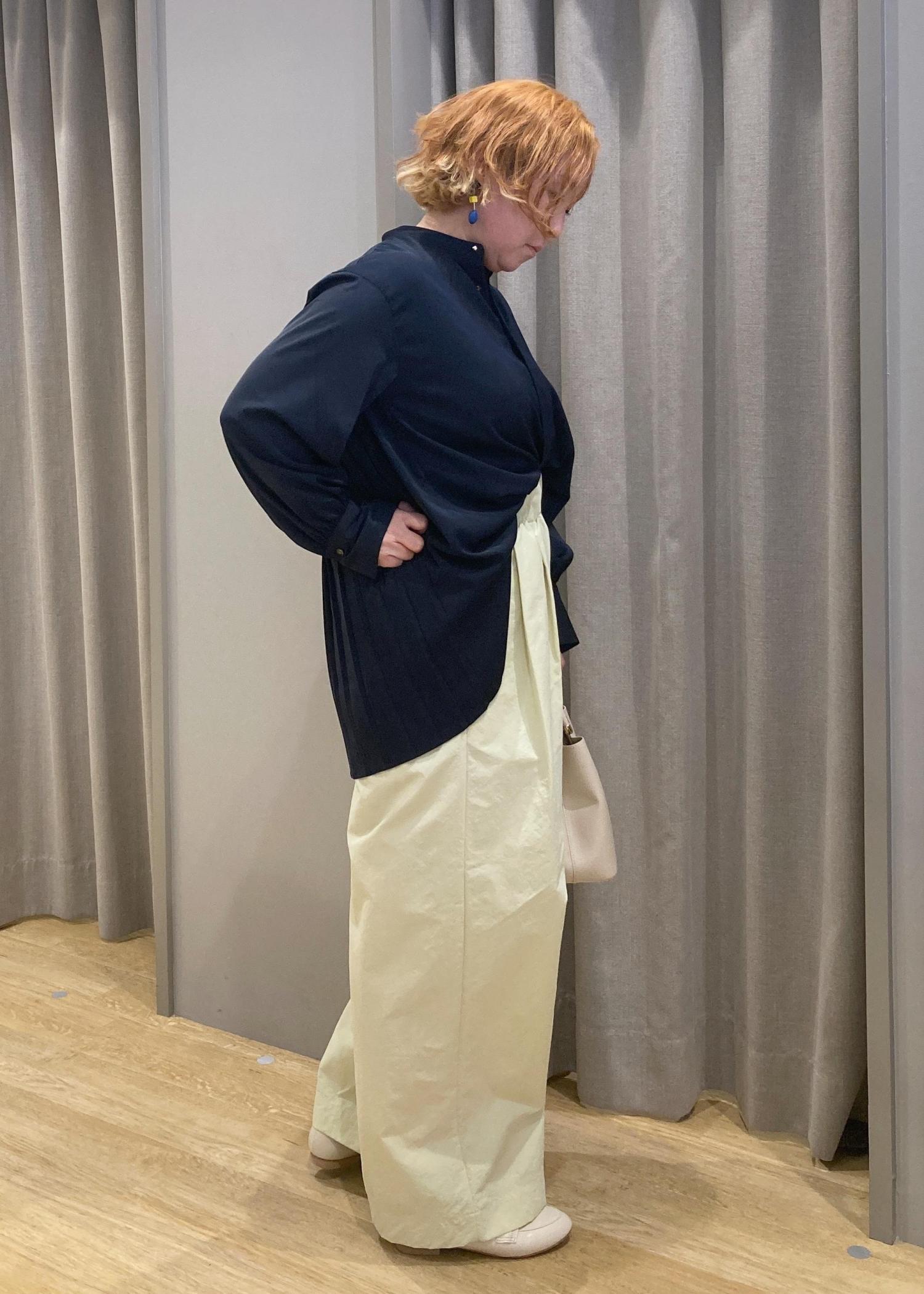 とろみのあるブラウスで、肌触りもよく、ゆったりしたシルエットですが、オチ感があるのでスッキリ細見えします。