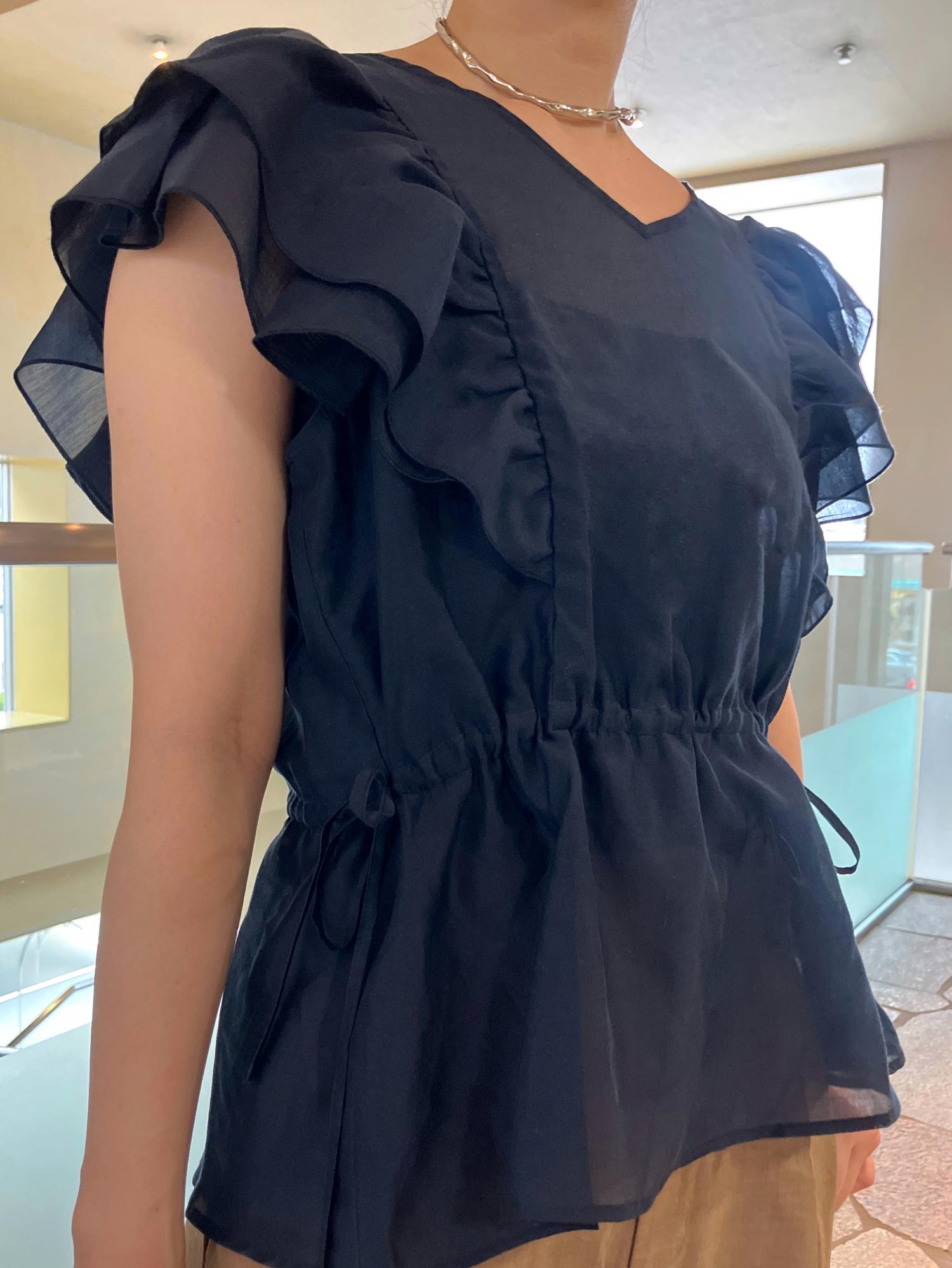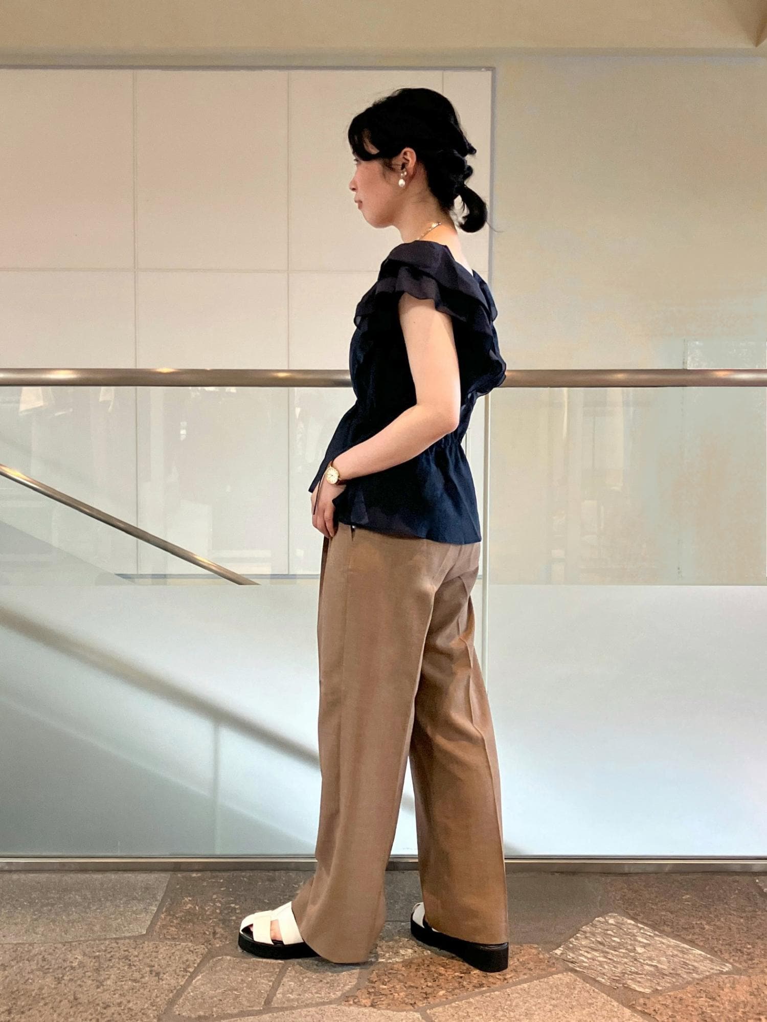フリル袖が目を引くシアーブラウスに、リネンライクなワイドパンツを合わせました。
