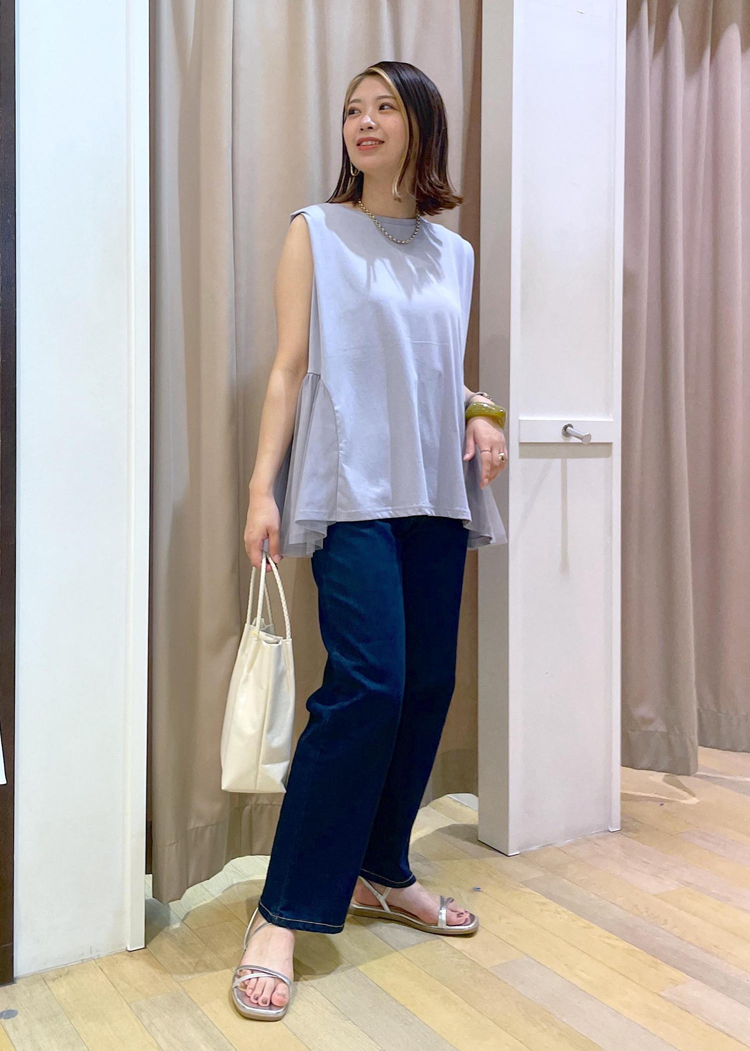 フロントは少しシンプルなので、スカーフやロングネックレスをプラスするのもオススメです!