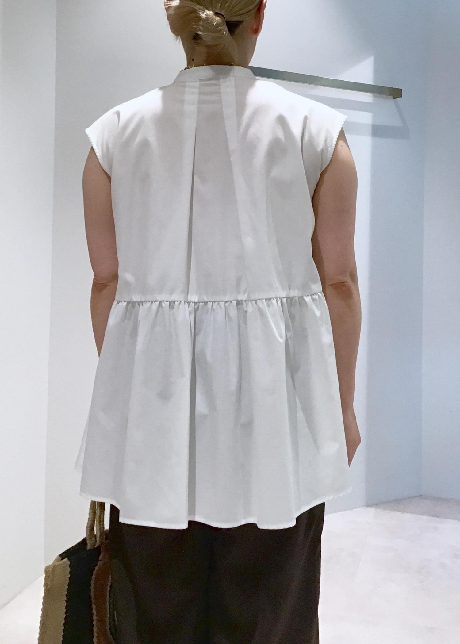 裾にかけてのシルエットが目を惹くブラウスを、リラックス感のあるボトムと組み合わせてシックな雰囲気にまとめました。