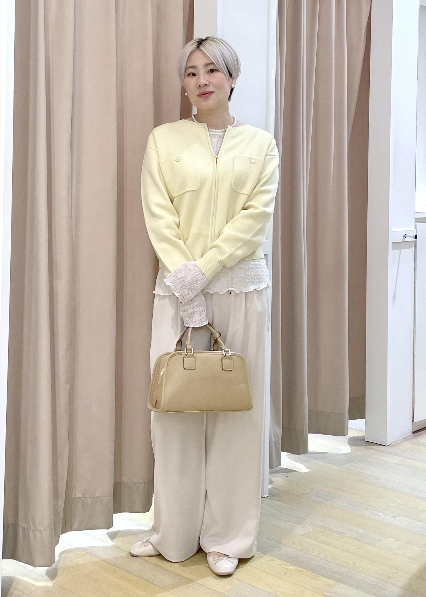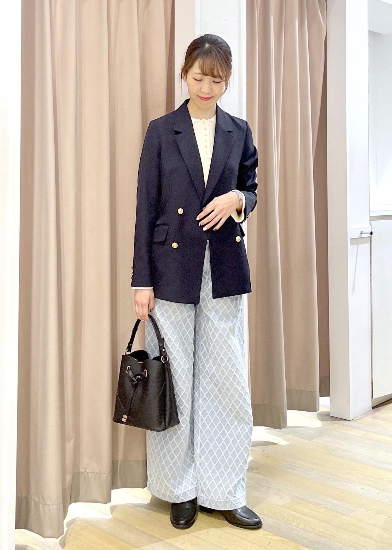 テーパードパンツと合わせてお仕事着にもオススメな1枚目です!