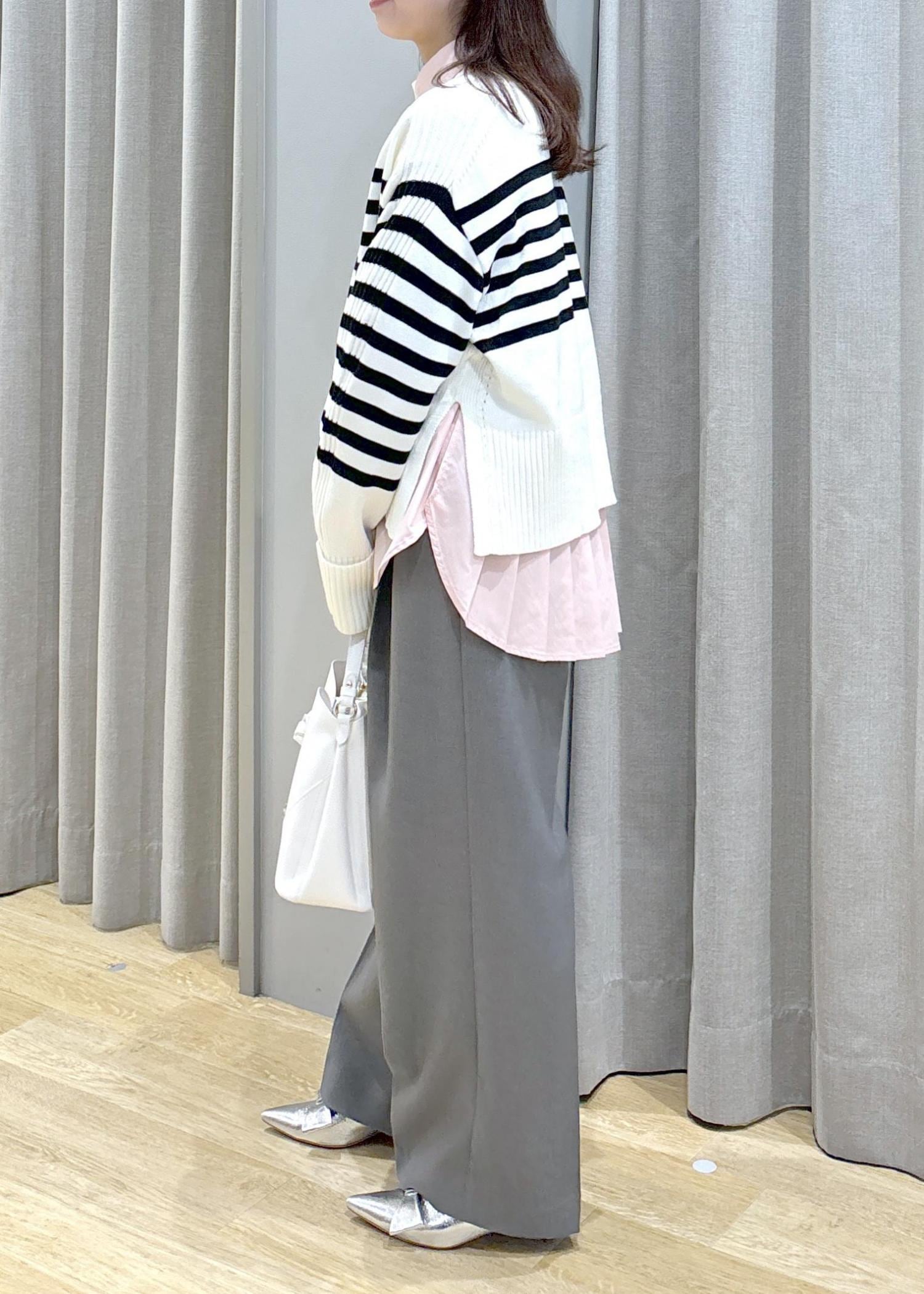 サイドスリットニット×シャツブラウス×ワイドパンツ
