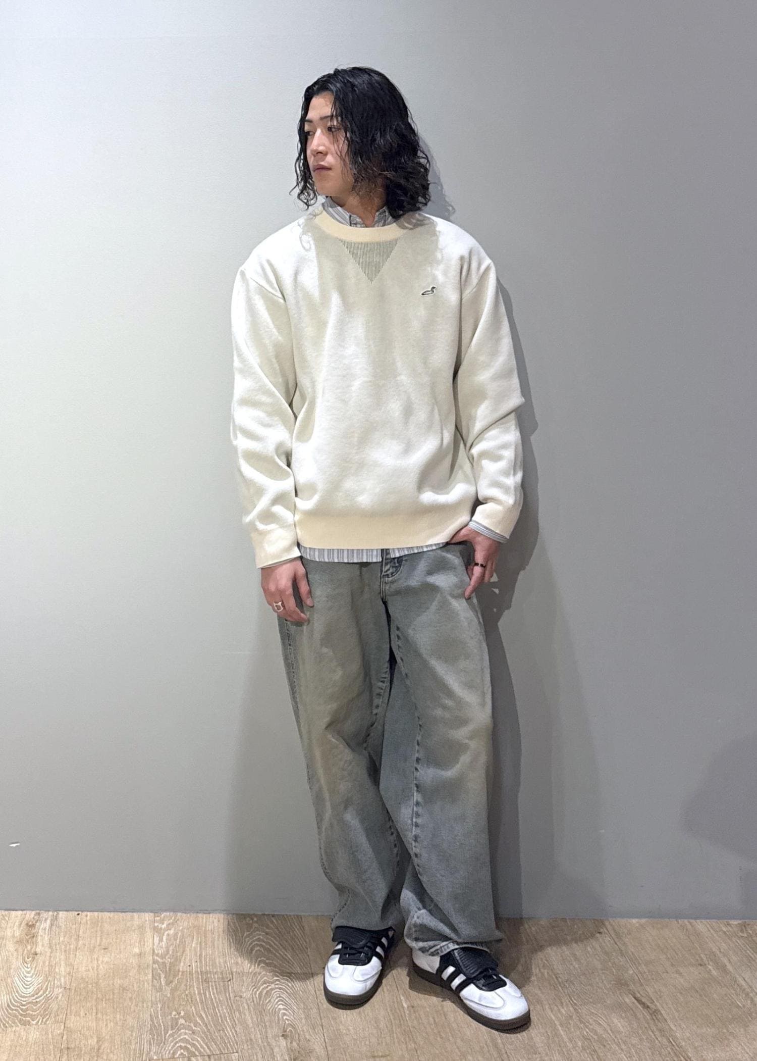 ロゴの赤とインナーに赤を着て、赤を強調させたレイヤードコーデはおすすめです!
