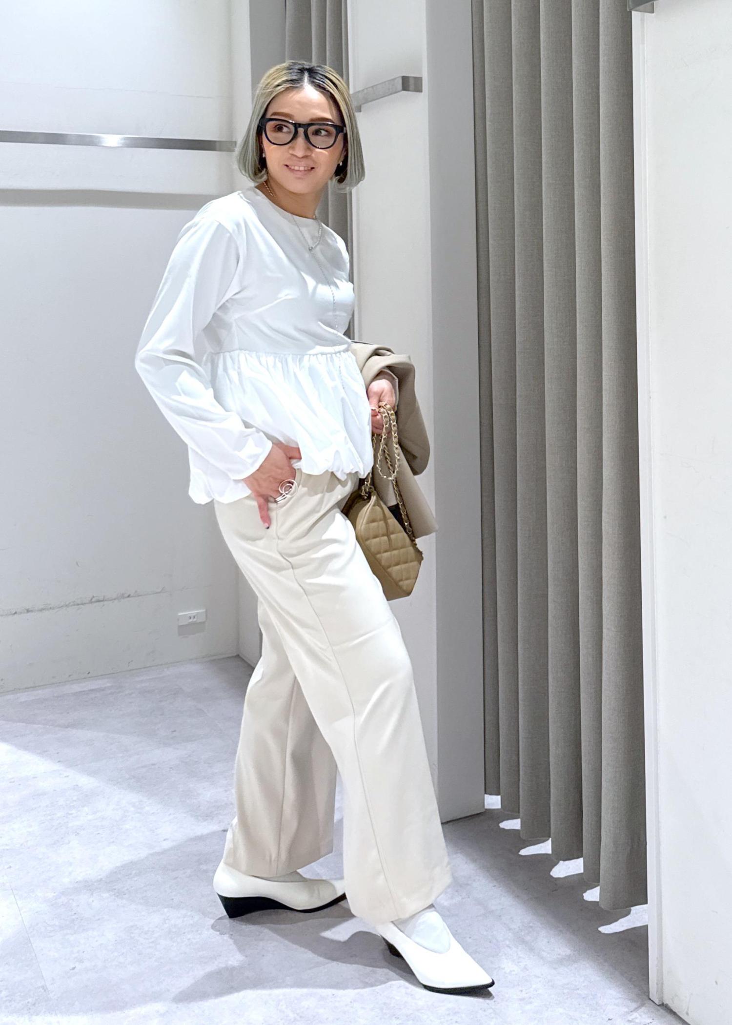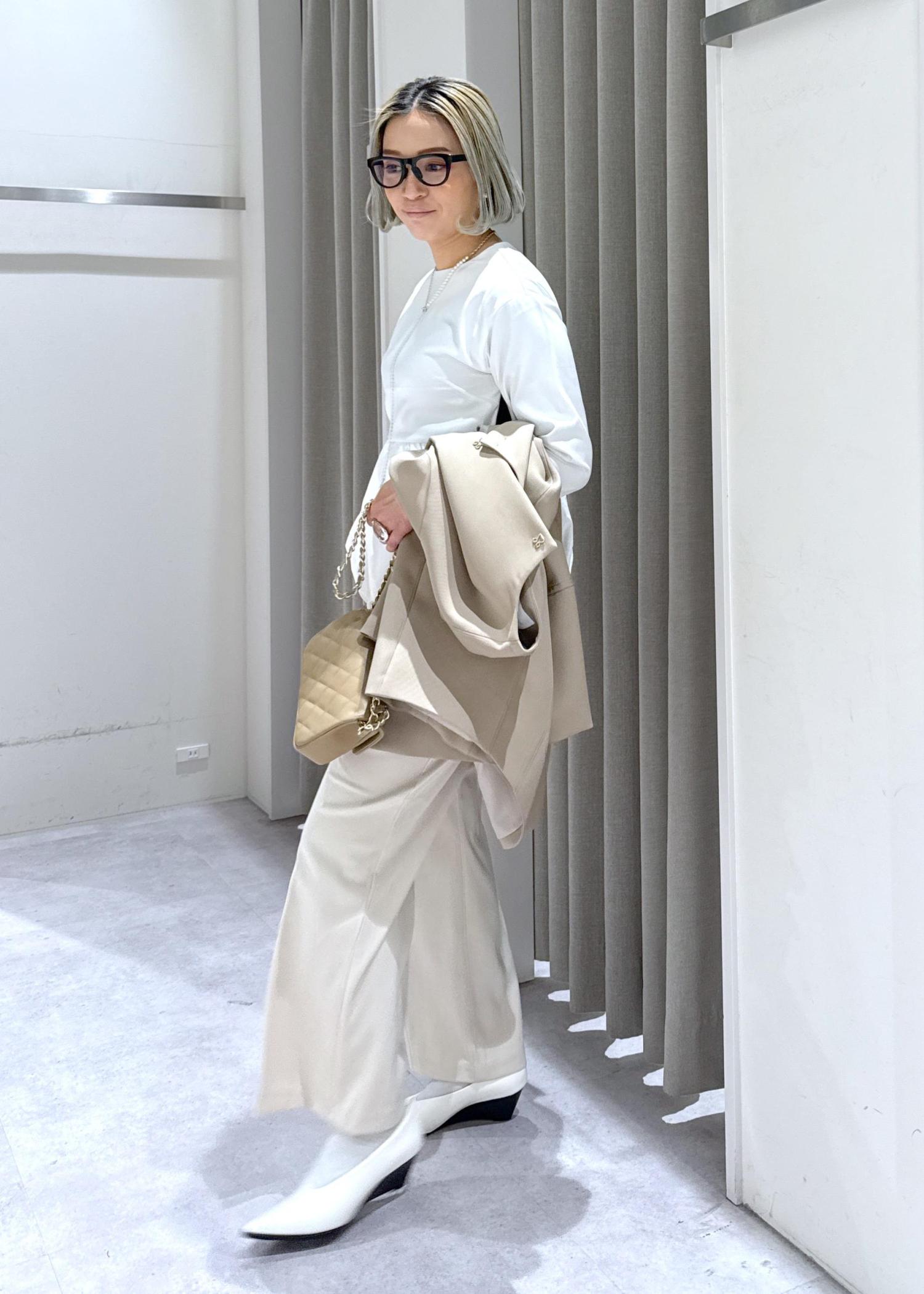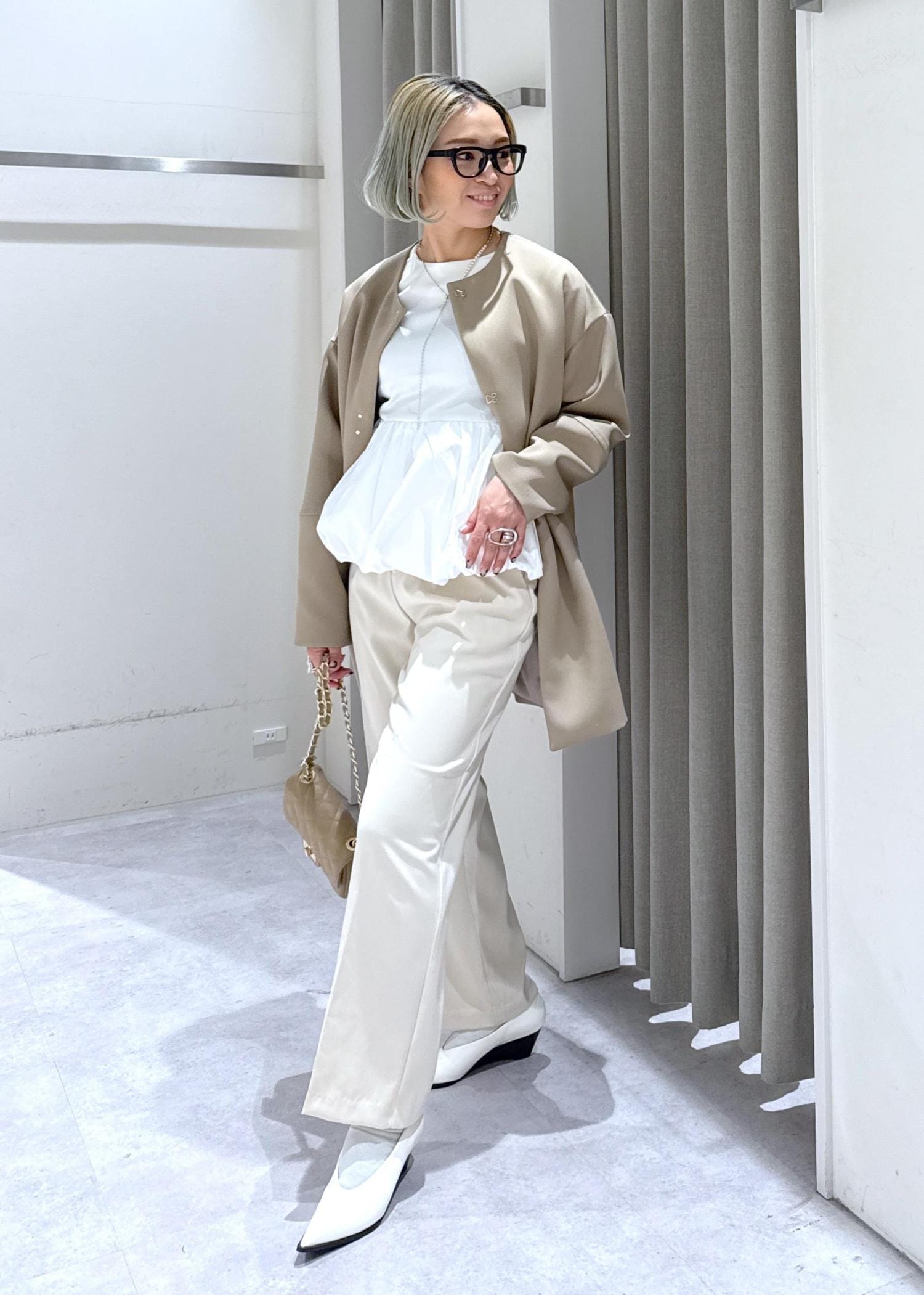 顔映り抜群のオフホワイトセットアップのコーディネートです。