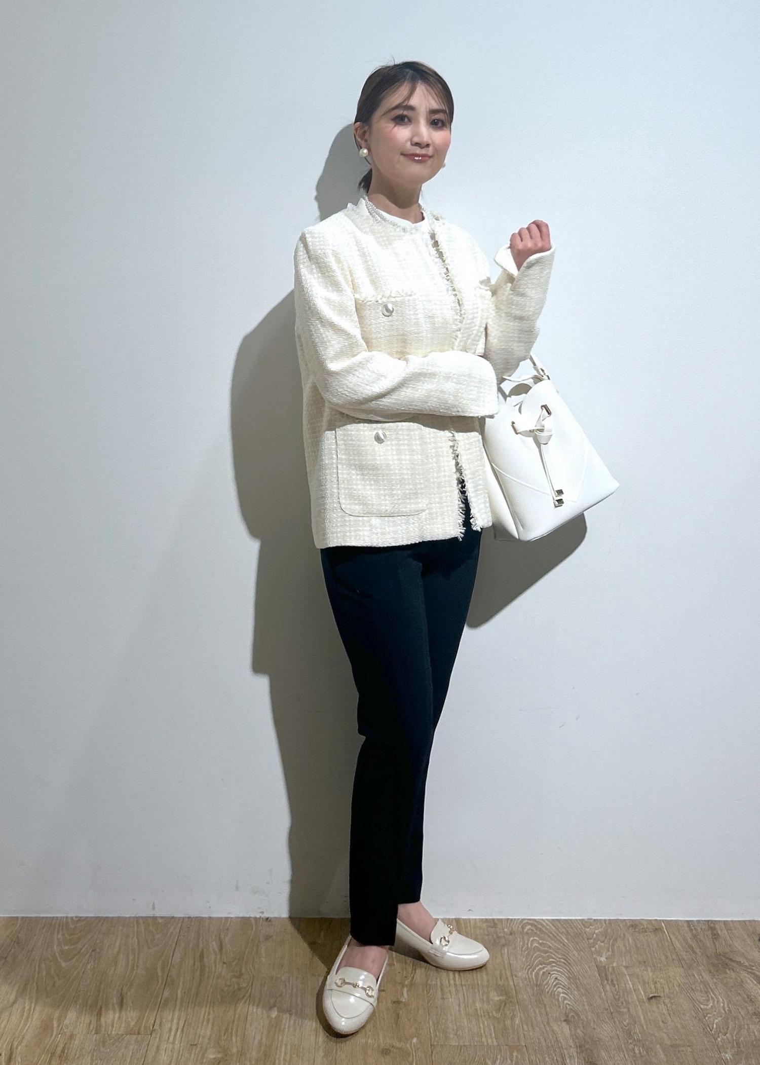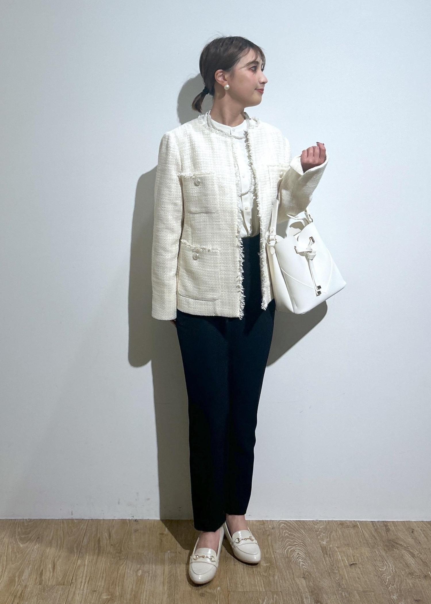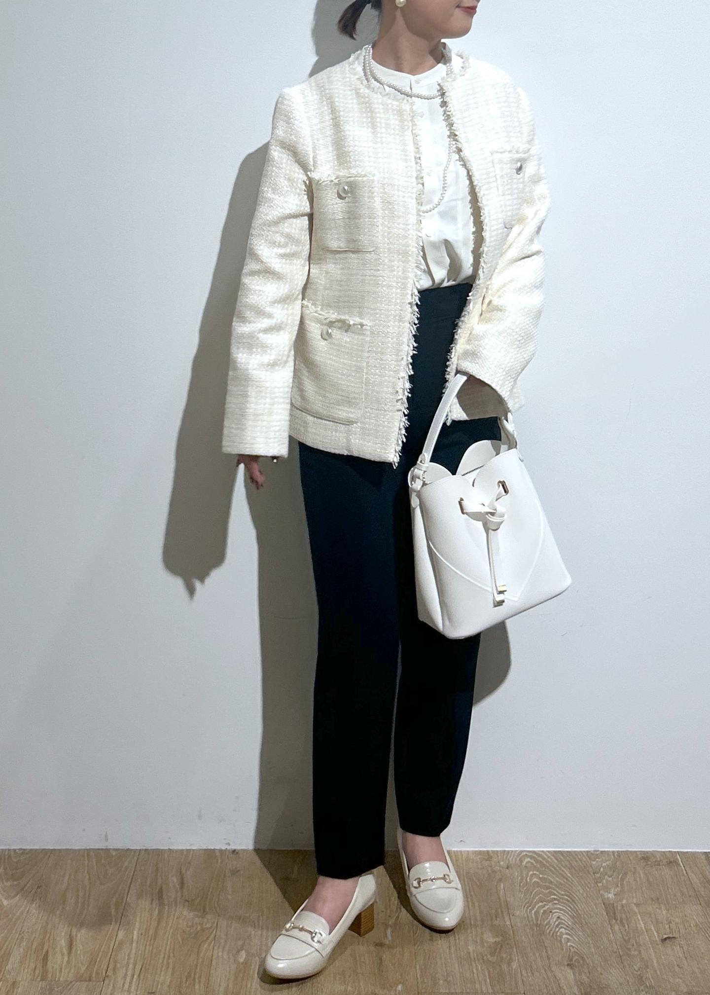 セットアップのジャケットやブラウスと合わせ、お仕事用やセレモニーの際にも活躍します。ニットやカーディガンと組み合わせたプライベートstyleにも◎