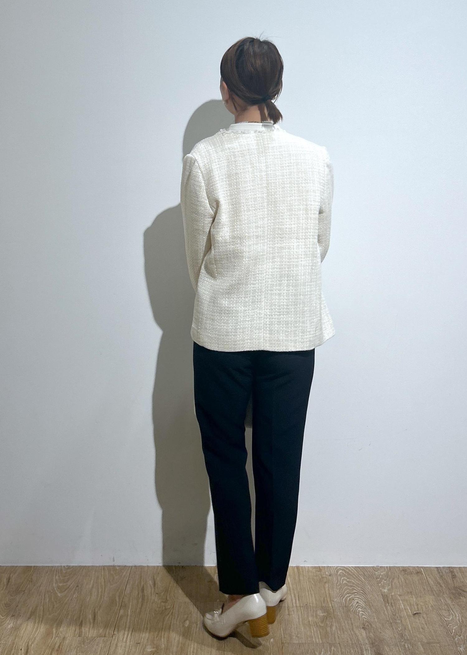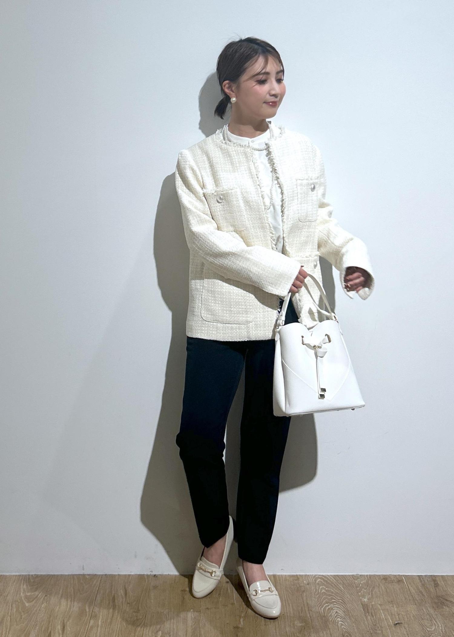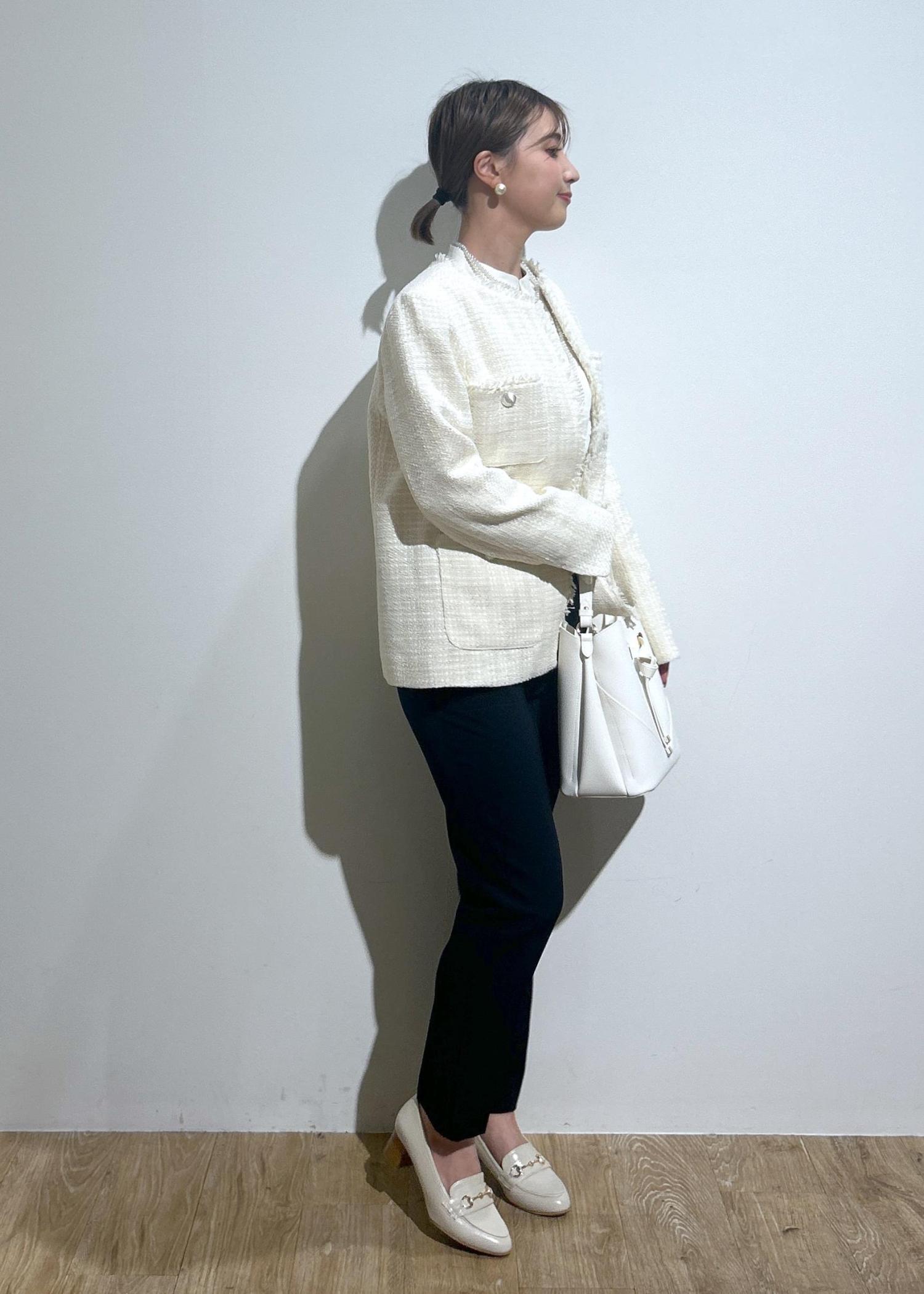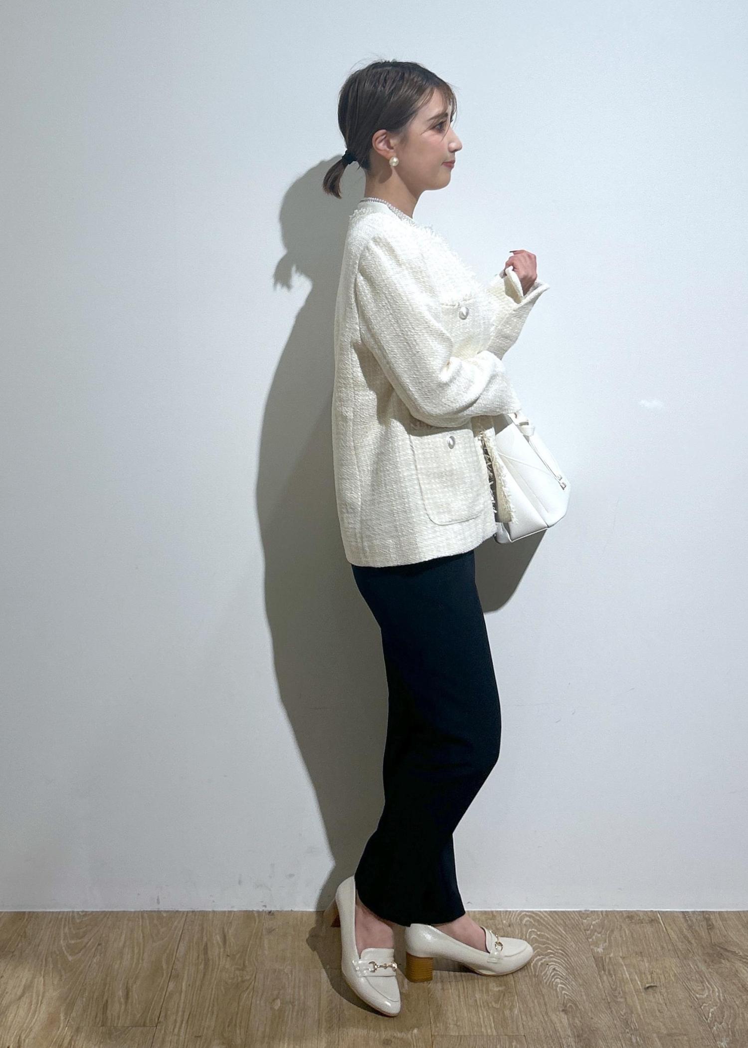 セットアップのジャケットやブラウスと合わせ、お仕事用やセレモニーの際にも活躍します。ニットやカーディガンと組み合わせたプライベートstyleにも◎