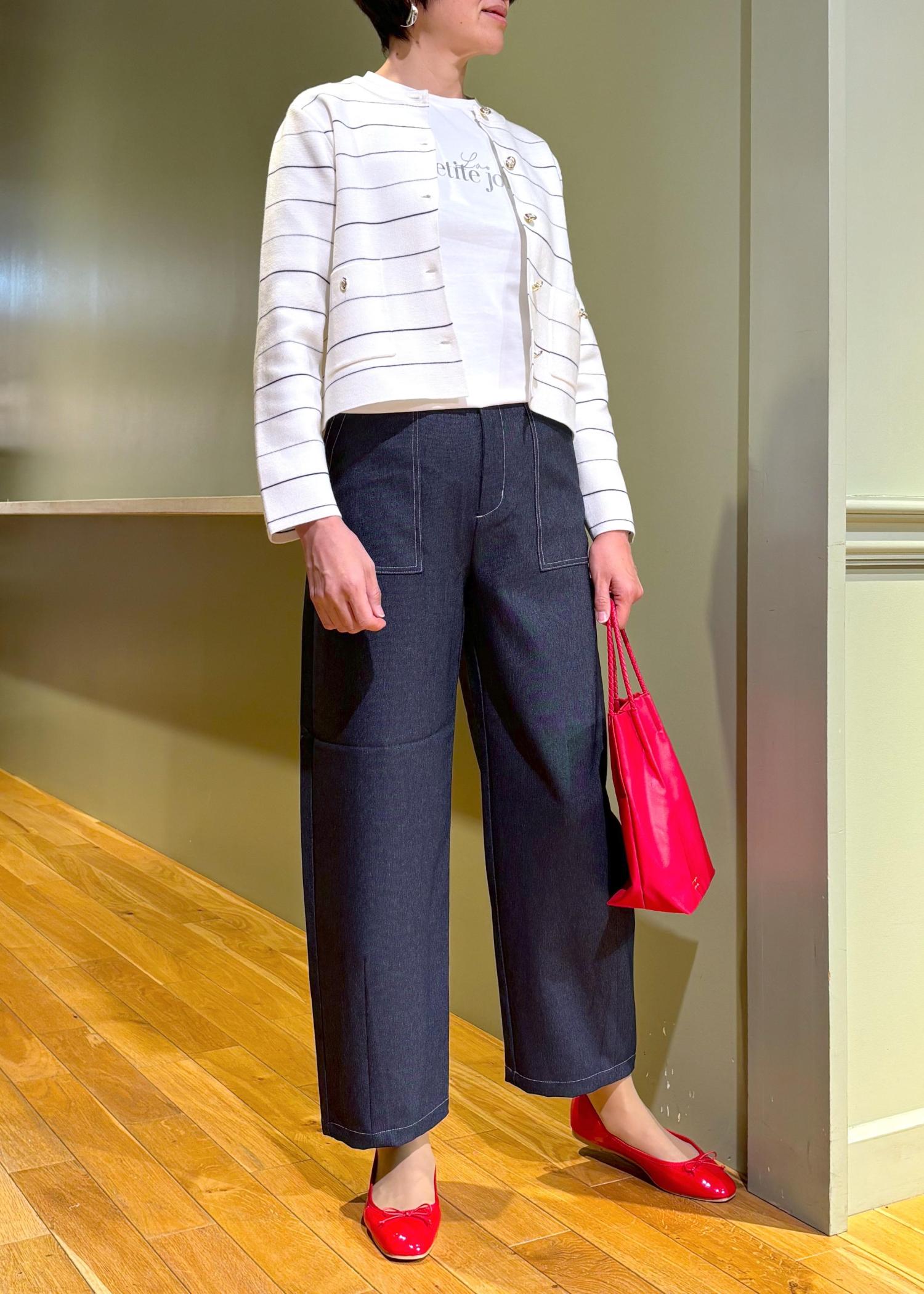 赤の小物をポイントにした、春におすすめのカーデスタイルです。金ボタンがポイントのカーデは、シャツをレイヤードしやすい丈間で、ボタンを閉めてプルオーバーとして着ても◎。