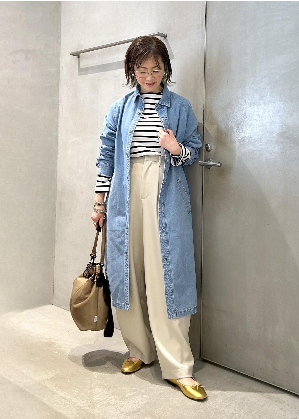 今回は定番のルミノアのボーダーTにカーブスラックスを合わせて、カジュアル過ぎないコーディネートにしました。