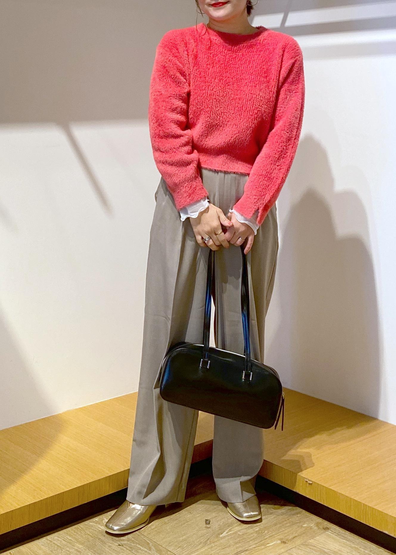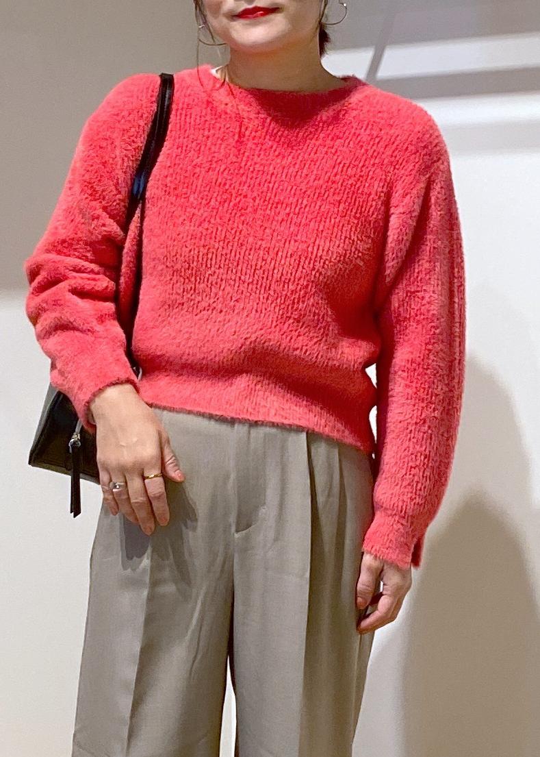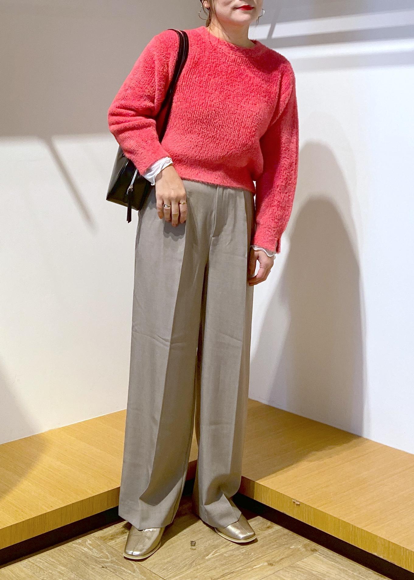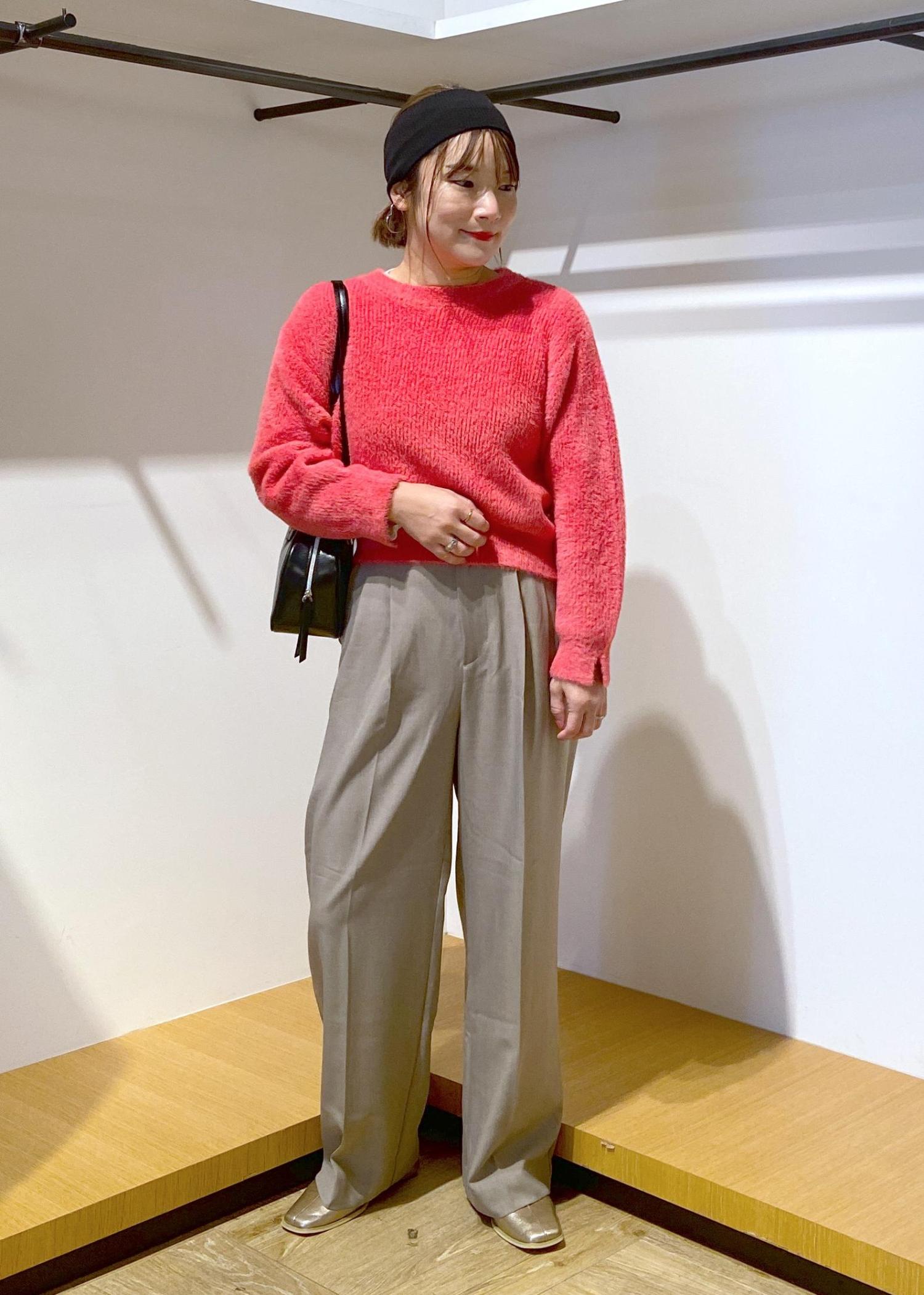 人気のフラッフィーニットのピンクをベーシックなパンツと合わせてスタイリングしました☆