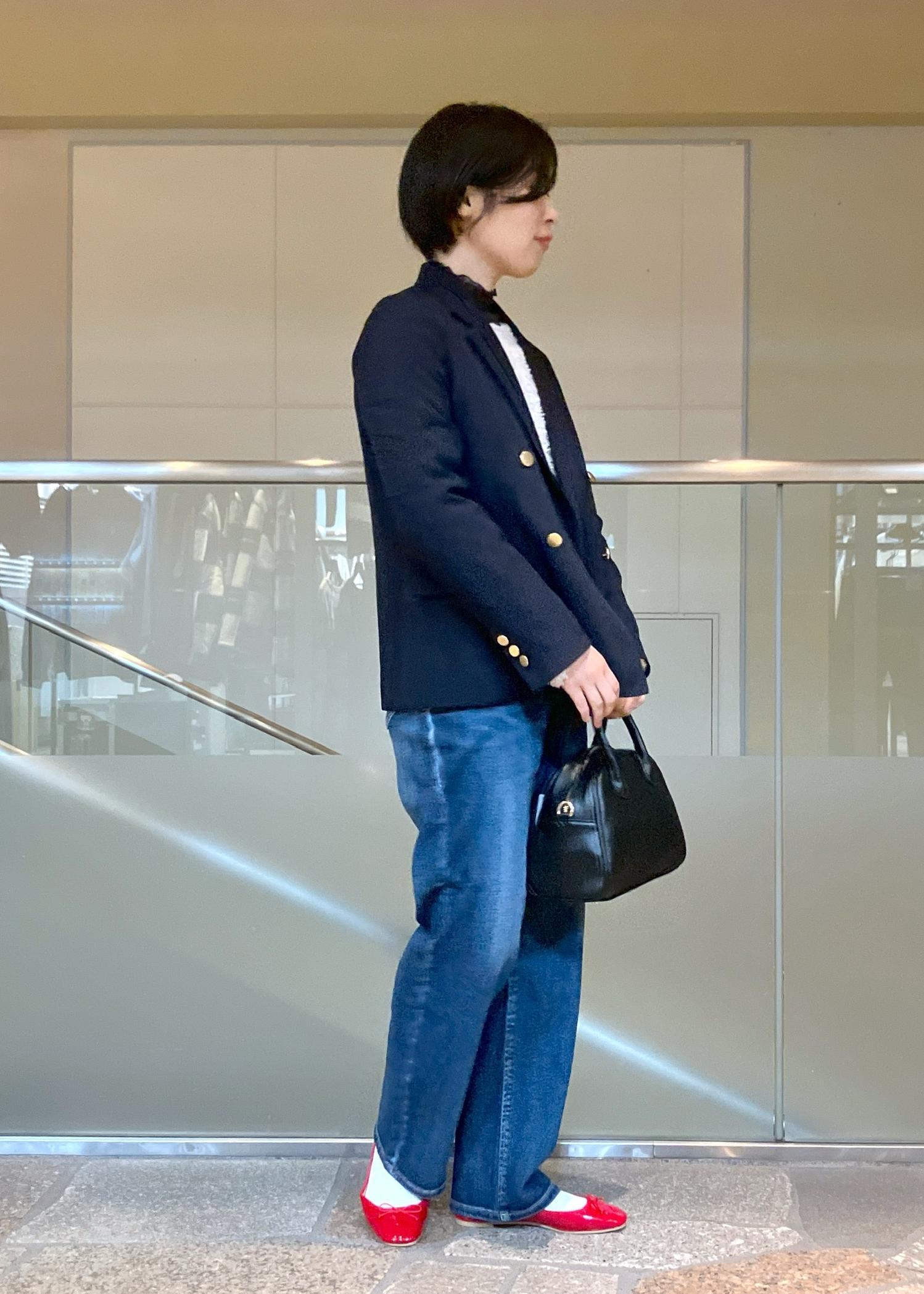 ハイウエストボトムと相性のよいコンパクトな着丈です。