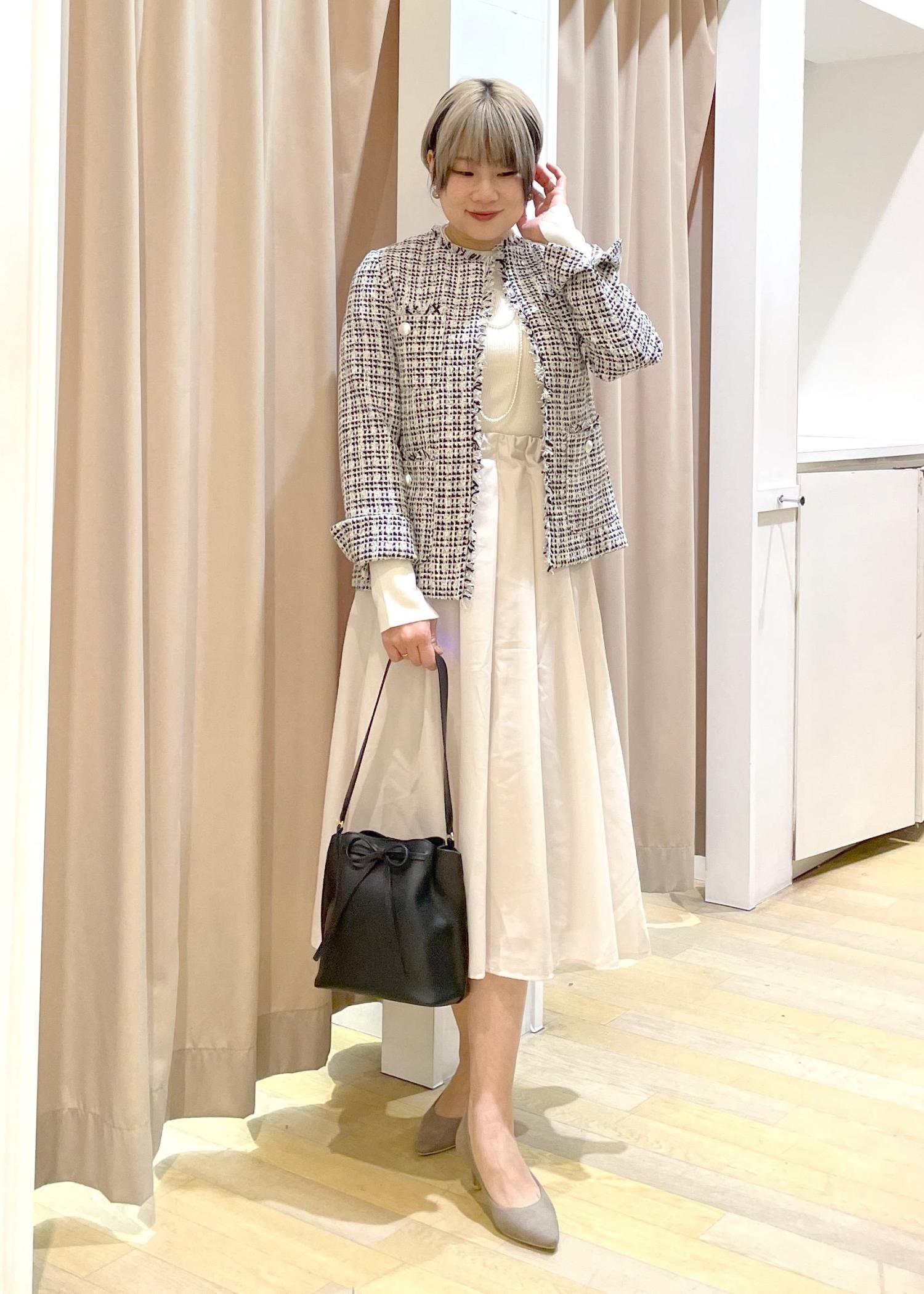 入学式やお仕事着にオススメな、定番ツイードジャケットのフェミニンコーデです。