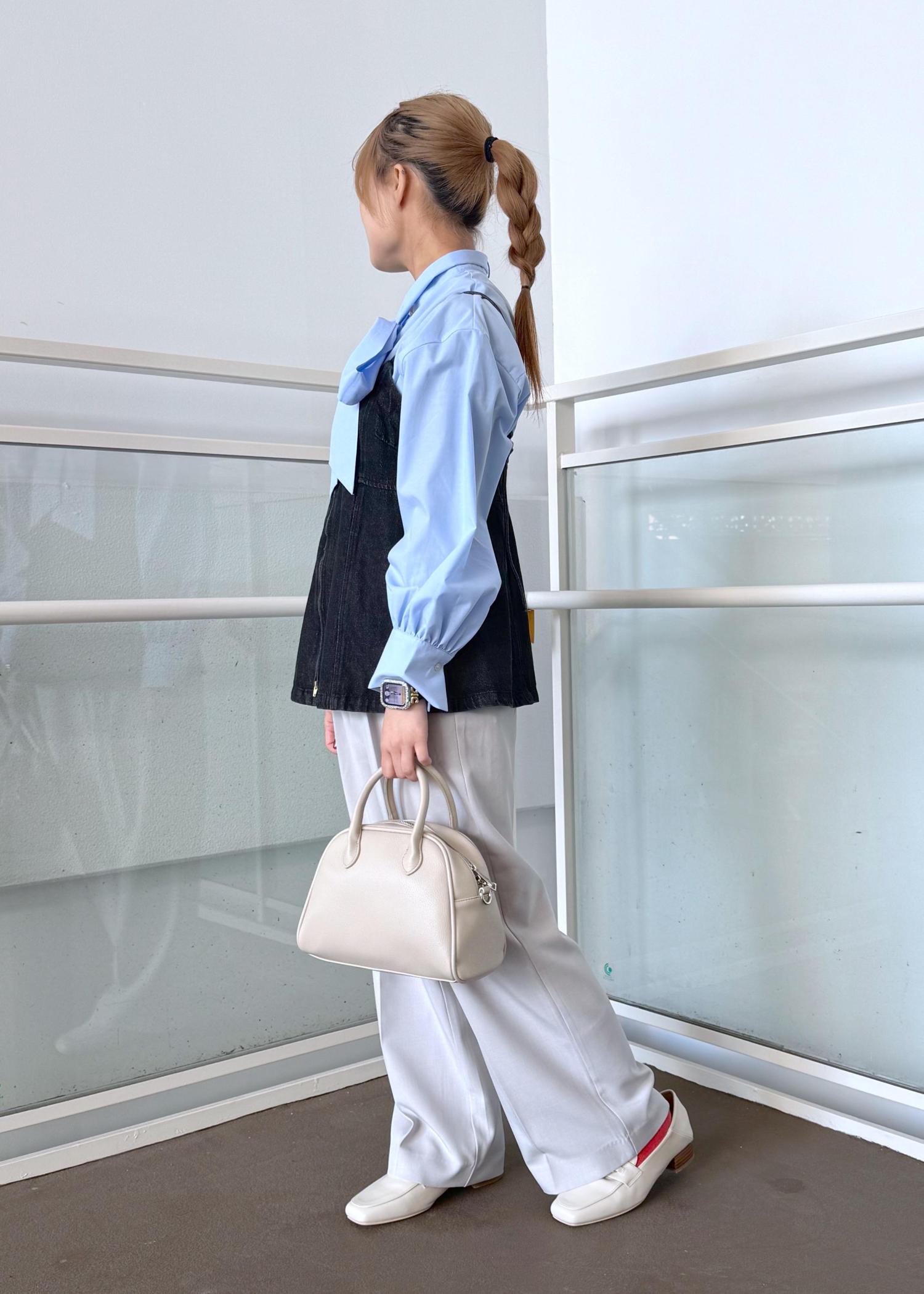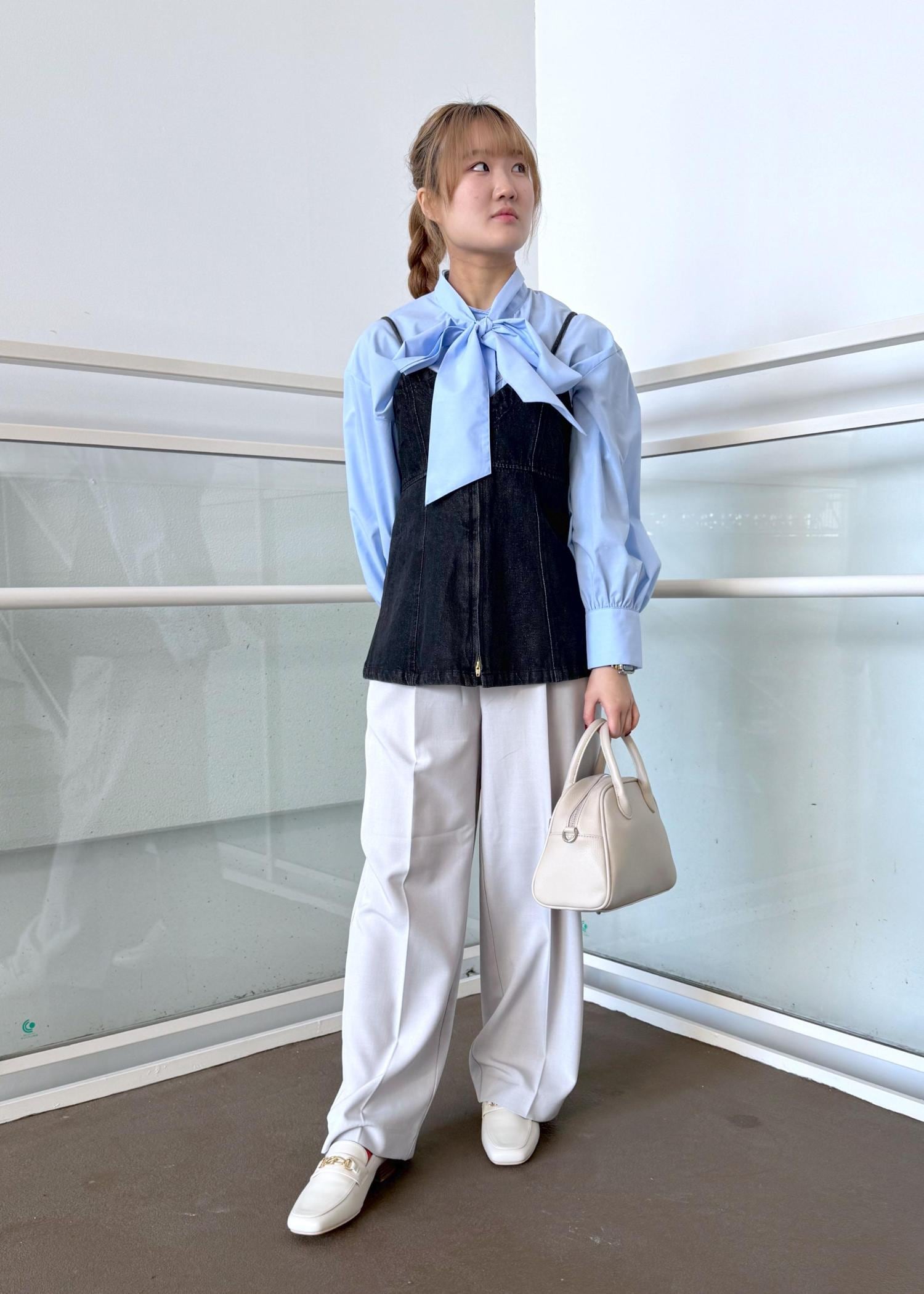 リボンブラウスとパンツで明るいカラーを使って、春らしいコーデを組んでみました!