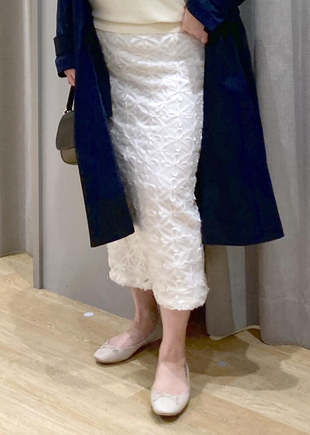 ネイビーでシックな印象ですが、インナーは春らしいイエローと、花モチーフのチュールスカートで軽やかにコーディネートしてみました。
