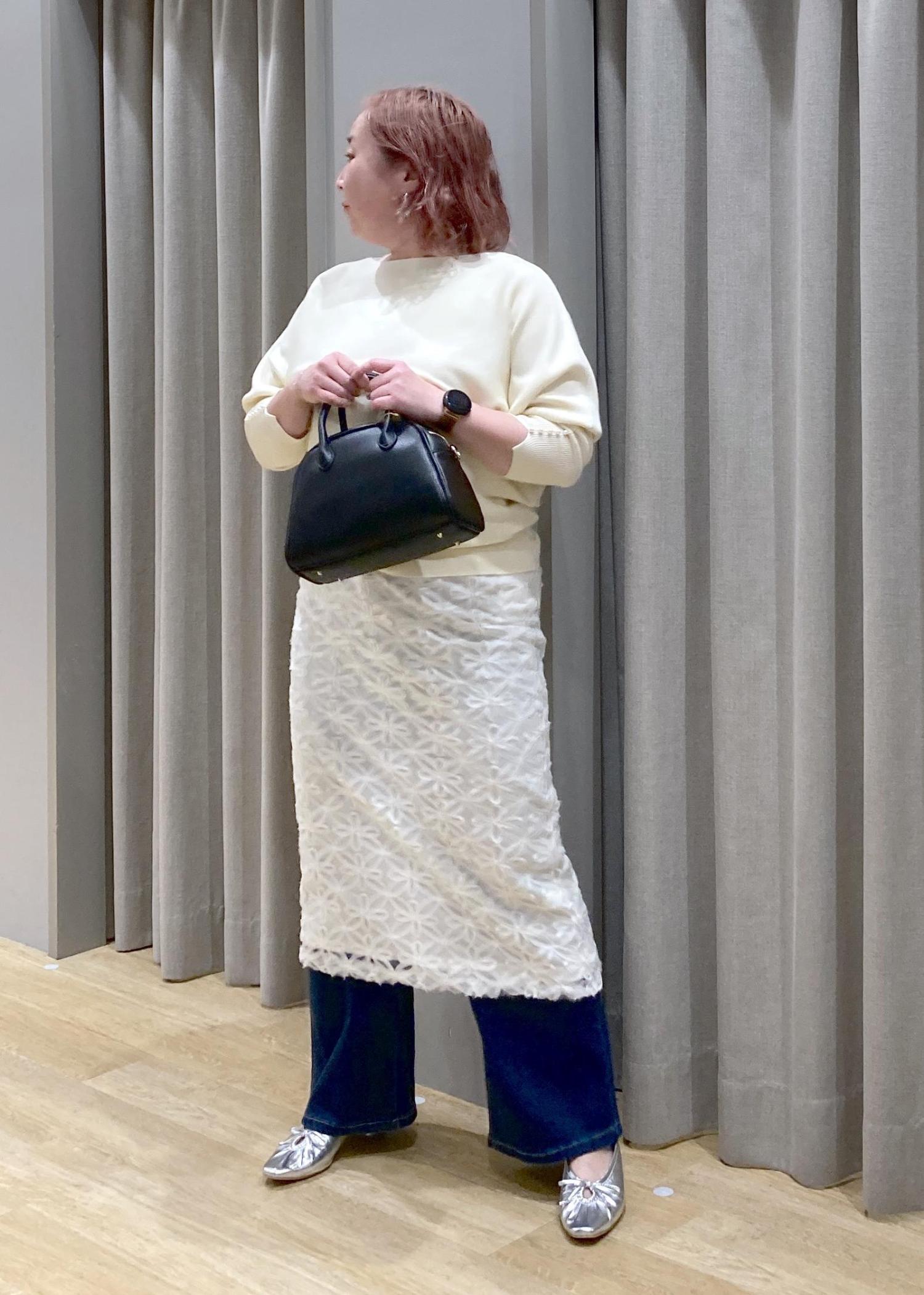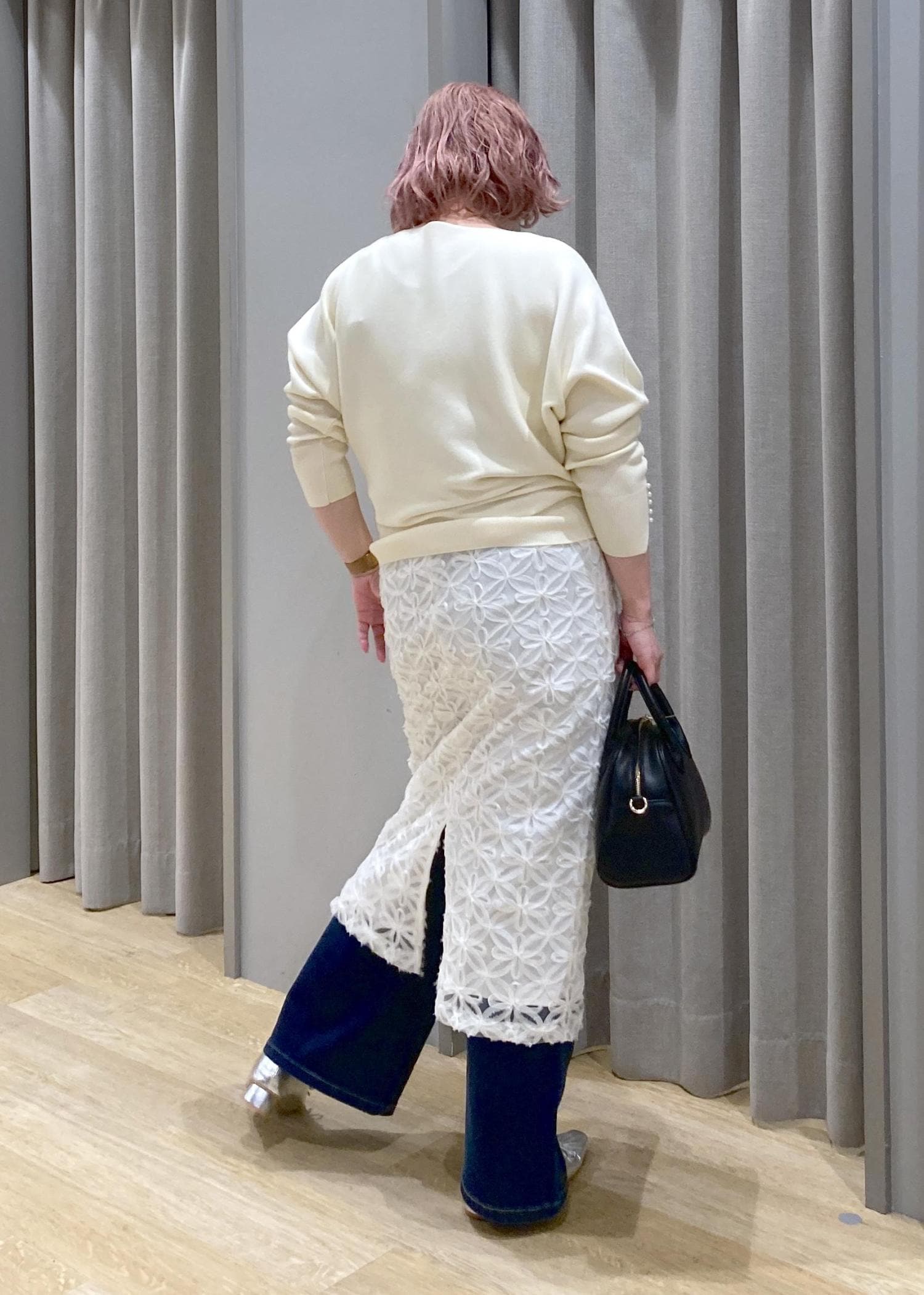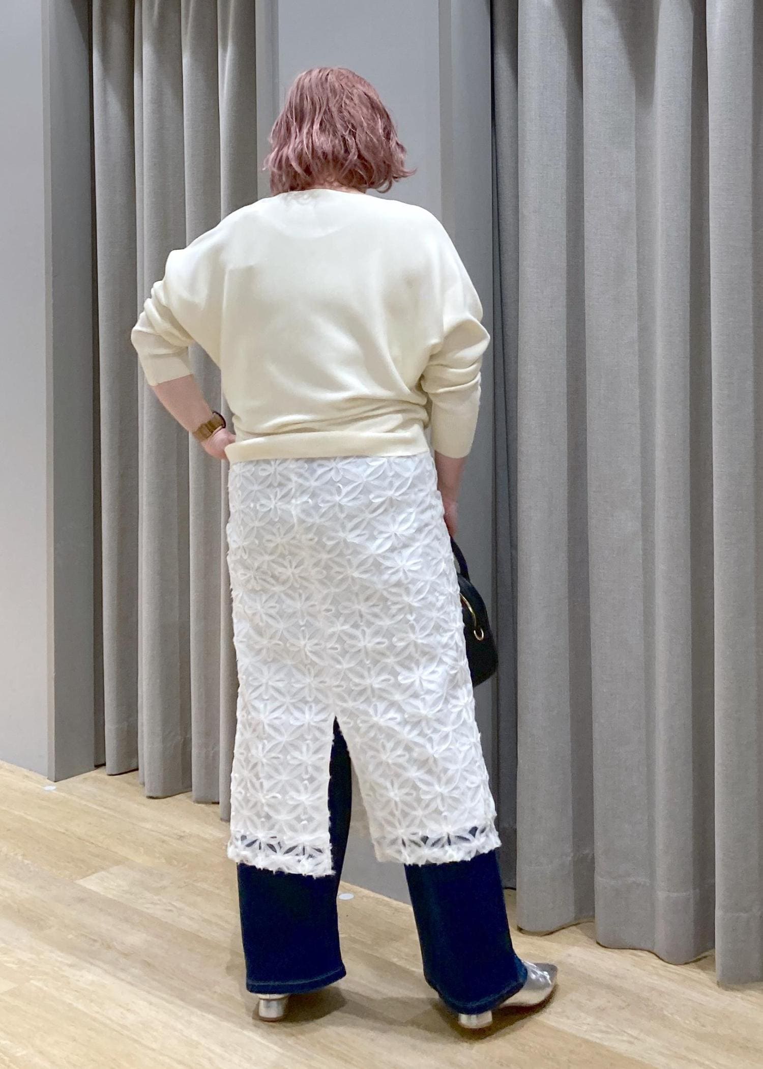 に合わせて、シンプルにデニムでもかっこいいのですが、今期トレンドのレイヤードスタイリングで、チュールのスカートをデニムに合わせれば、体型カバーしながらオシャレ見せ間違いなしです