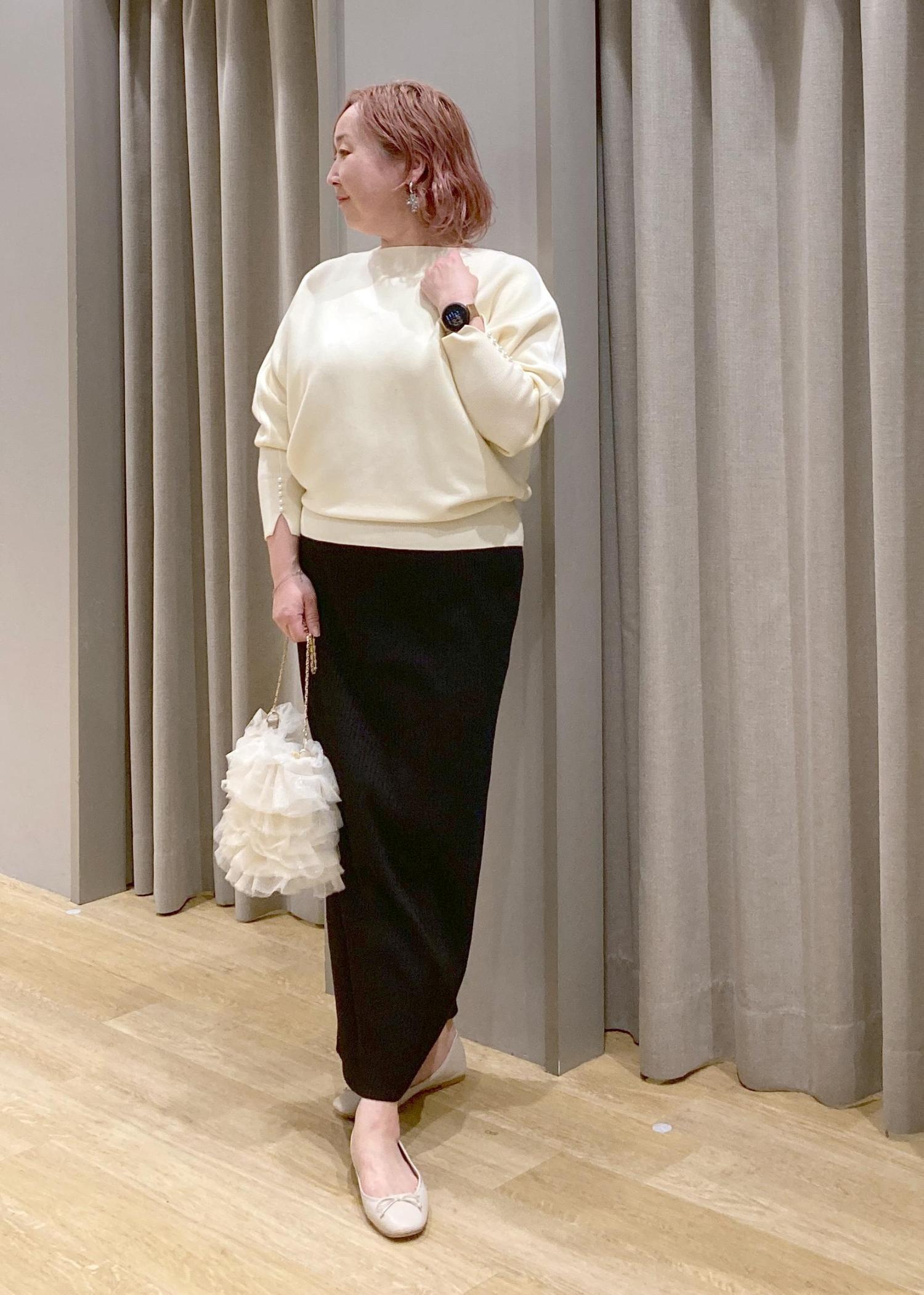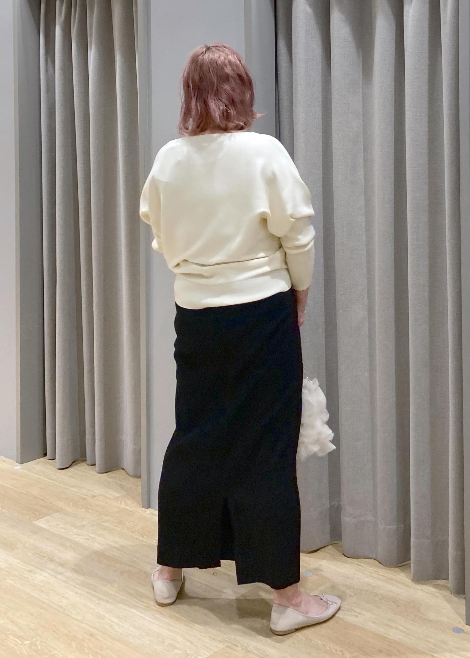 ぽっこりお腹をカバーするようにインしないで着れるドルマンニットに、より細見えしたい私は、縦リブのタイトスカートをプラスしてコーディネートしてみました。