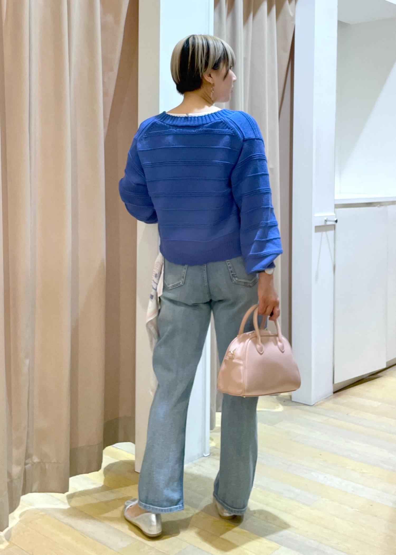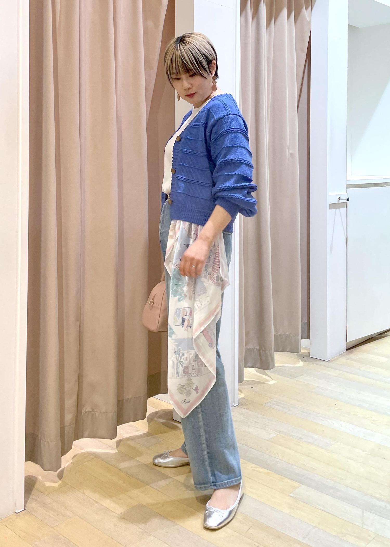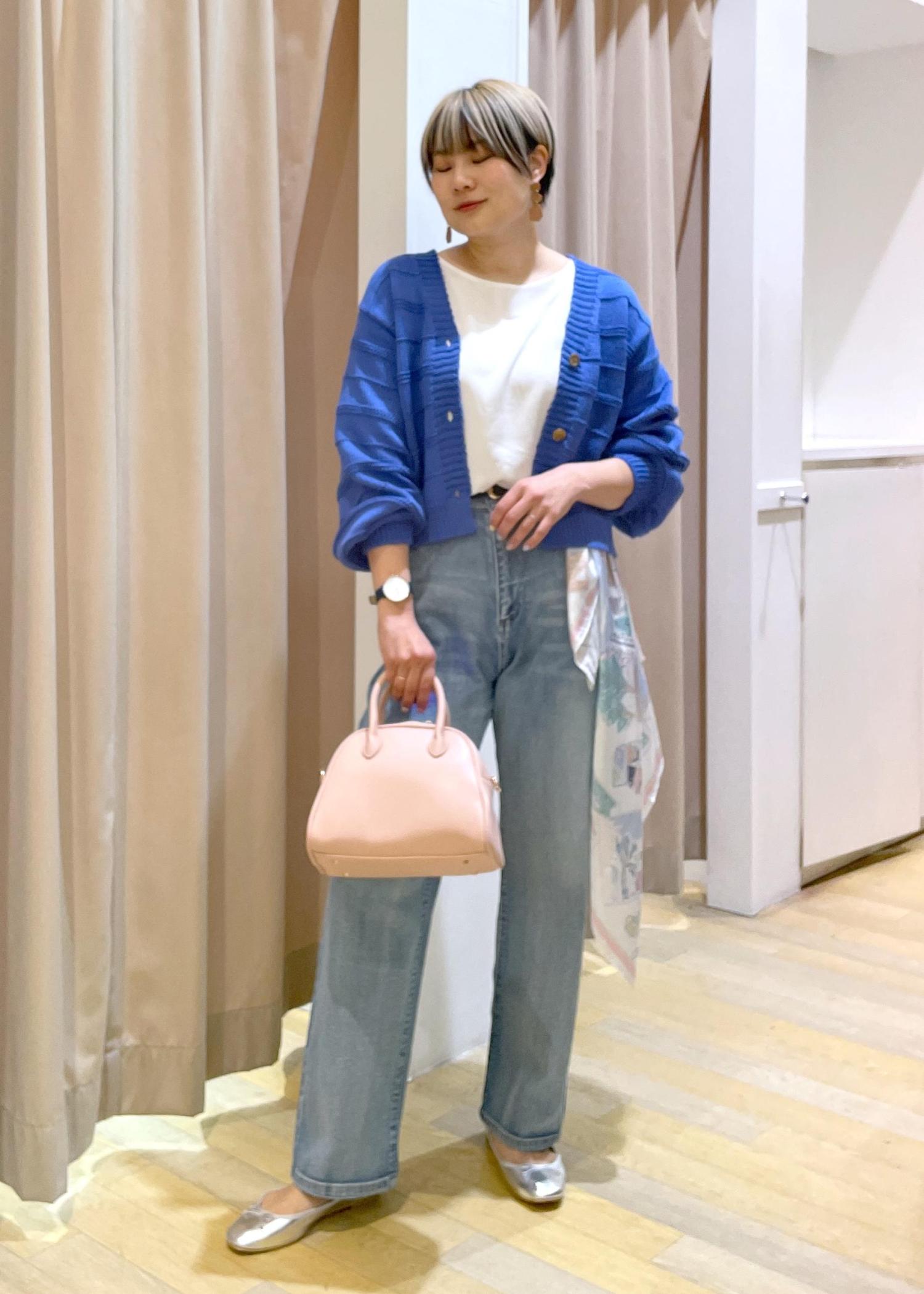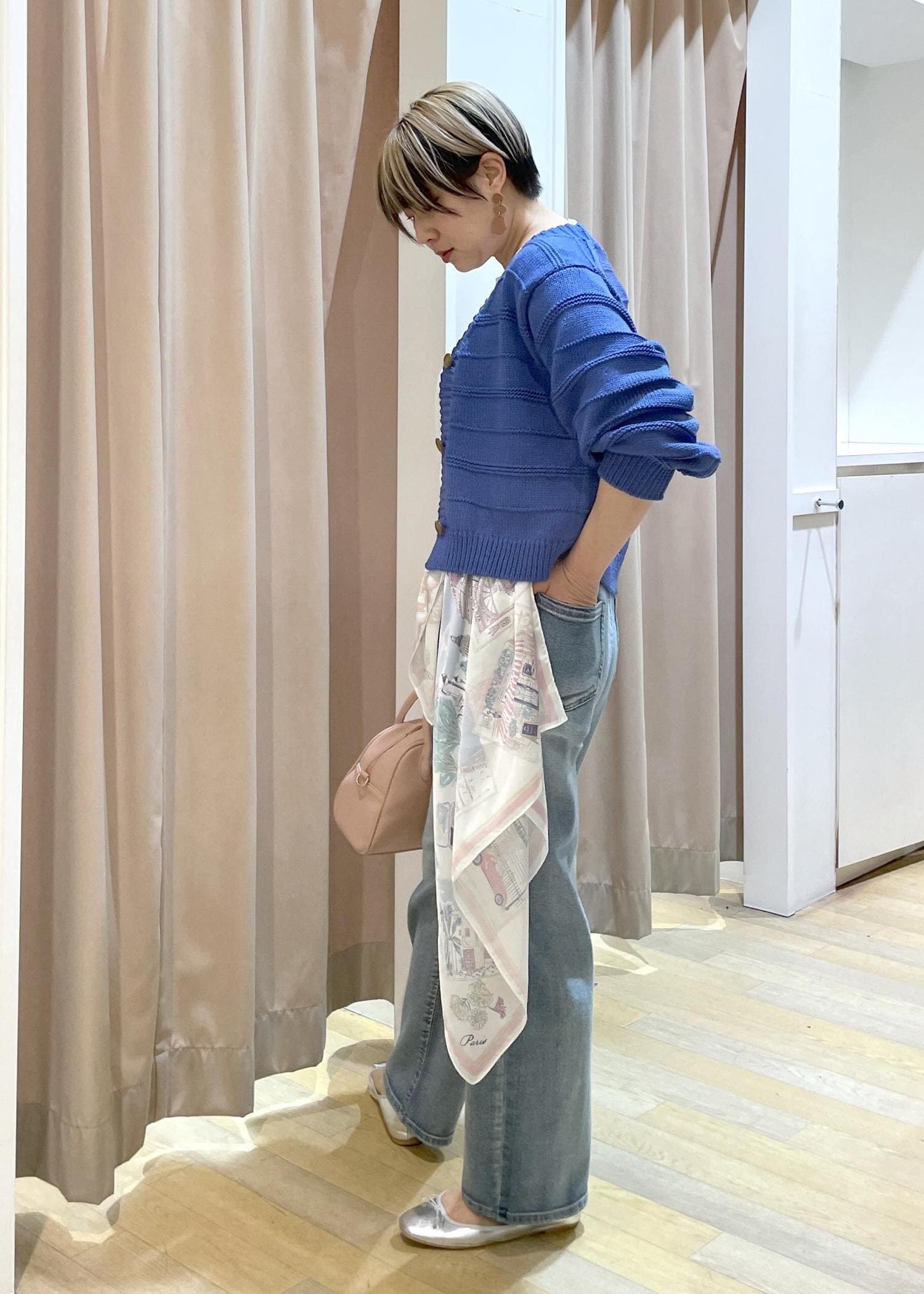 カーディガンは、ゆったりとしたシルエットですが、着丈がやや短いので、ボトムを選ばず着用でします◯