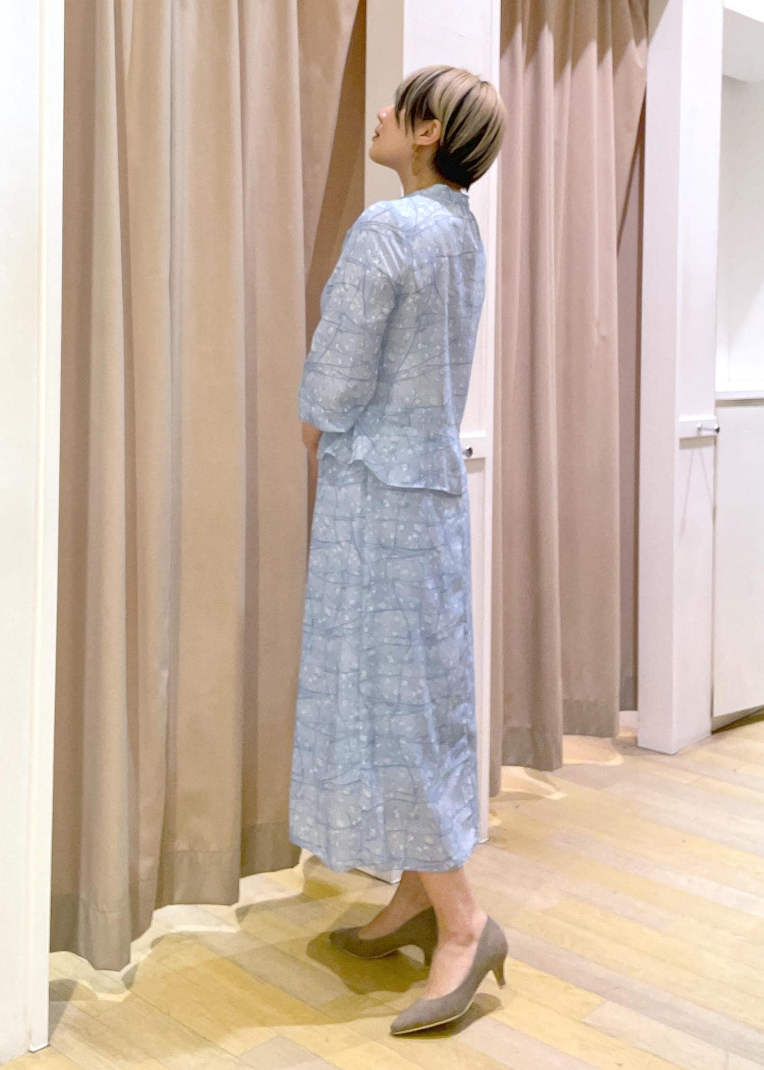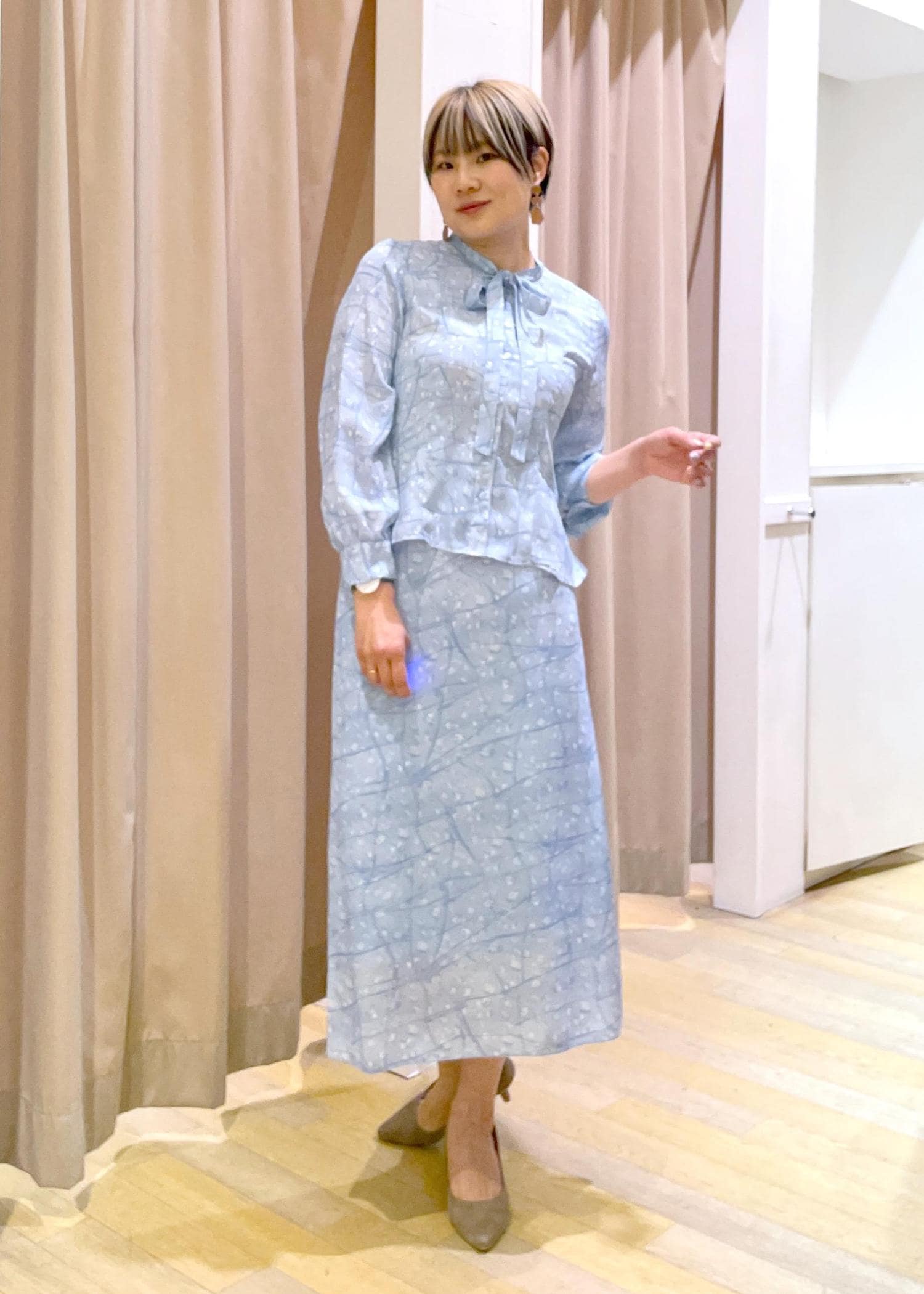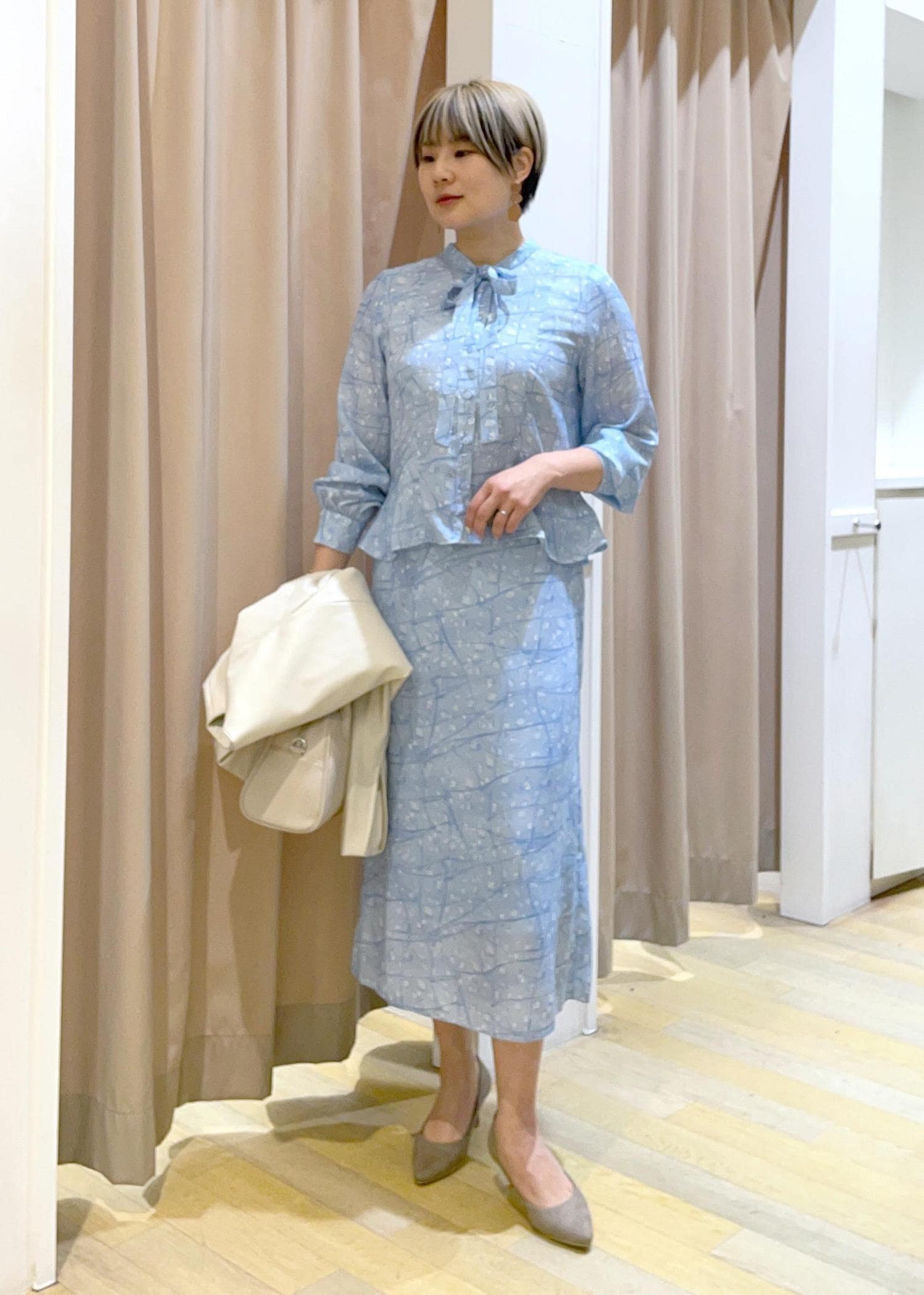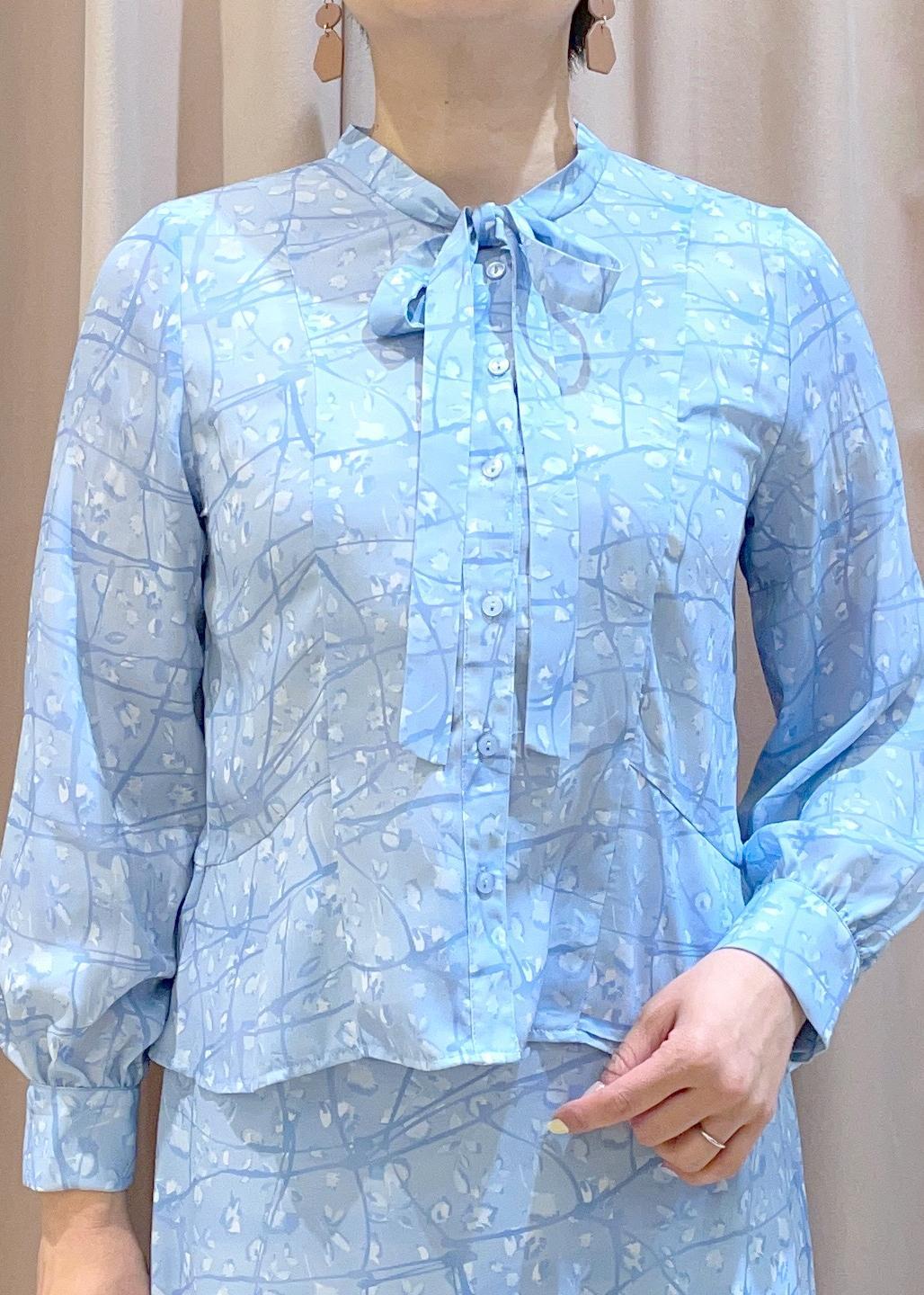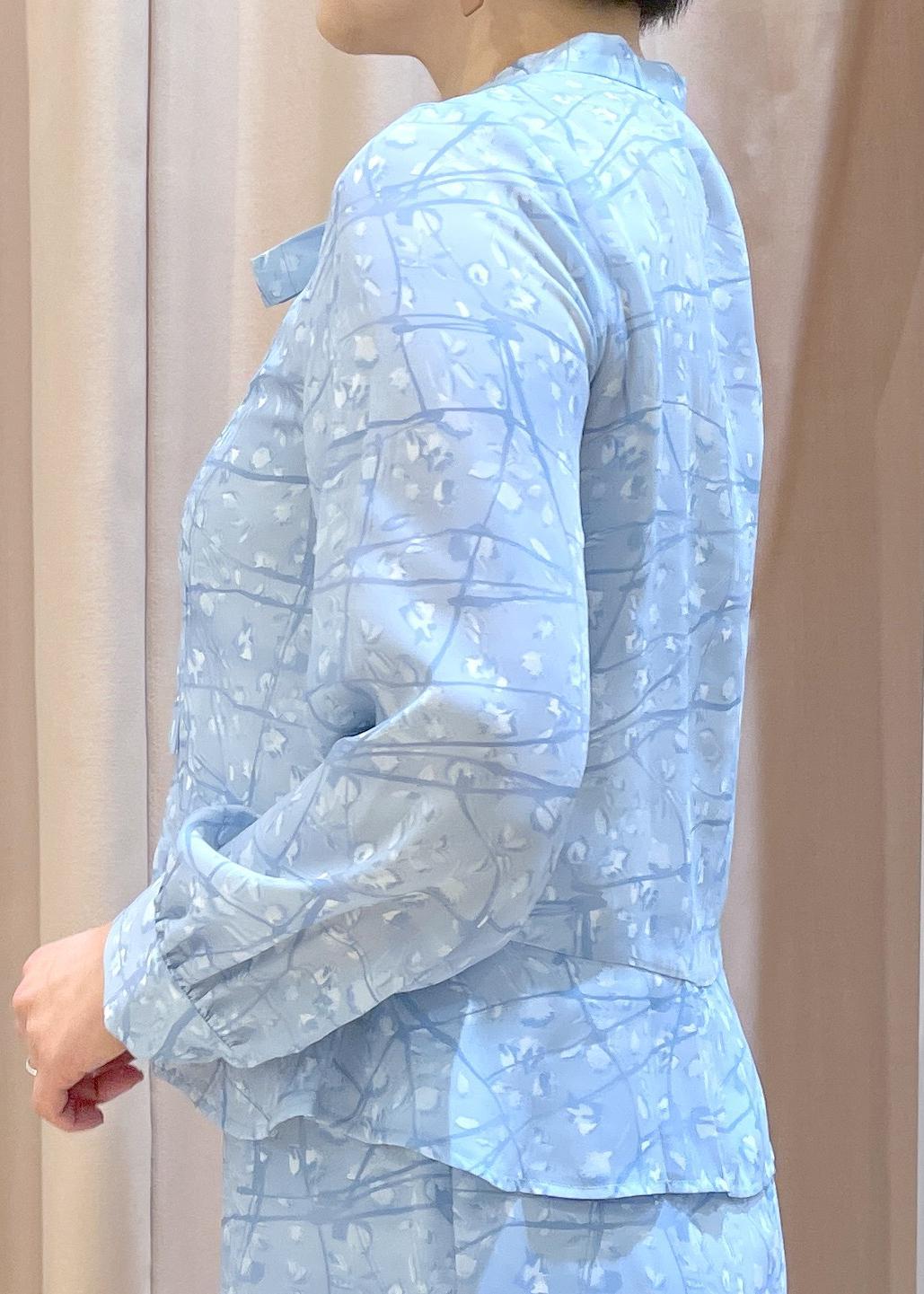 首元のさりげないリボンや、柄など華やかさもありつつ細見えが叶うセットアップは、単体でも着回せる万能アイテムです!
