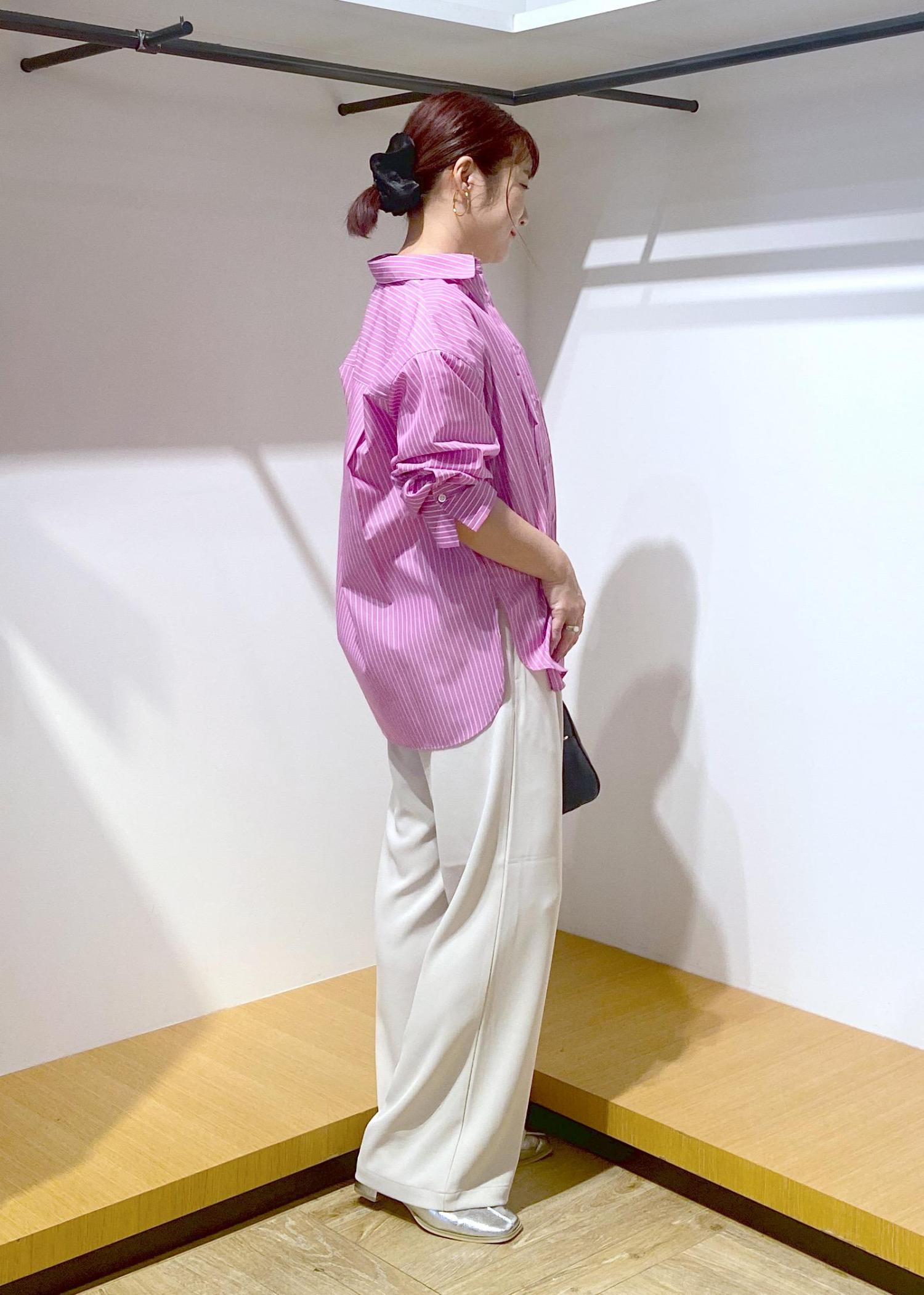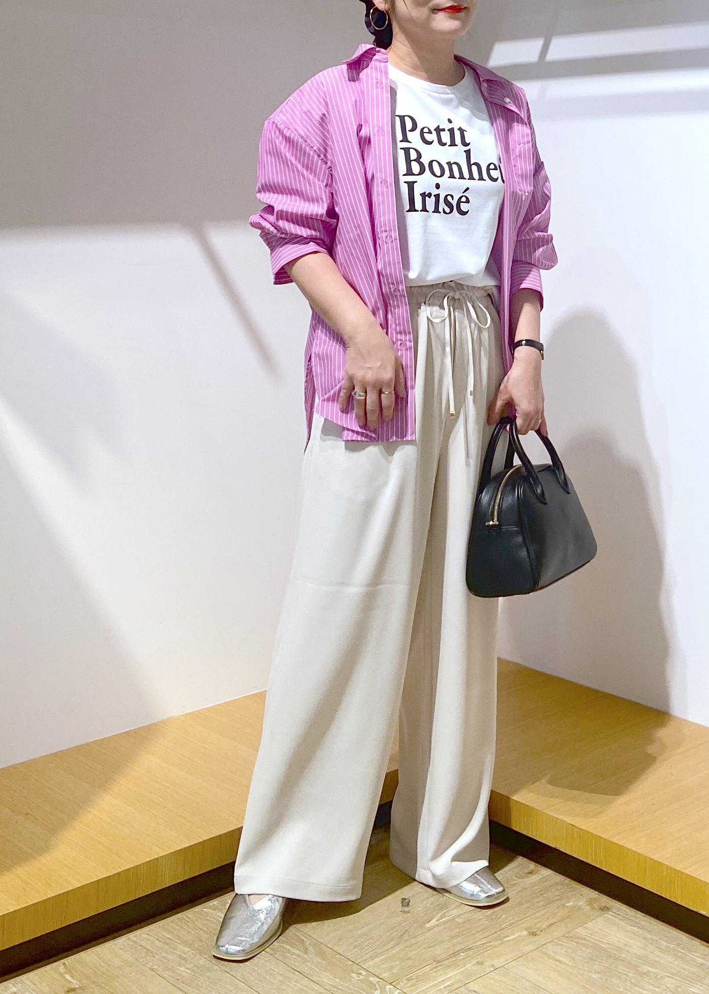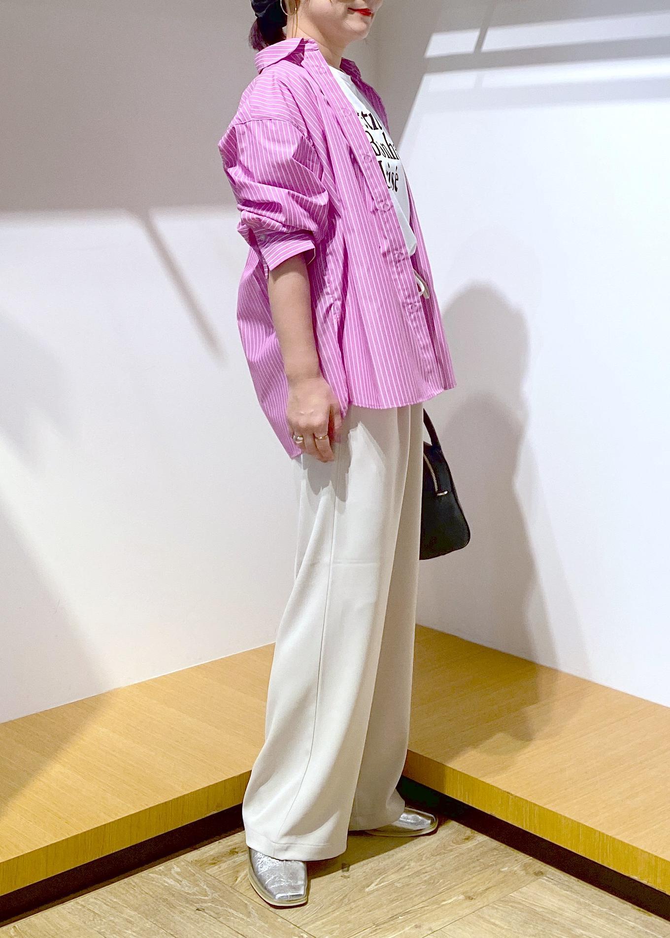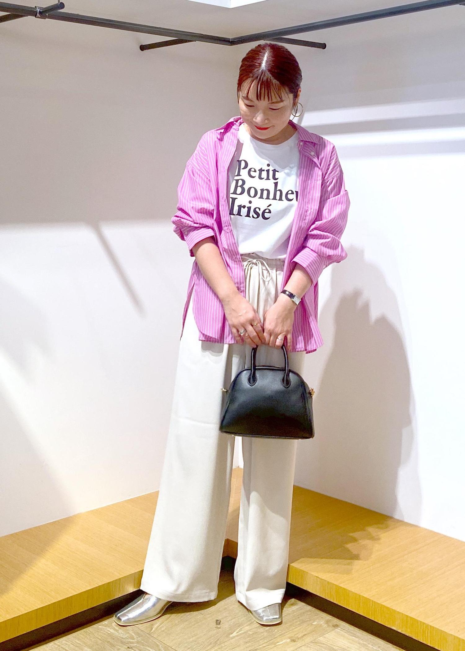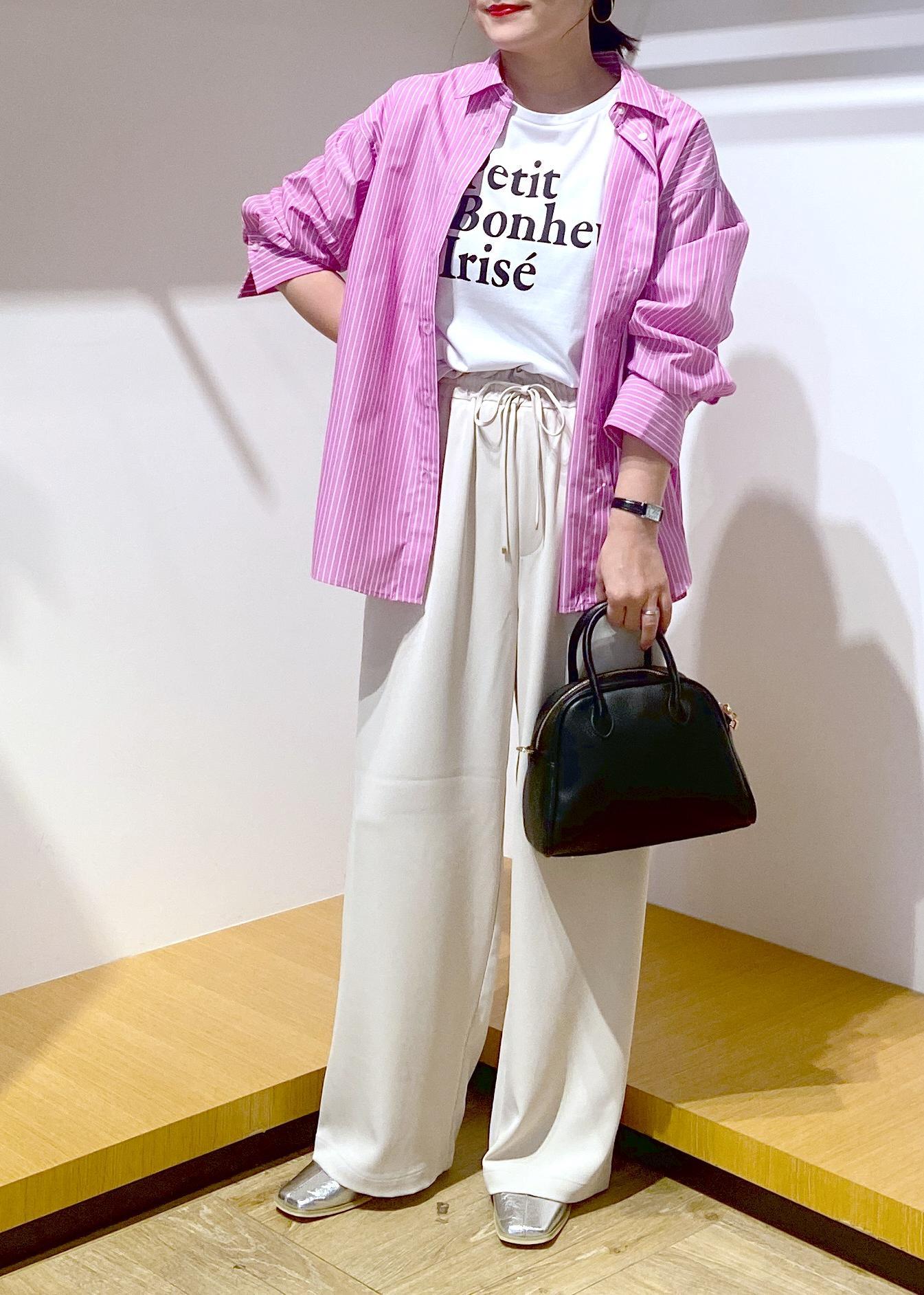 ピンクとホワイトのみでスタイリングしていますが、Tシャツのロゴとバッグをブラックで合わせ、淡いトーンのコーデを少し引き締めたところがポイントです‼︎☺︎