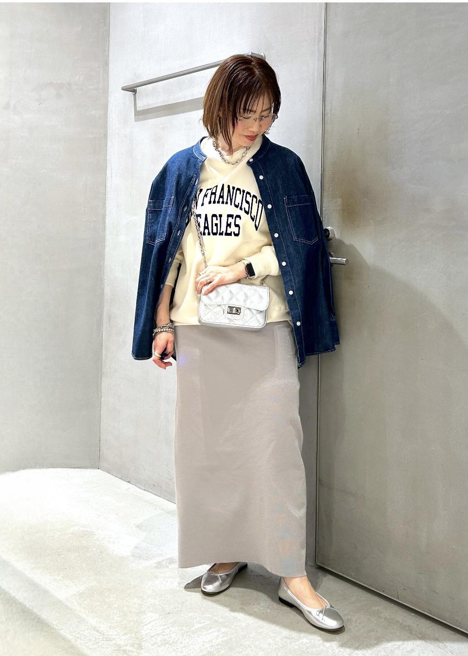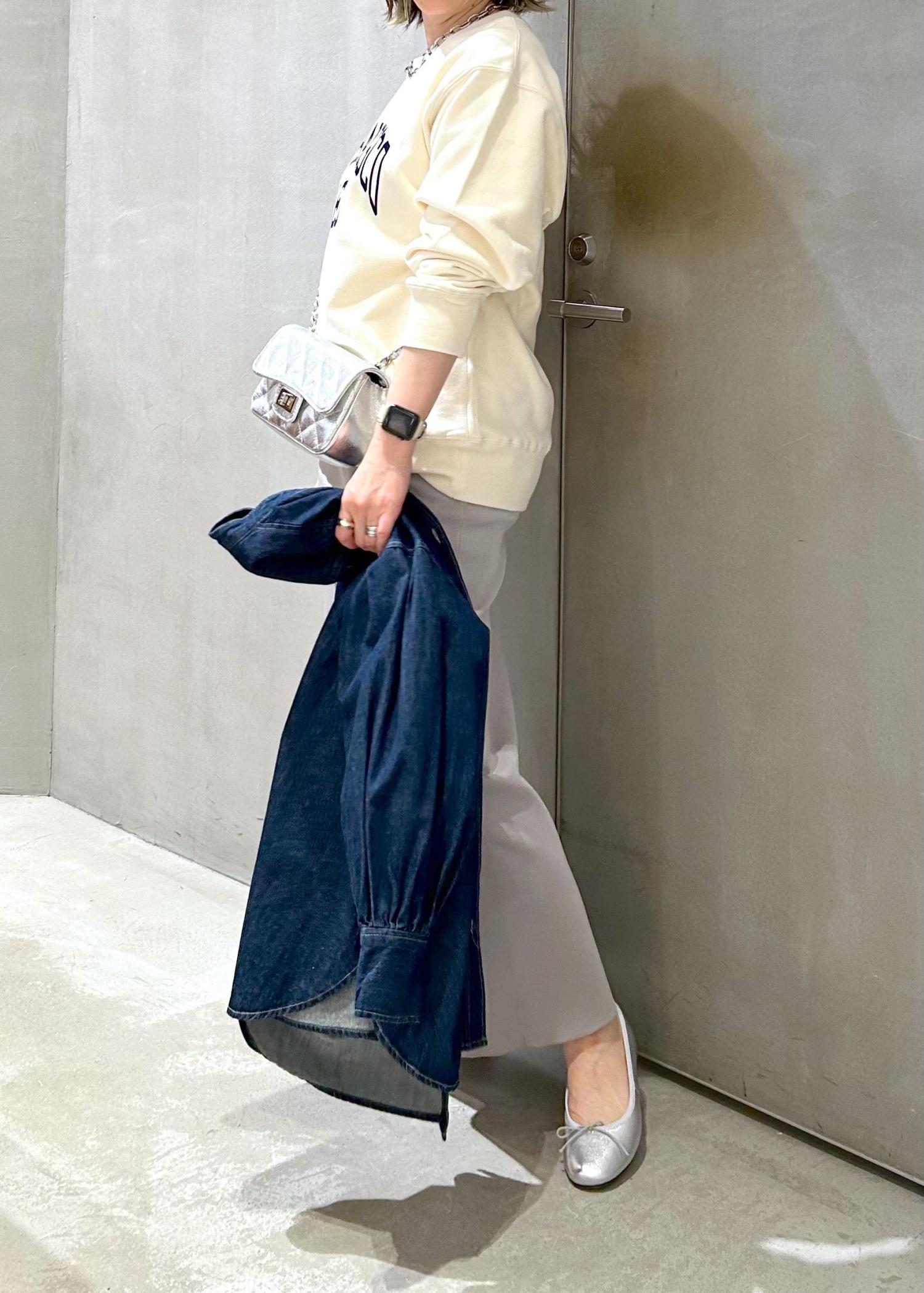 スウェットをキレイめスカートと合わせて、ちょっと肌寒い春先にぴったりなコーディネートにまとめました。