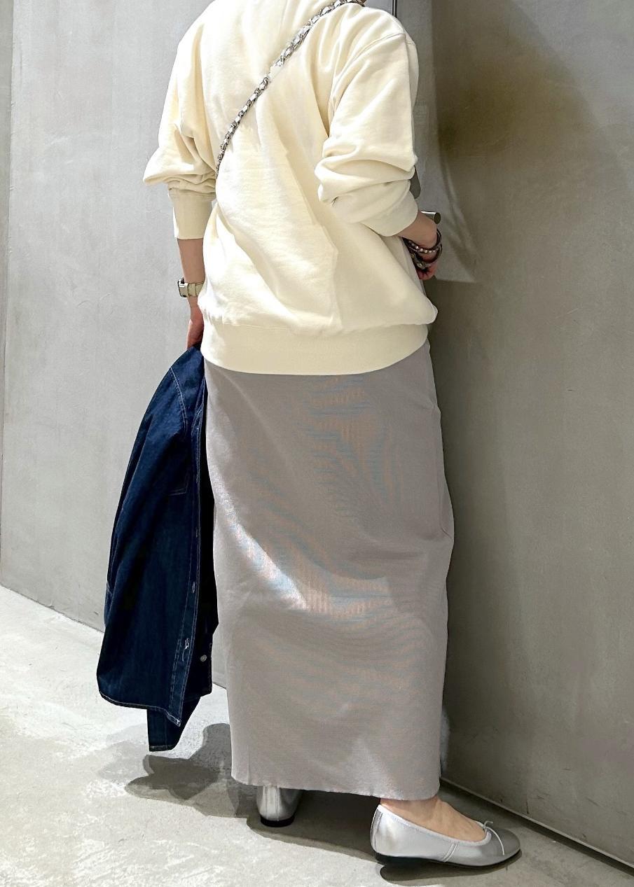 ボトムには、シルバーのラメニットスカートを合わせる事で、カジュアル過ぎないスタイリングになります。