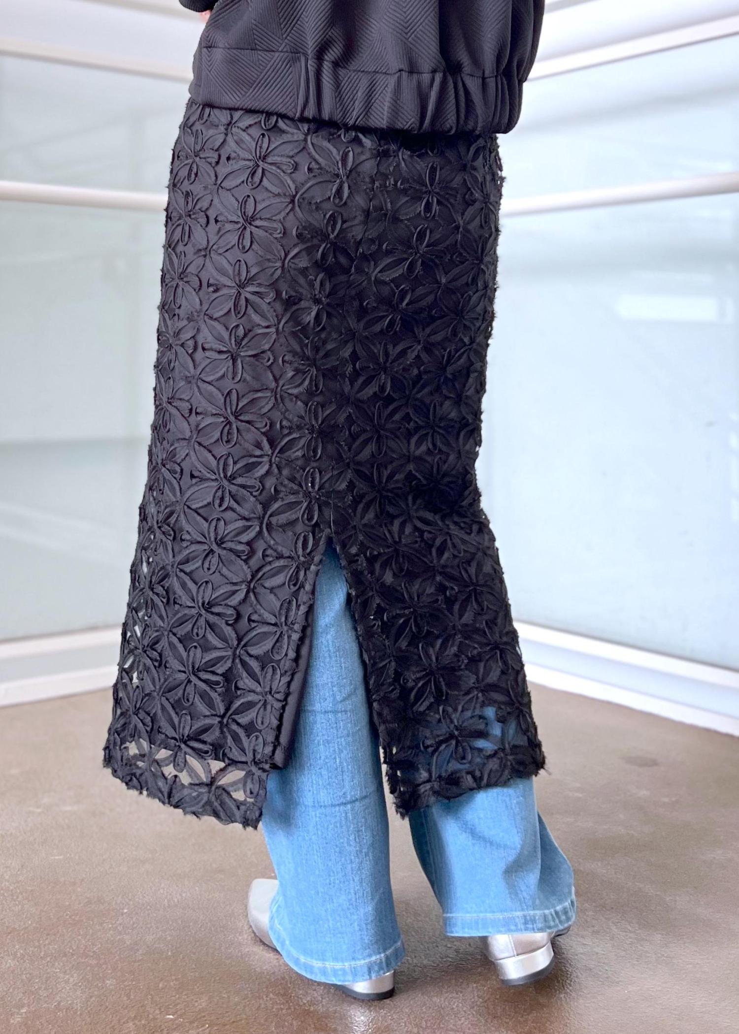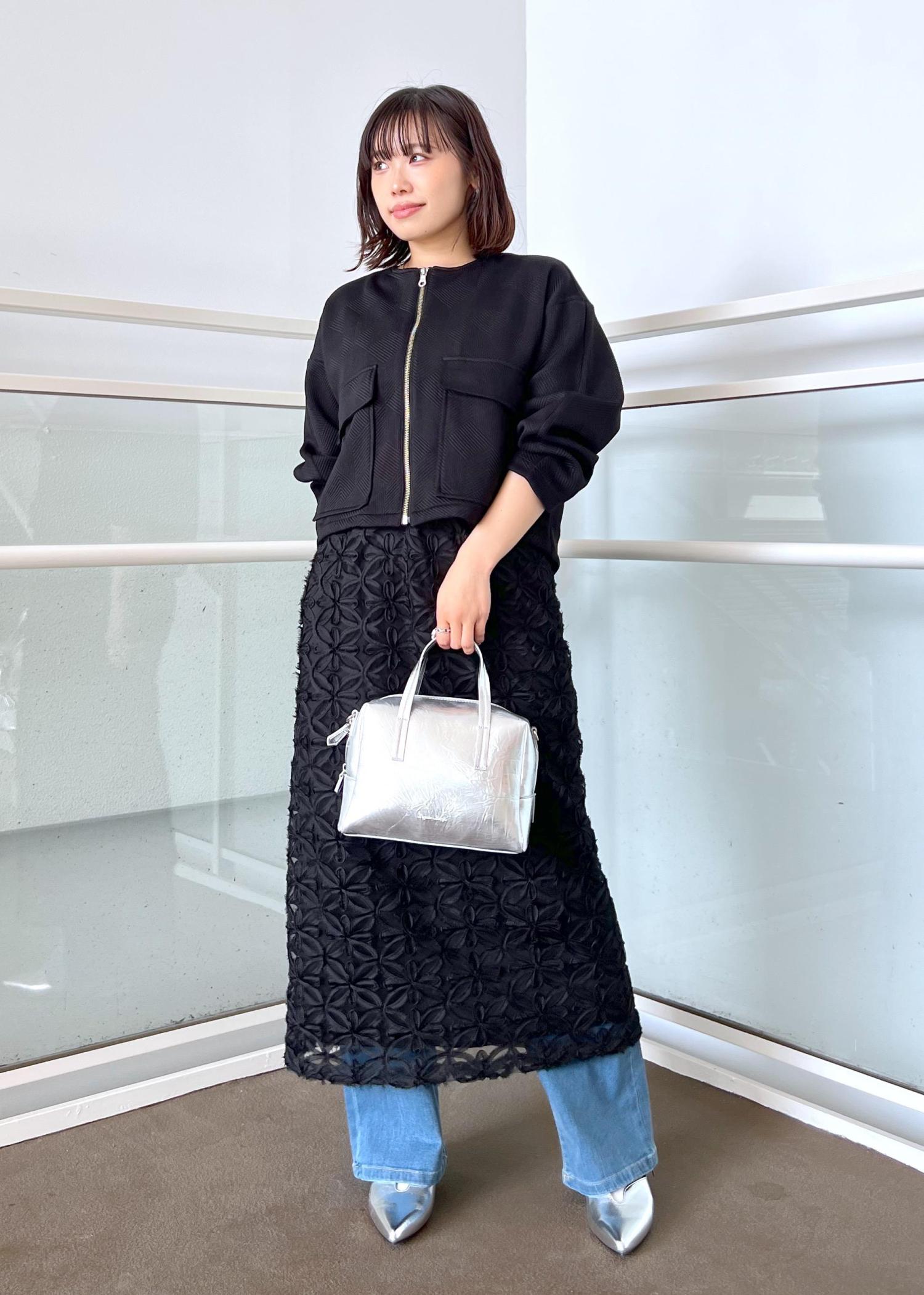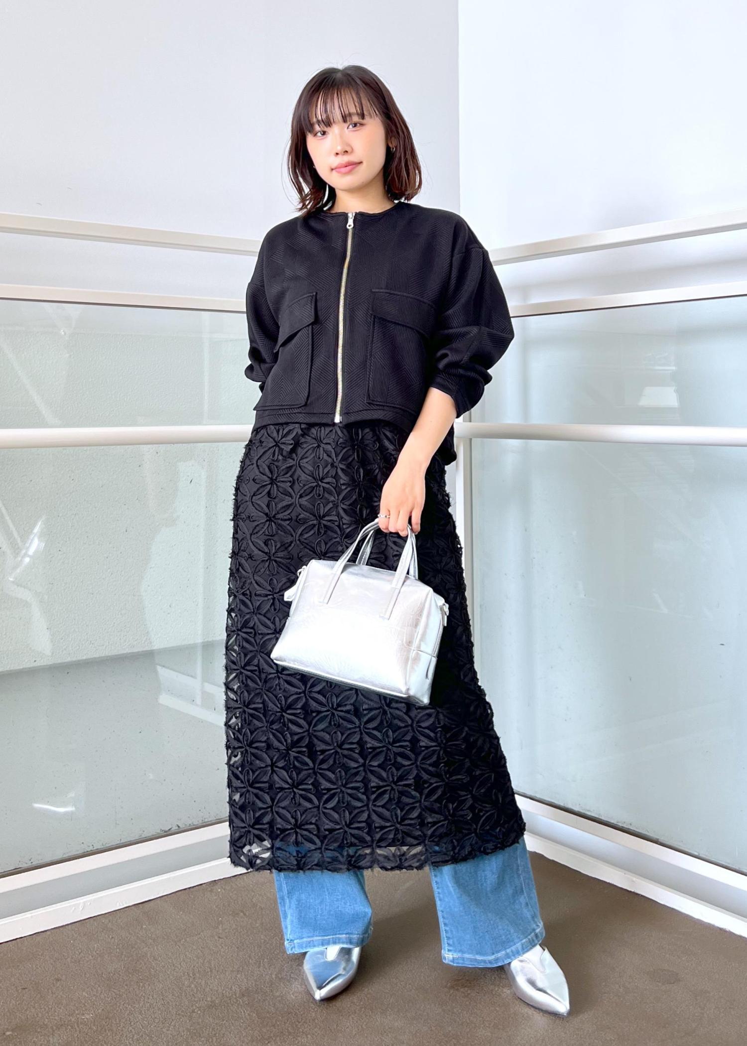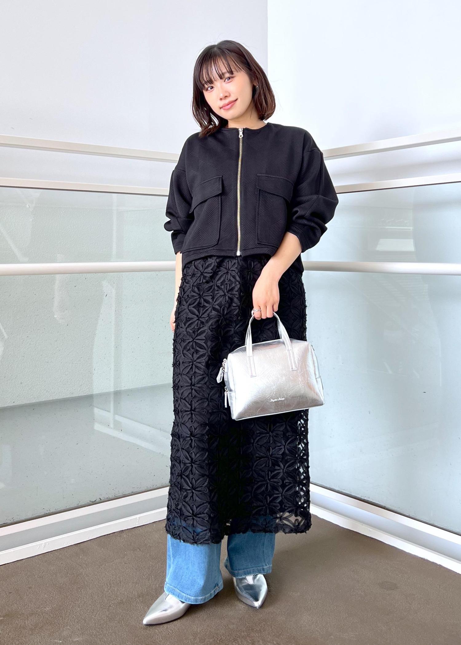 全体的にブラックでまとめ大人カジュアルでコーデを組みました。あえてスカートをデニムパンツと合わせることで今風のスタイルで合わせられるのもポイントです!