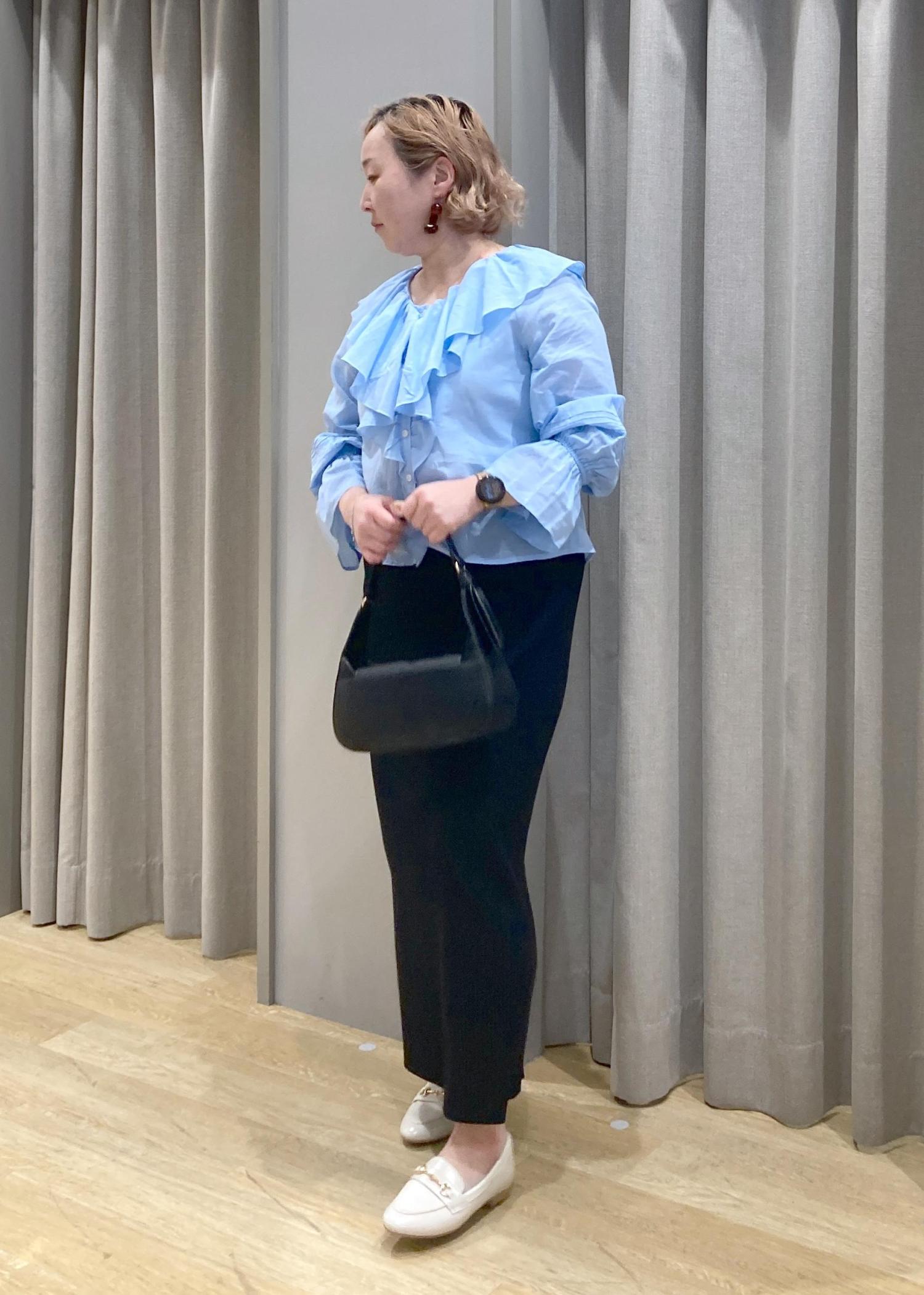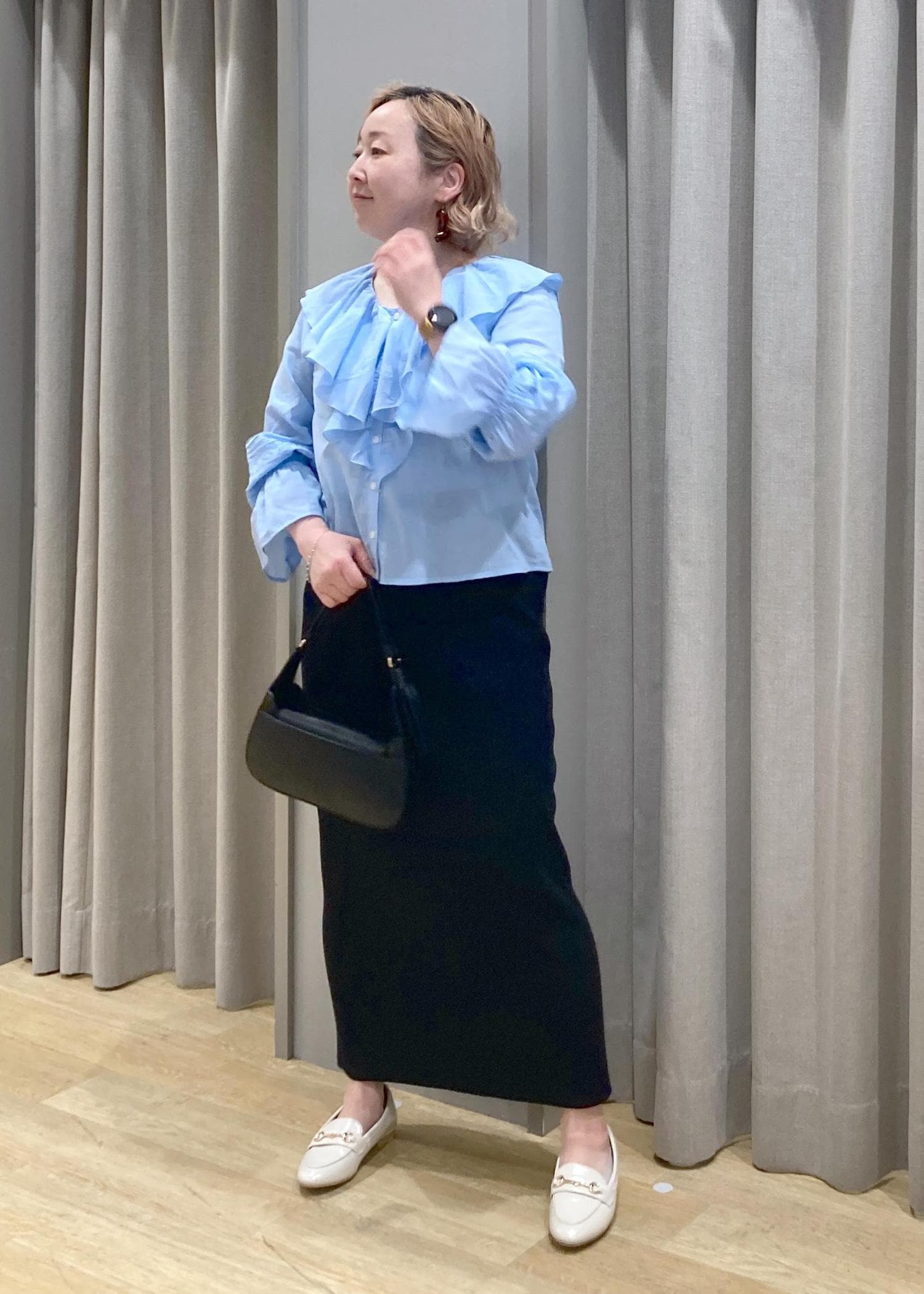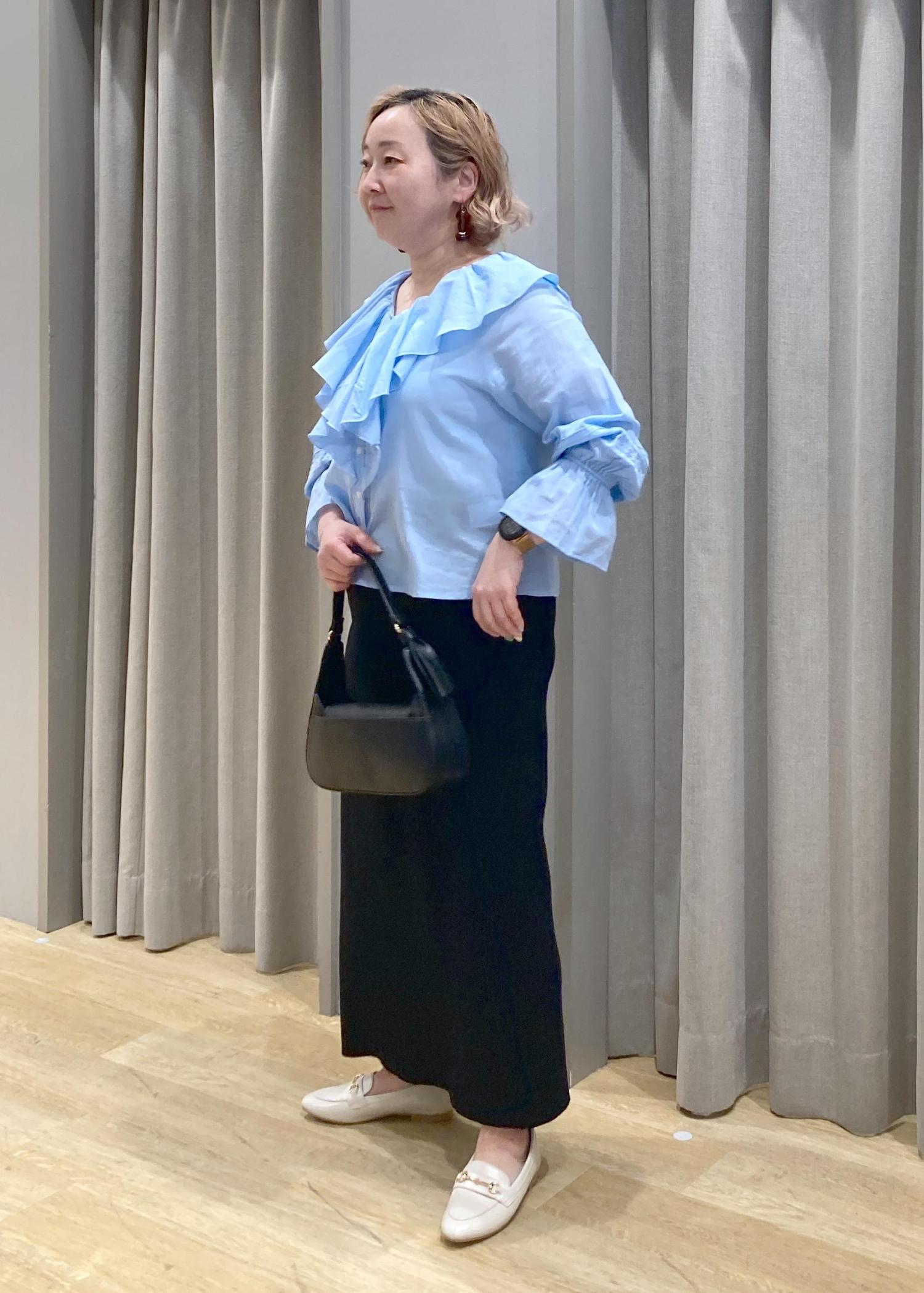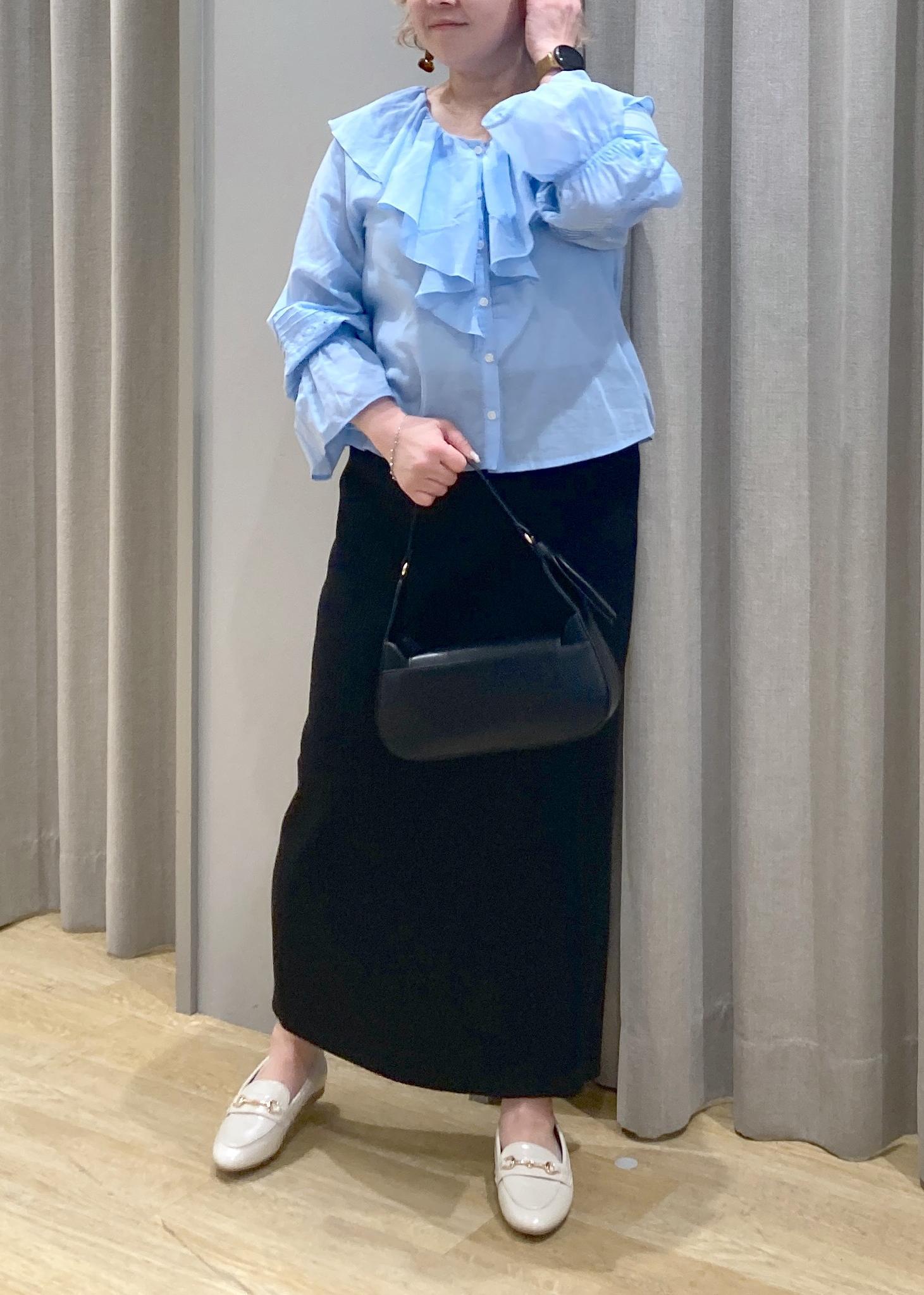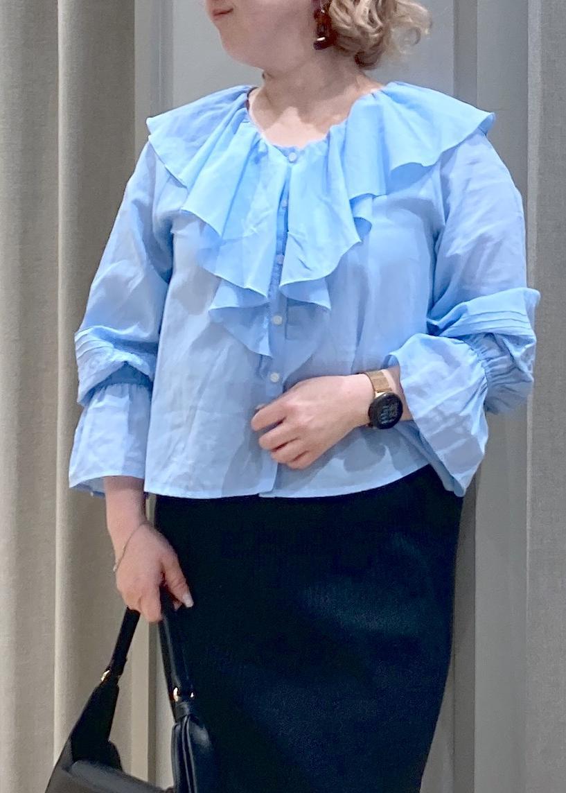 ライトブルーのフリルブラウスが柔らかくフェミニンな雰囲気を演出し、顔周りを明るく見せてくれています。