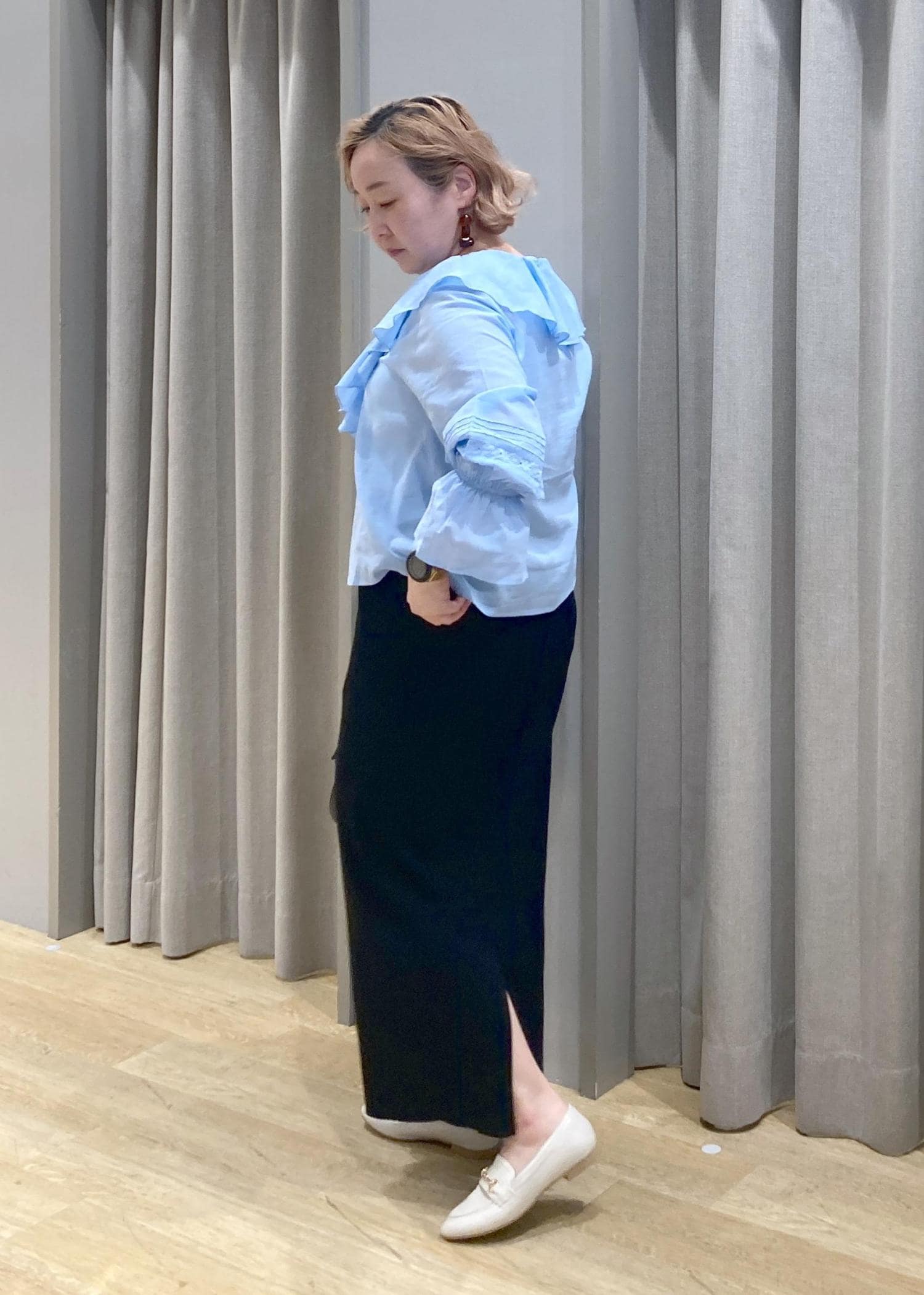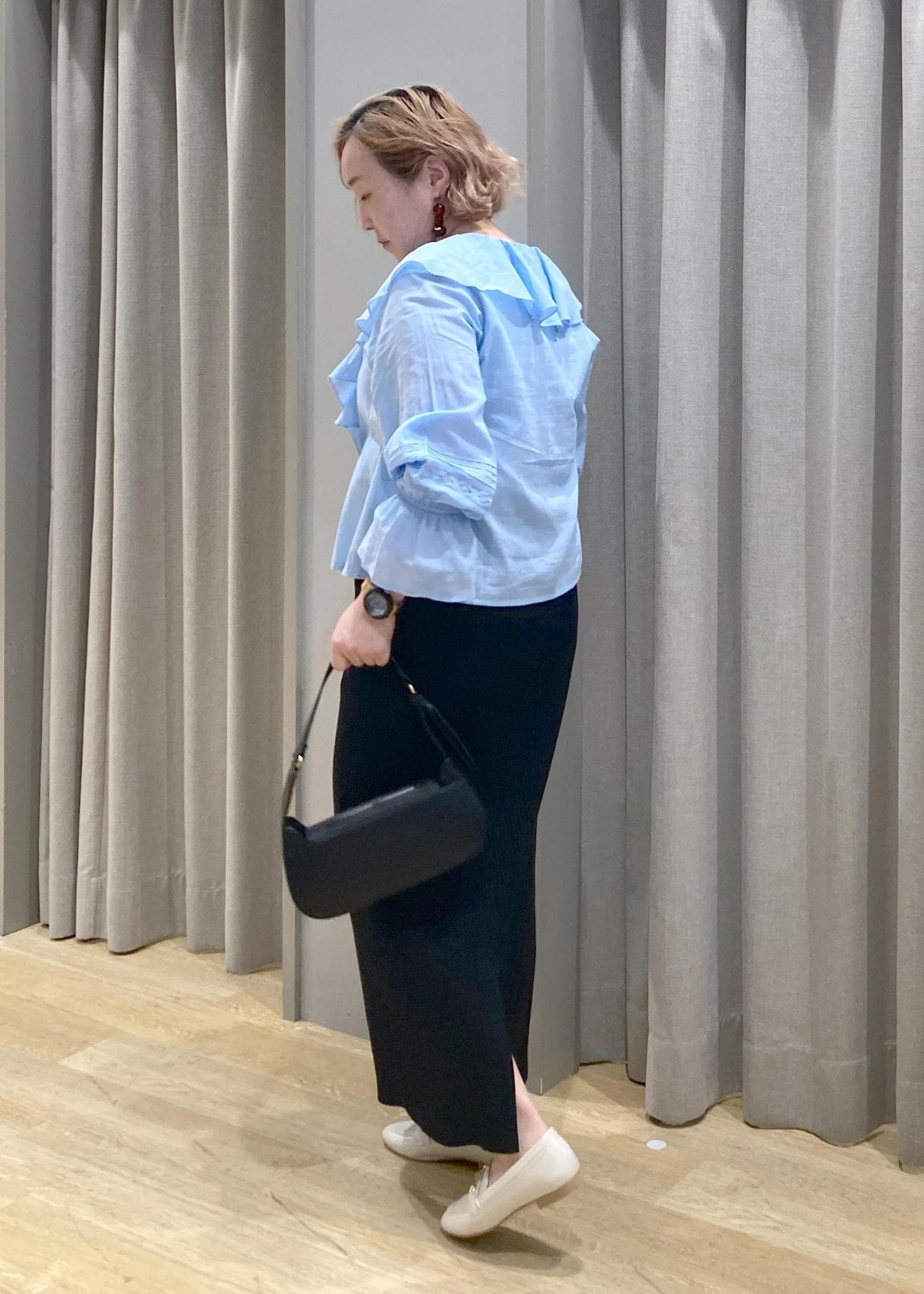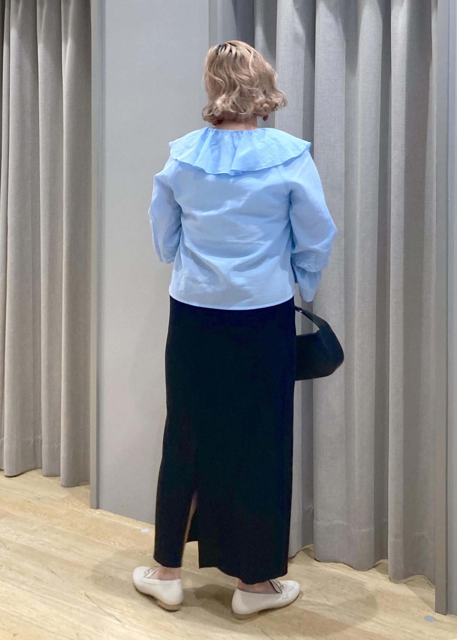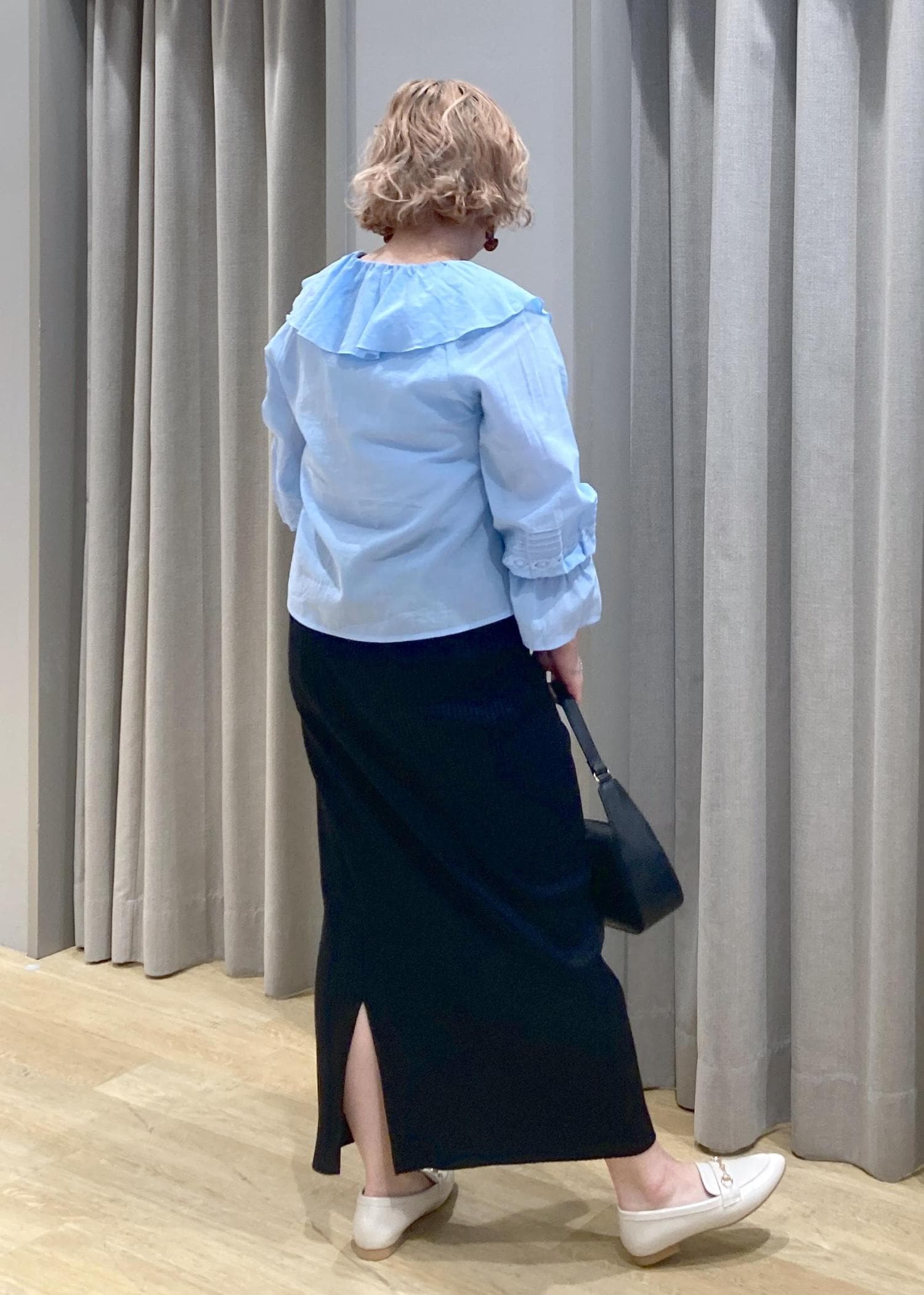 ライトブルーのフリルブラウスが柔らかくフェミニンな雰囲気を演出し、顔周りを明るく見せてくれています。