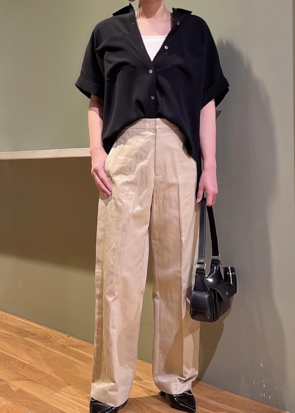 シンプルにシャツ×パンツのカジュアルコーデですが、リラックス感を出すためフロントボタンを開けて背抜きでラフに着てみました。