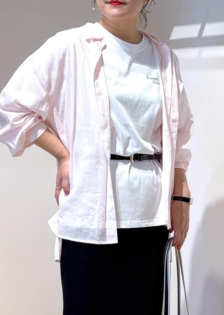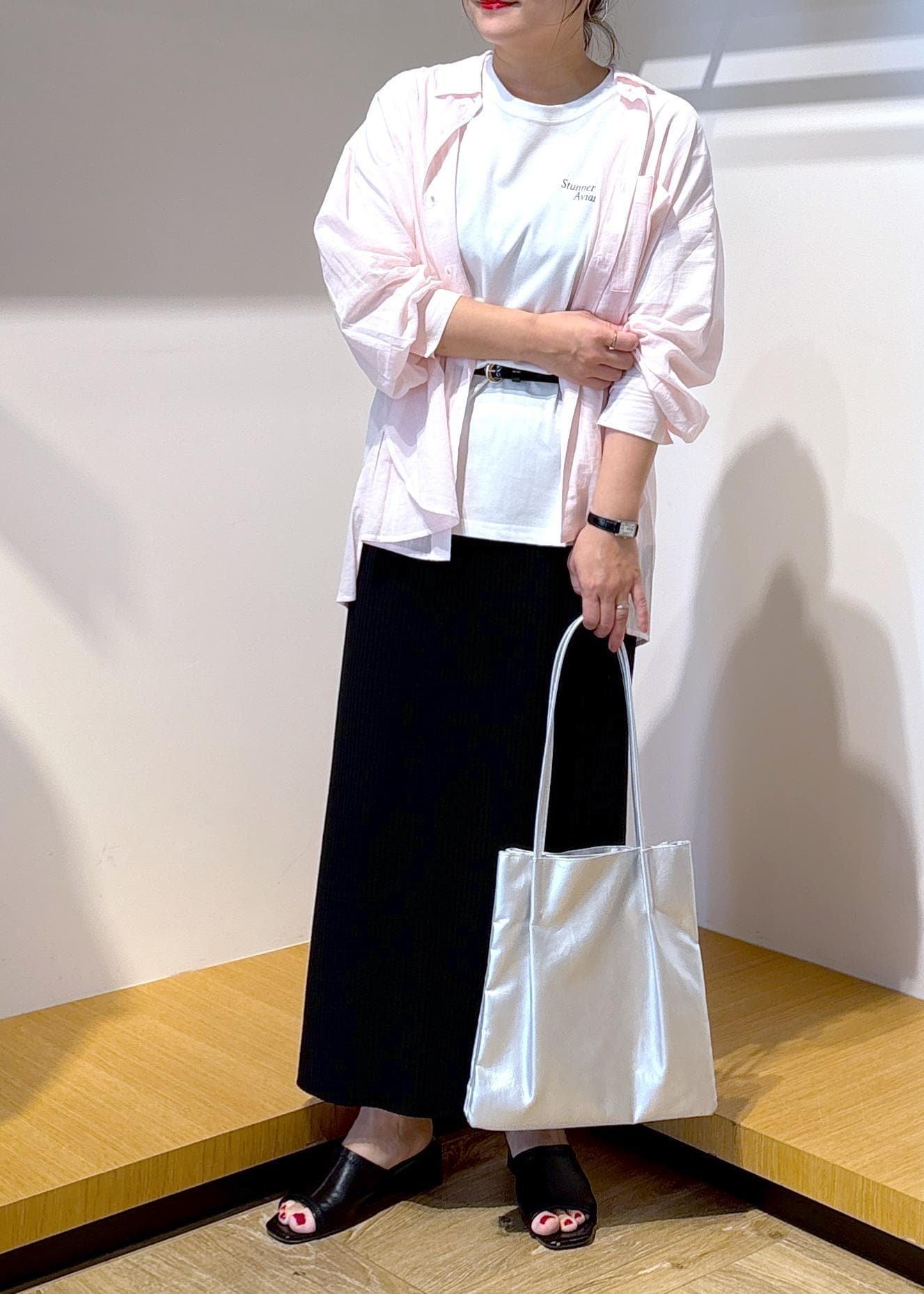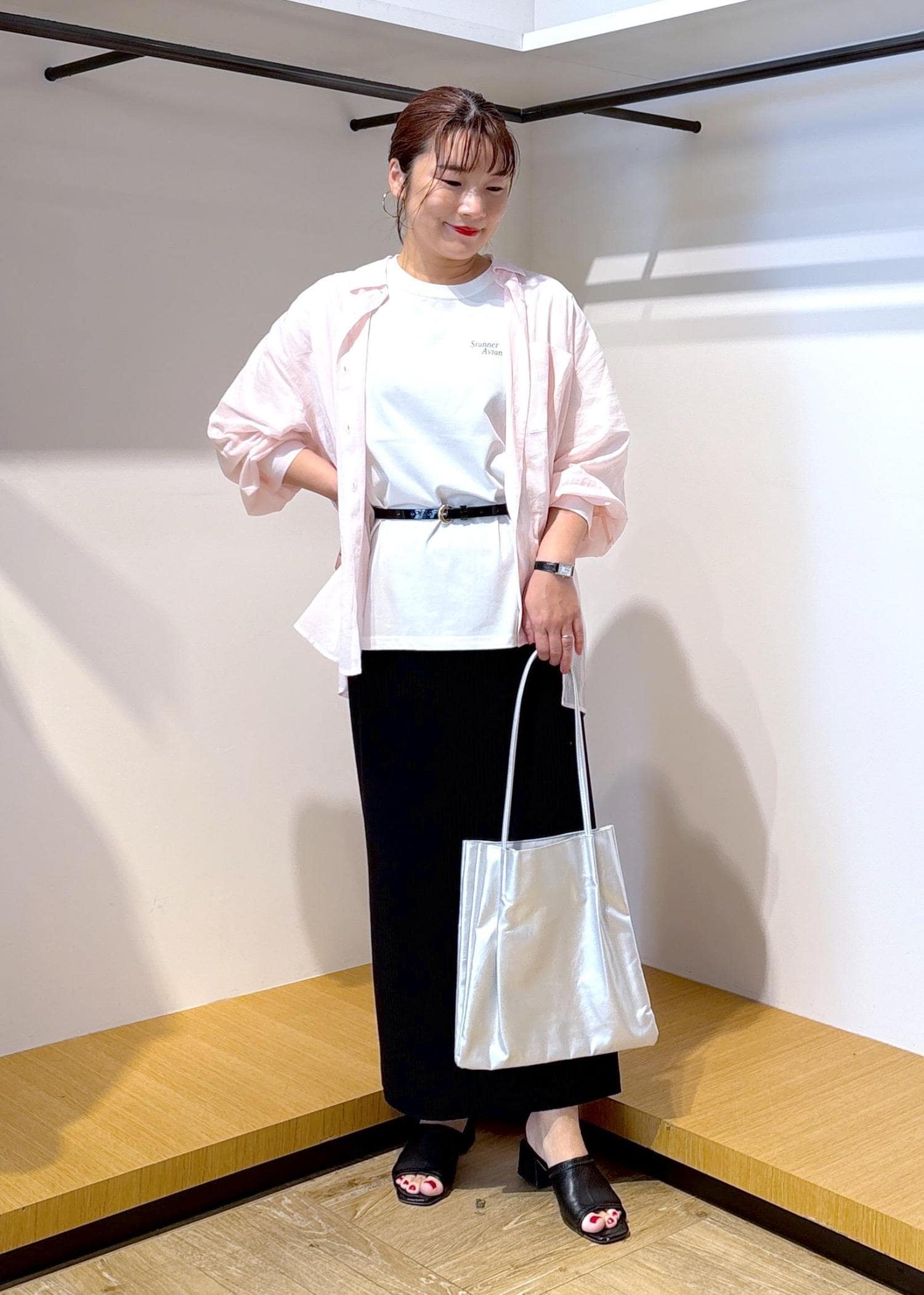 タイトスカートにオーバーサイズのTシャツと羽織りシャツを合わせてお腹まわりも心配いらないコーデです☆