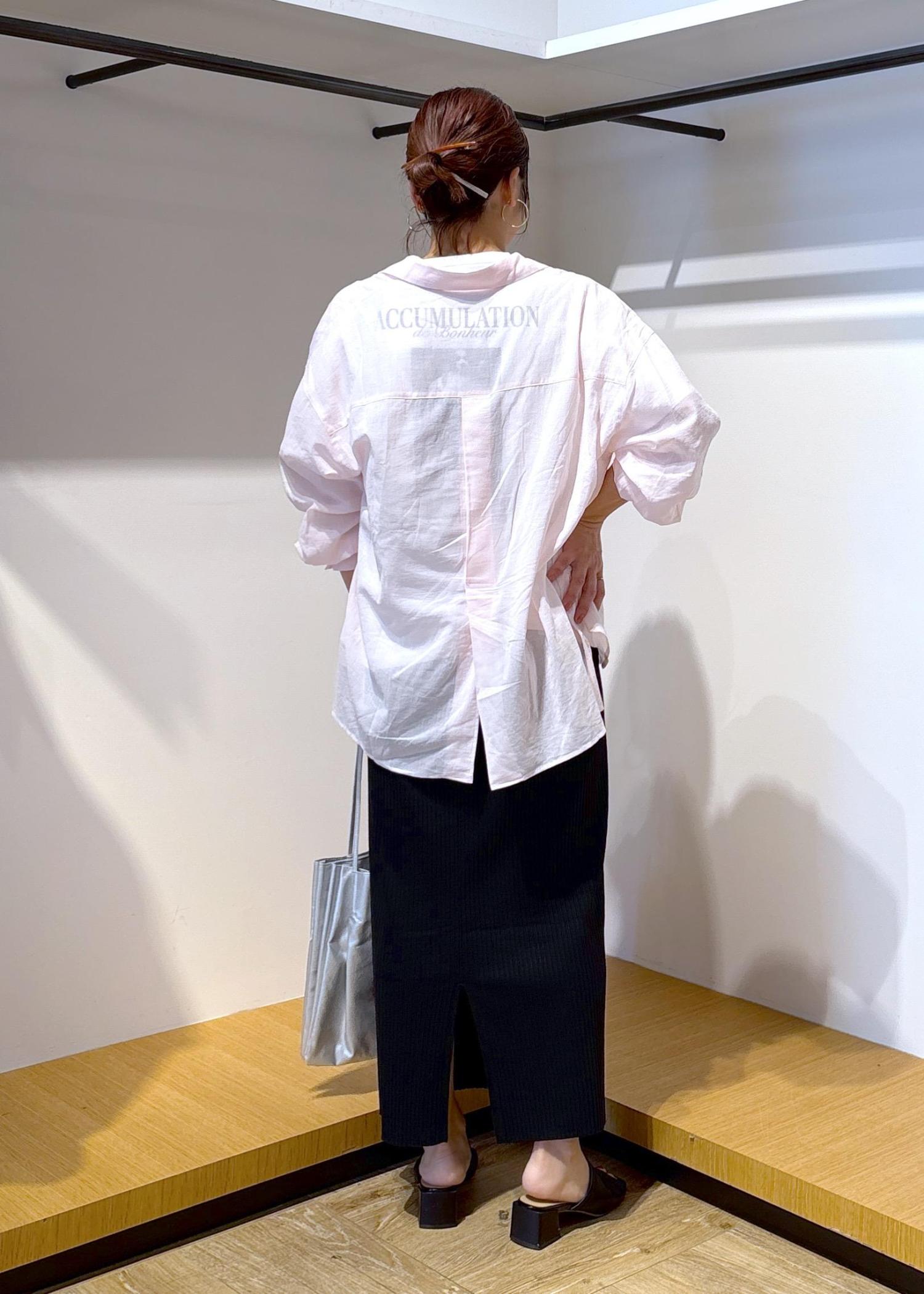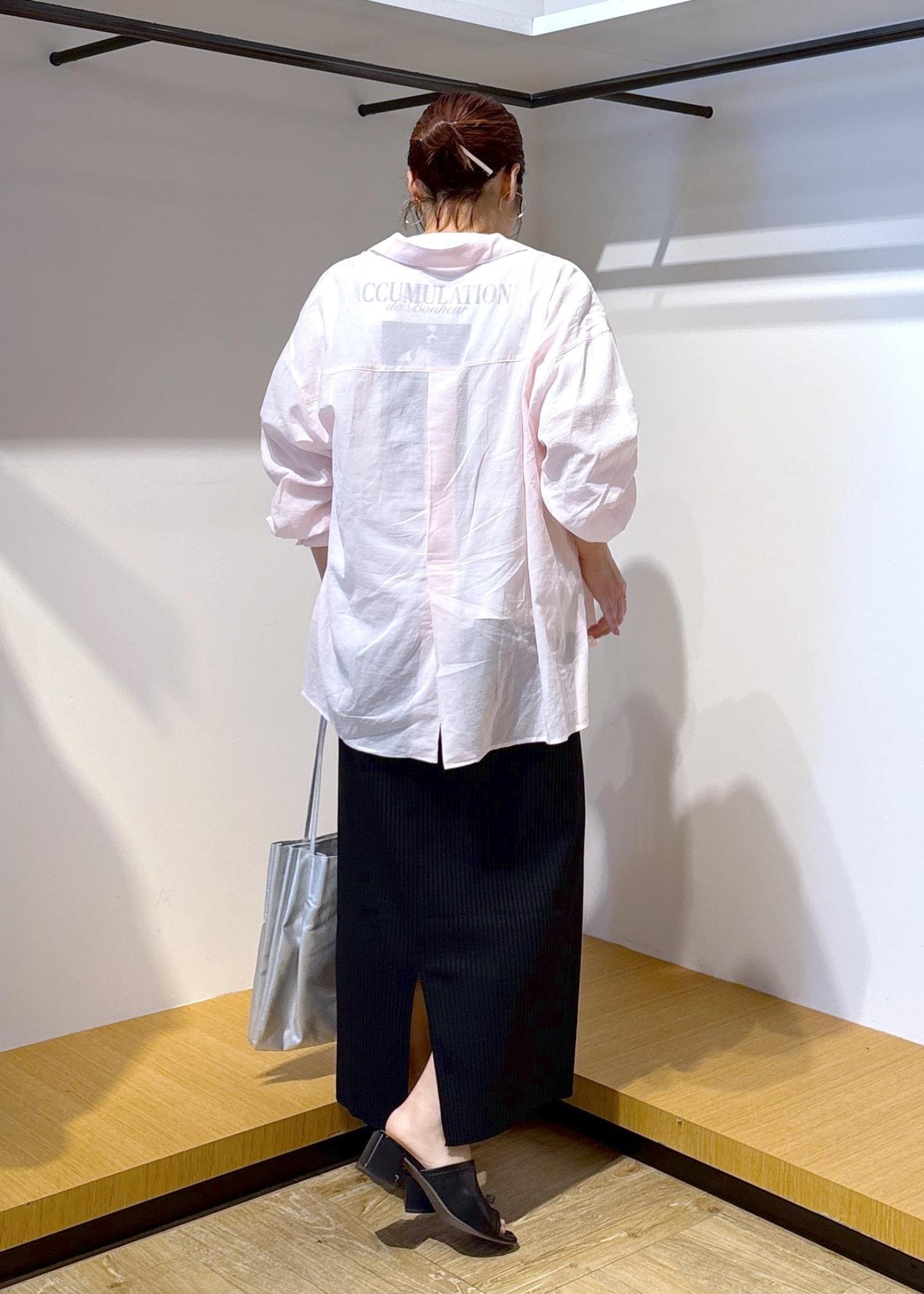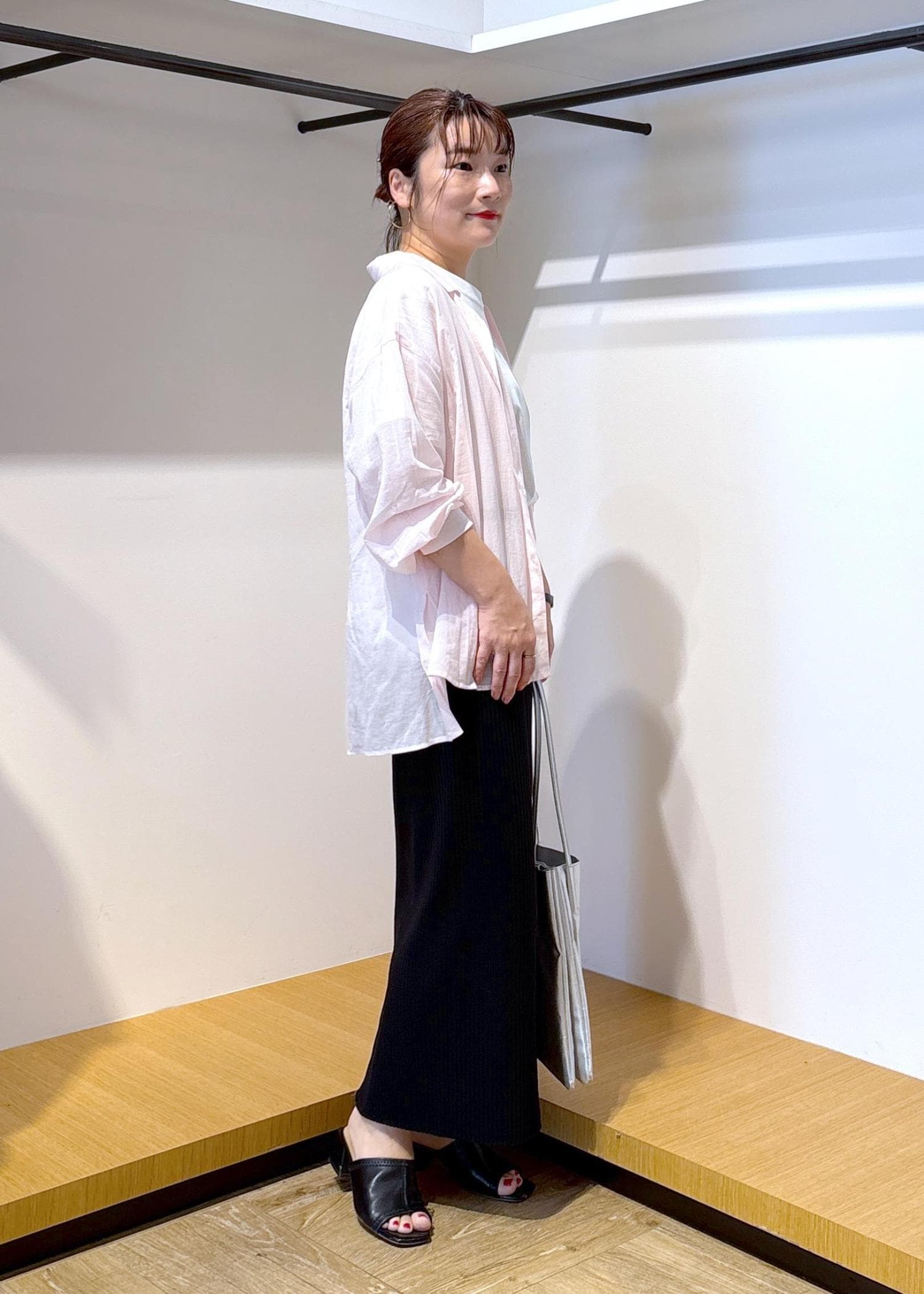 タイトスカートにオーバーサイズのTシャツと羽織りシャツを合わせてお腹まわりも心配いらないコーデです☆