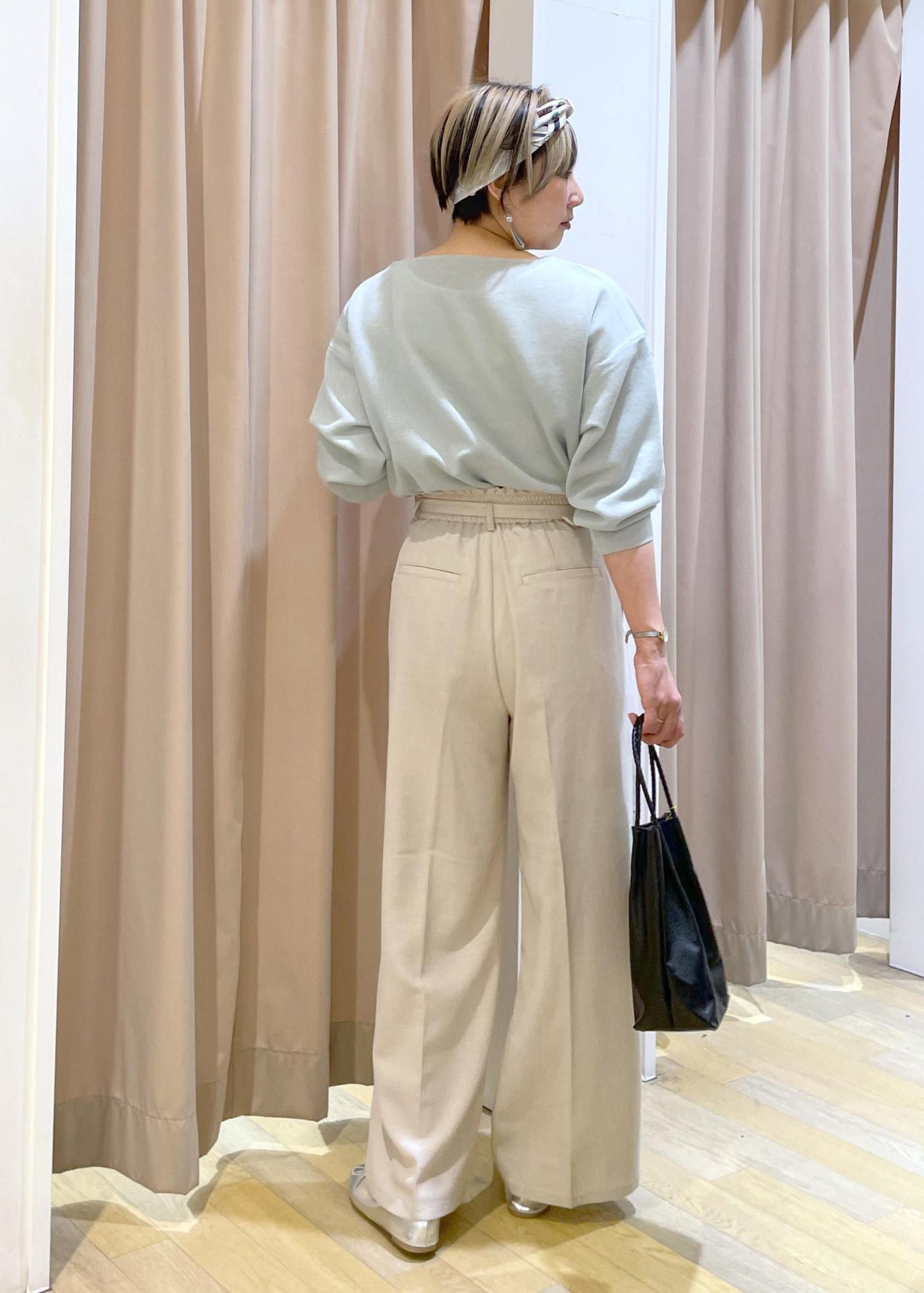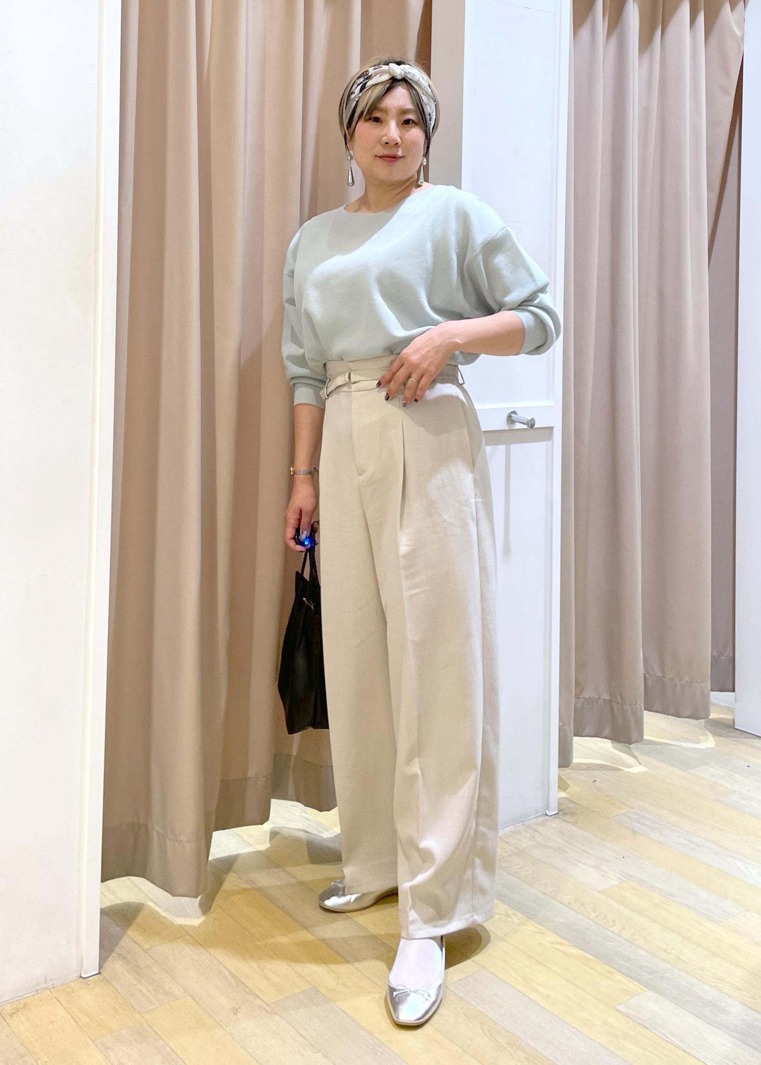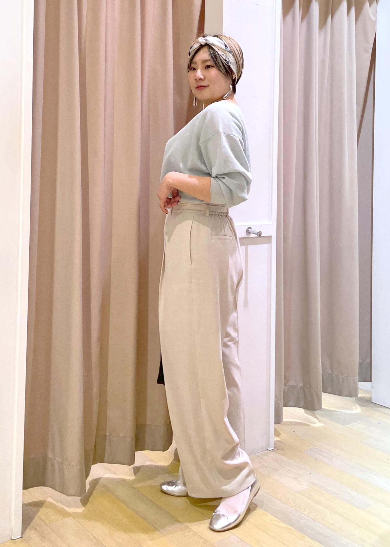 柔らかいパステルグリーンのトップスに、キナリのワイドパンツを合わせた、春らしいペールトーンコーデです。