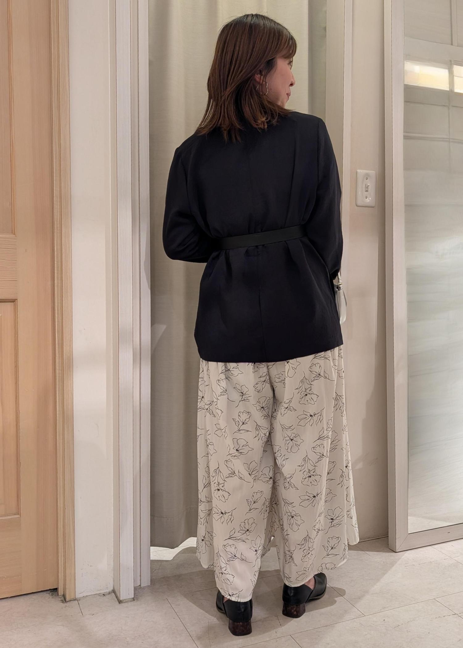 レースインナーにスカーチョを合わせたモノトーンスタイルにジャケットをプラスしました。