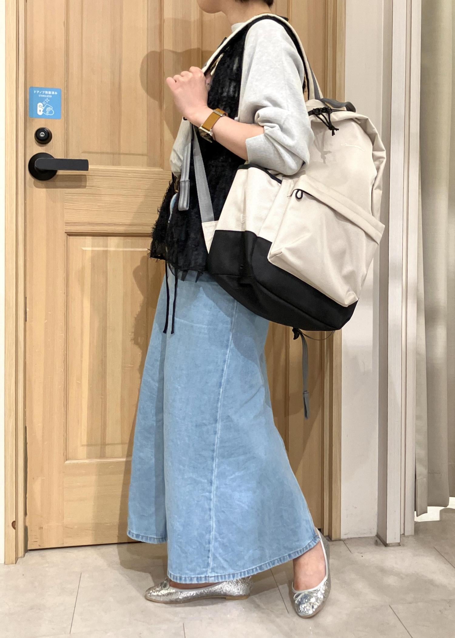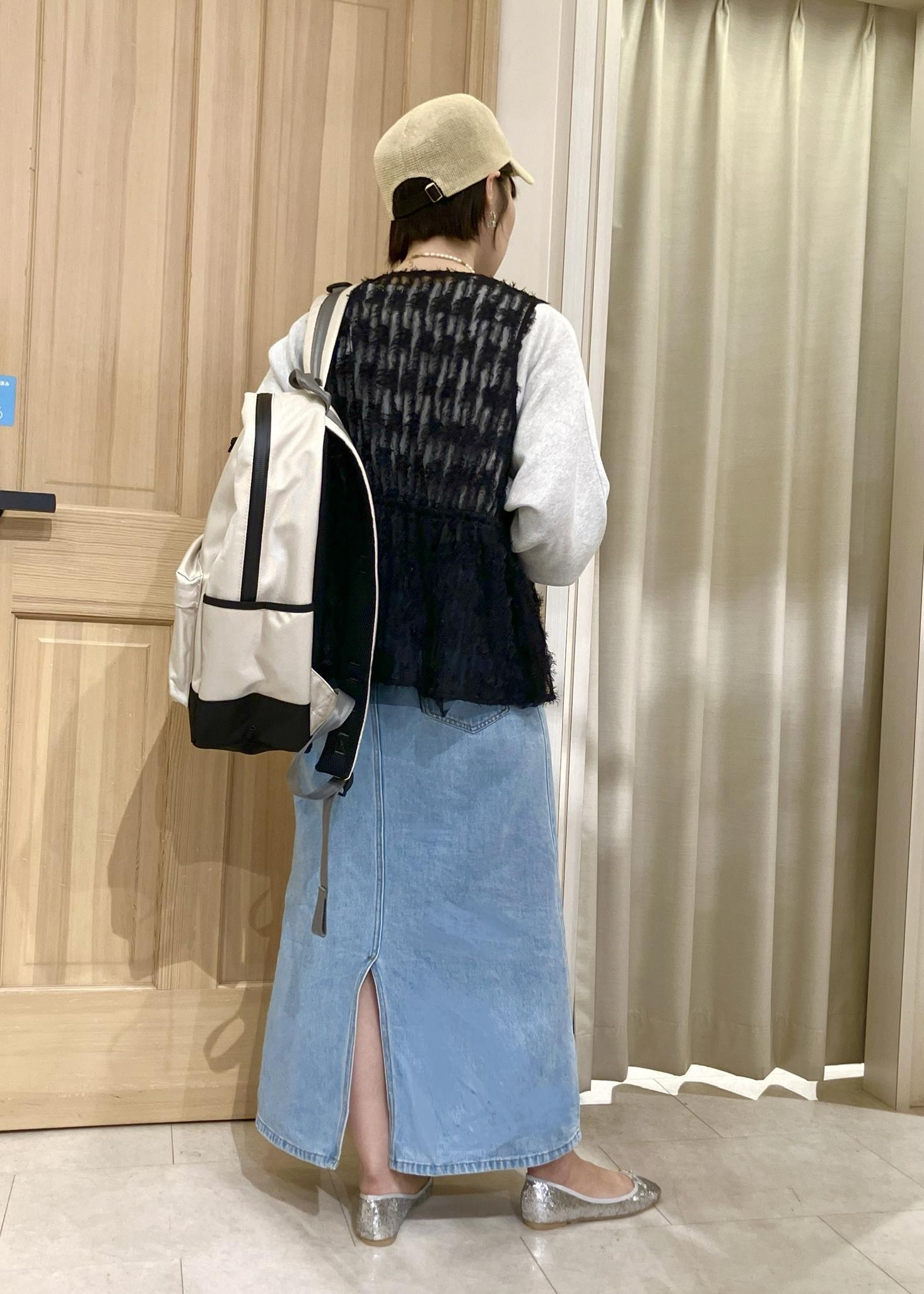 たくさん歩いても大丈夫なよう、キャップとリュックで動きやすさ重視の小物使いにしています◎