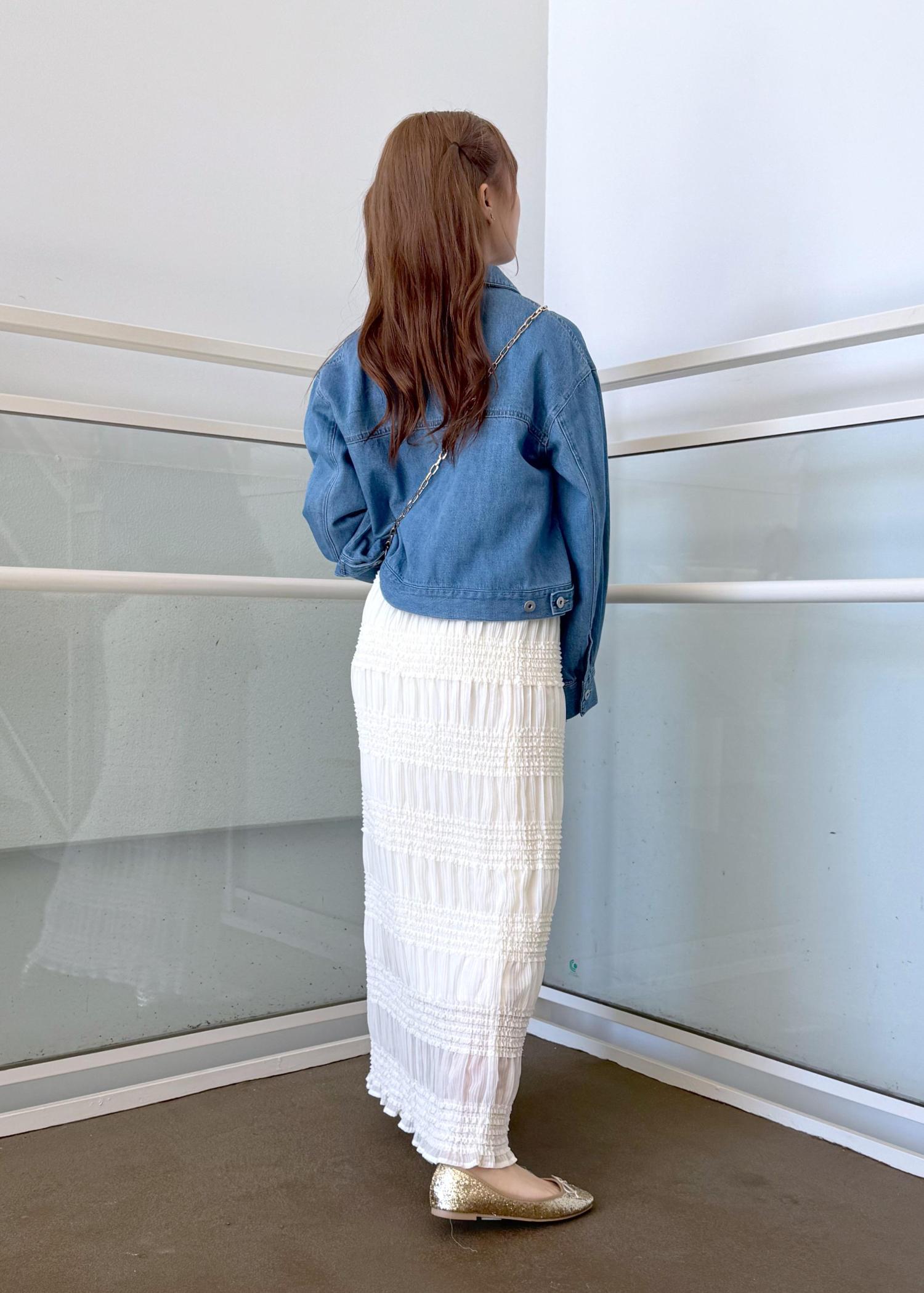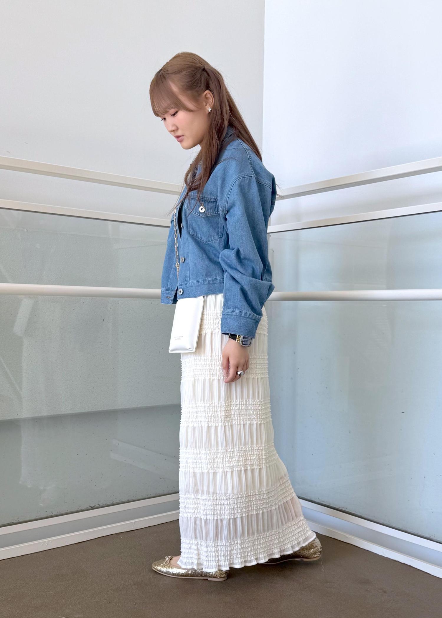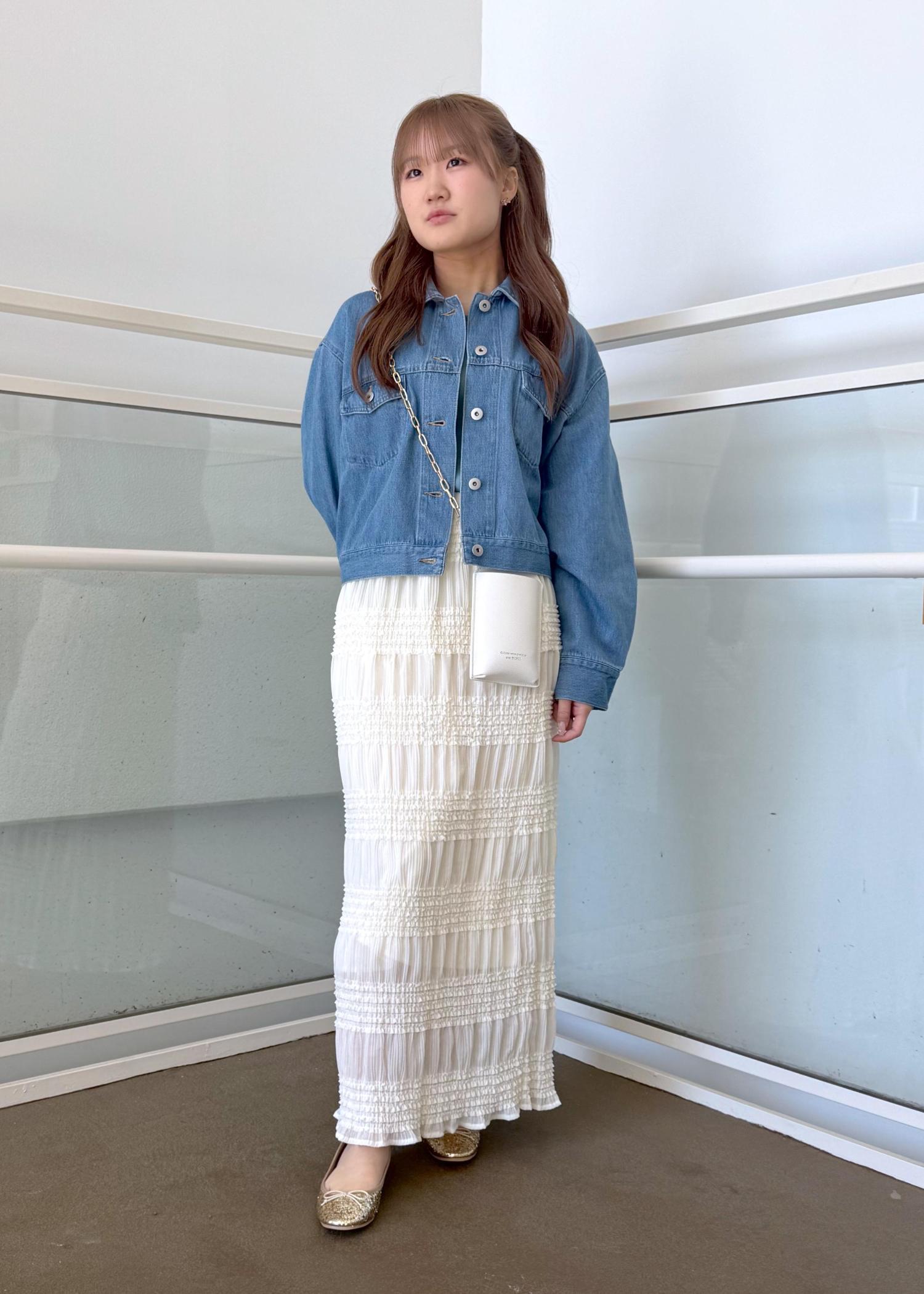デニムジャケットを脱いだら、落ち着きのあるブルーのトップスに可愛らしいフリルのスカートを合わせて、少しガーリー要素も入れてみました!
