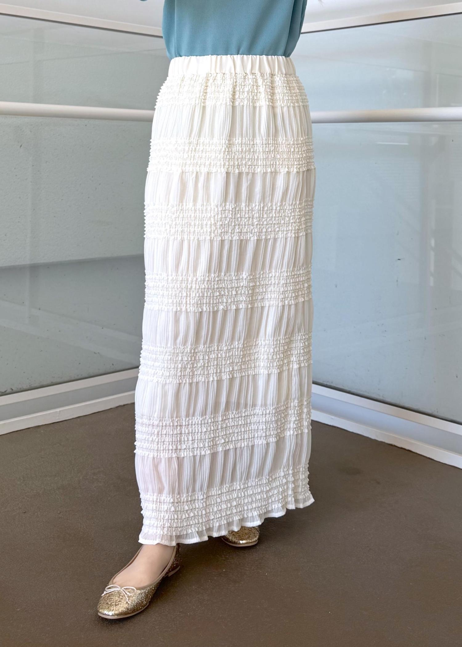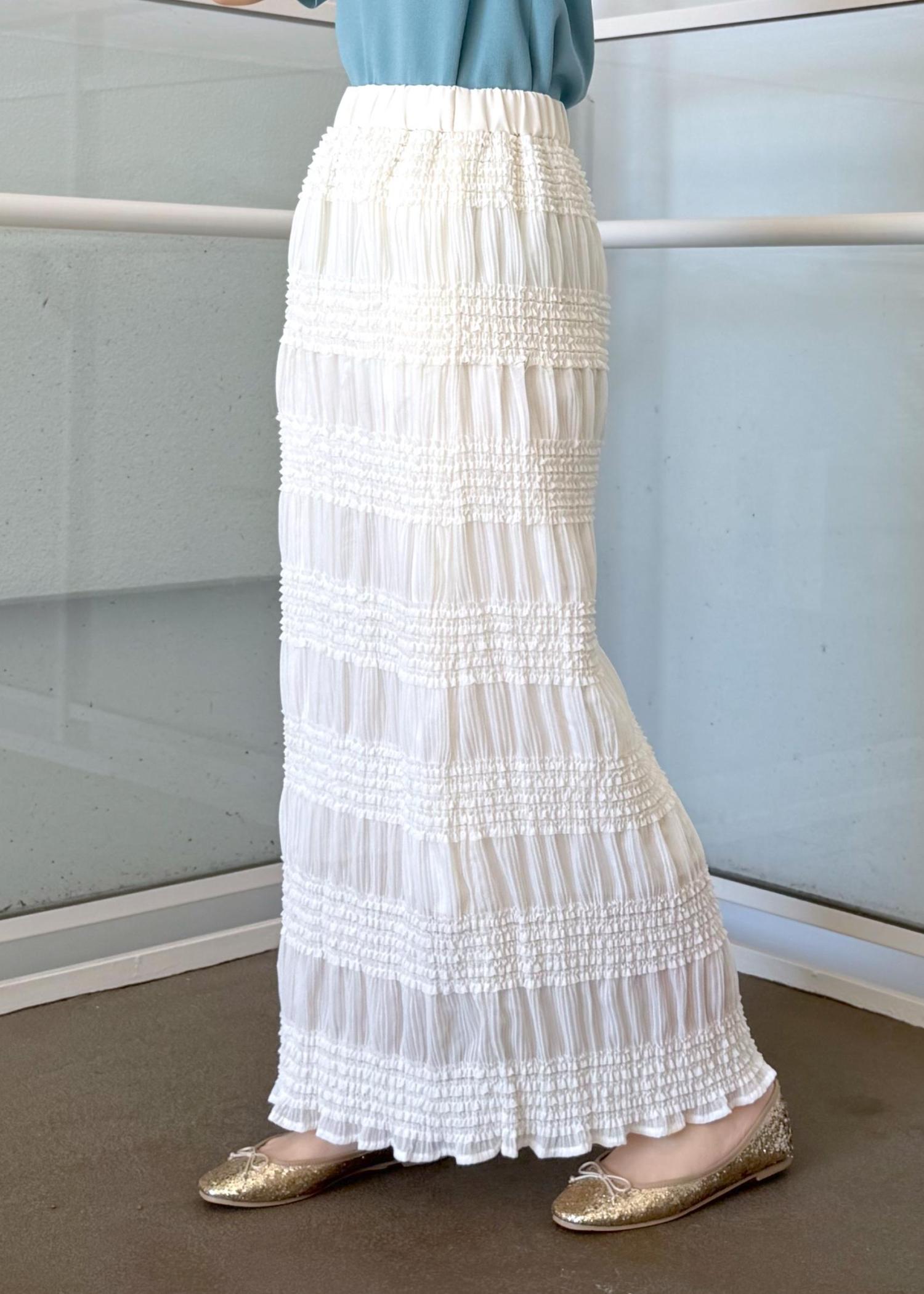 ROPÉ PICNICフリルギャザーロングスカートホワイト / 38¥6,490レビュープリーツと、フリルがある事で、ヒップラインが拾いにくいのがポイントです!