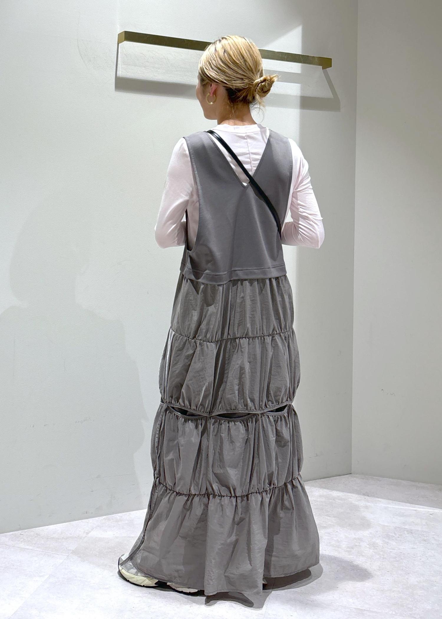 トップス部分とスカート部分が異素材のコンビワンピースです。