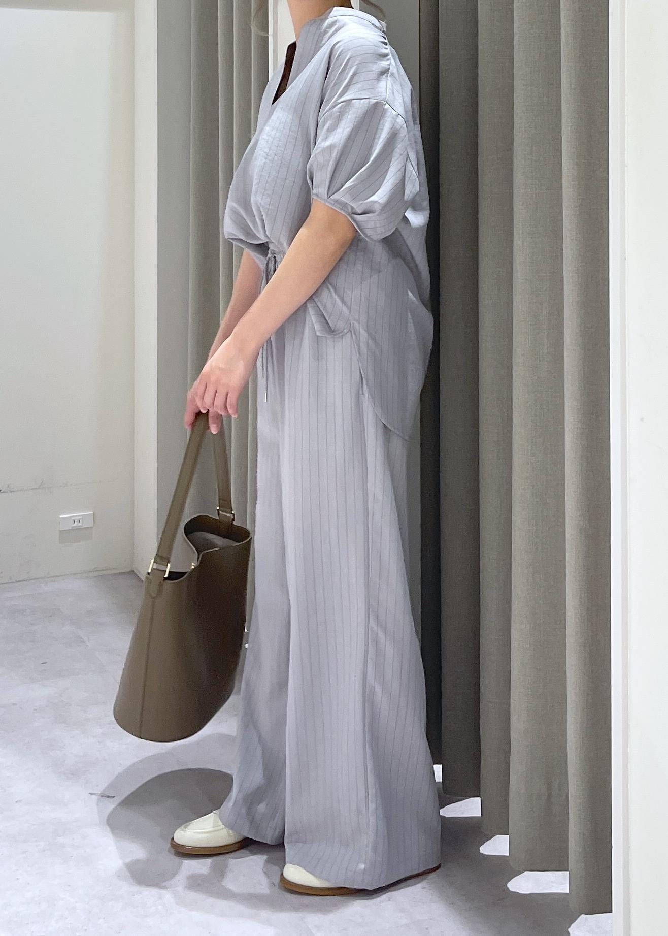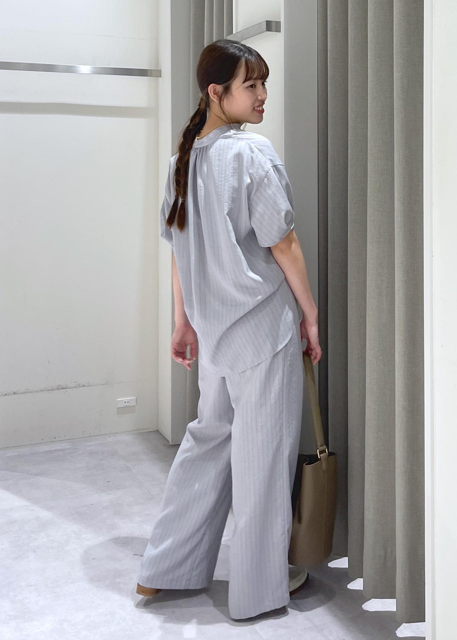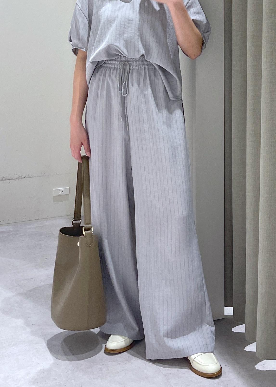 ストライプのセットアップはよりきれいめな印象を与えますが、リネンライク素材で柔らかい印象もあり