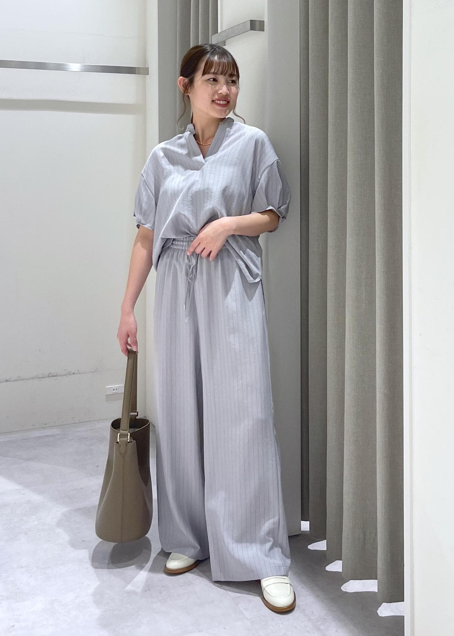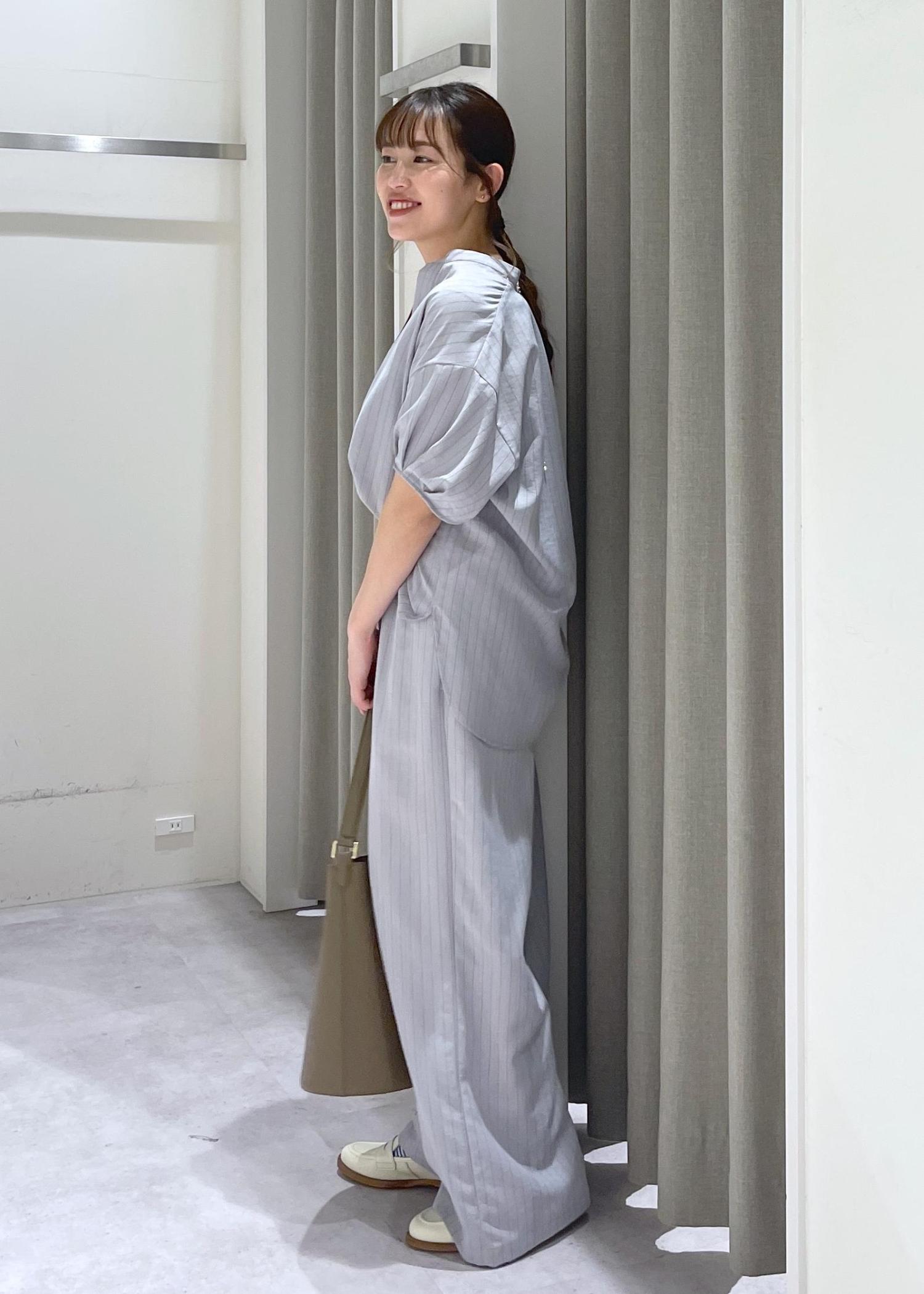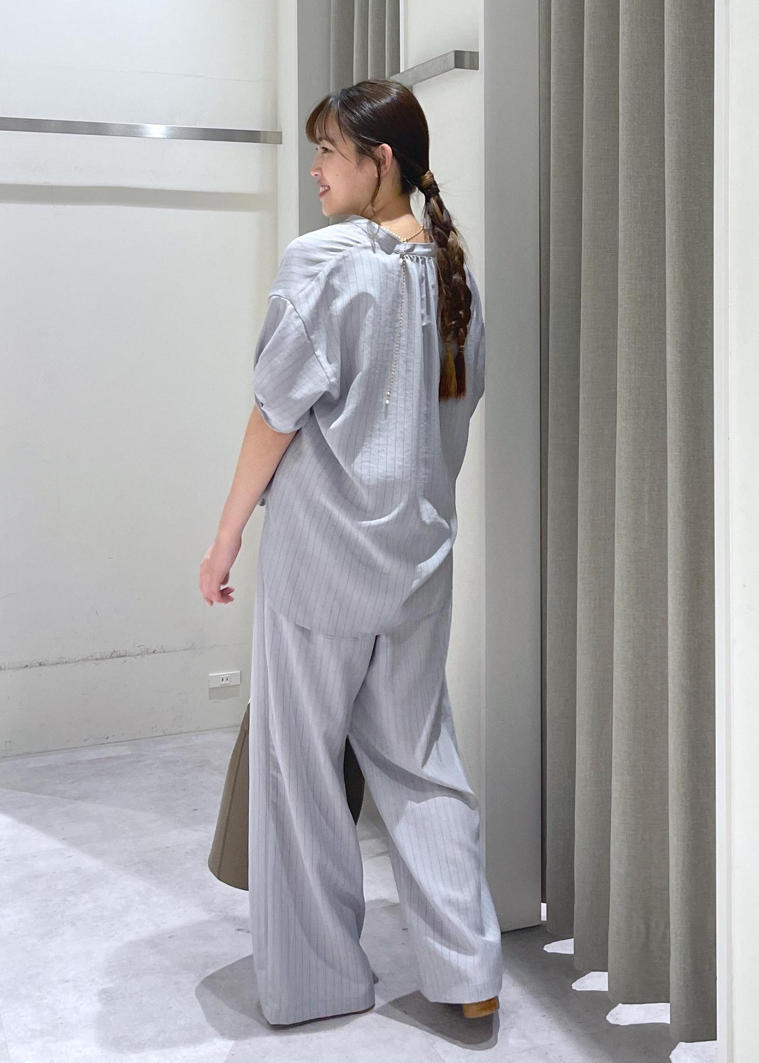 ストライプのセットアップはよりきれいめな印象を与えますが、リネンライク素材で柔らかい印象もあり
