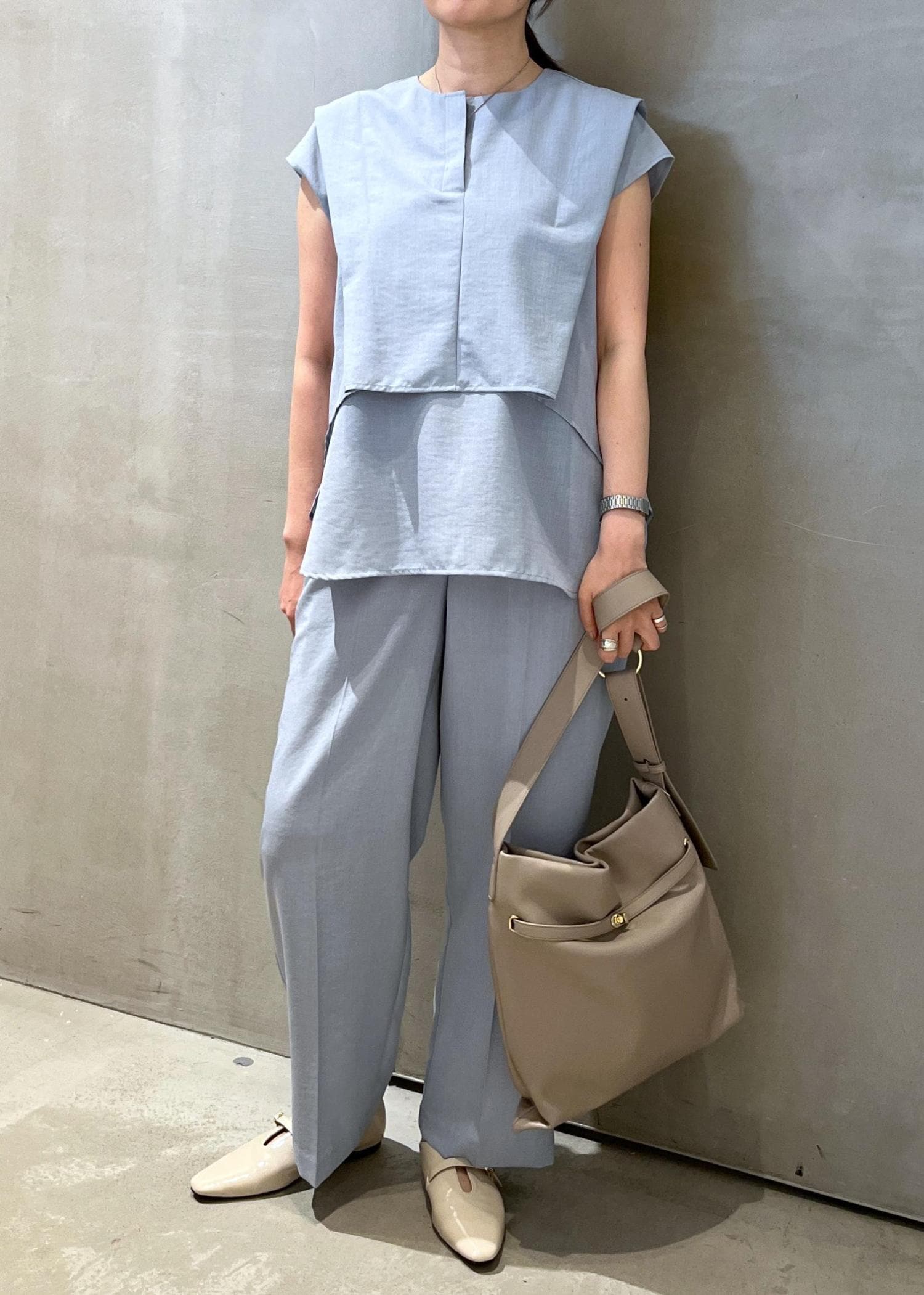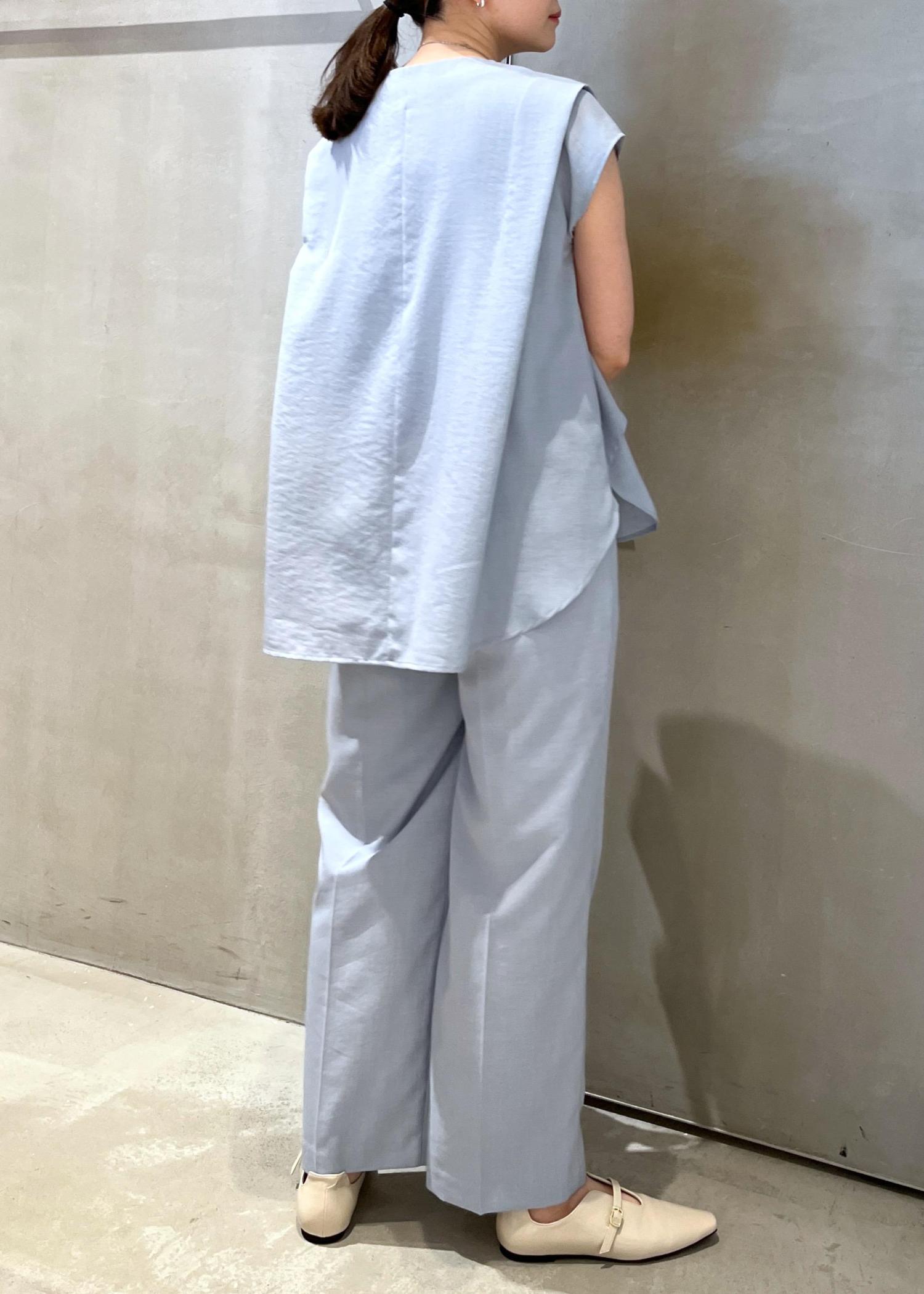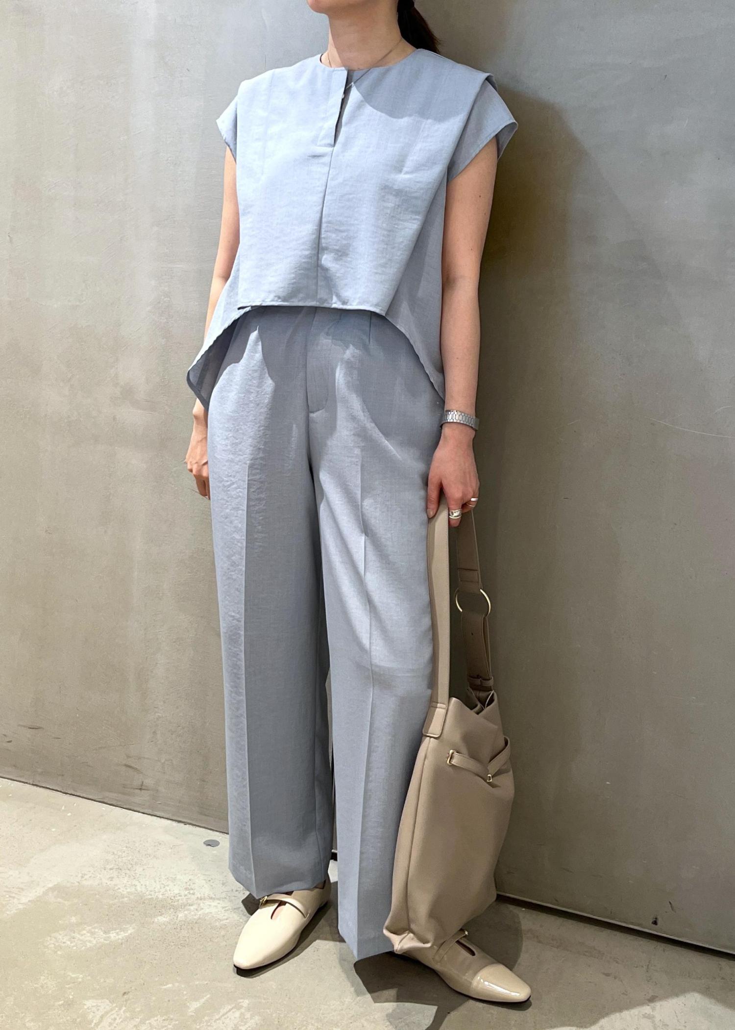 今回着用したブルーはパンツはストレートタイプのみの展開ですが、他のお色はワイドパンツスタイルもございます。