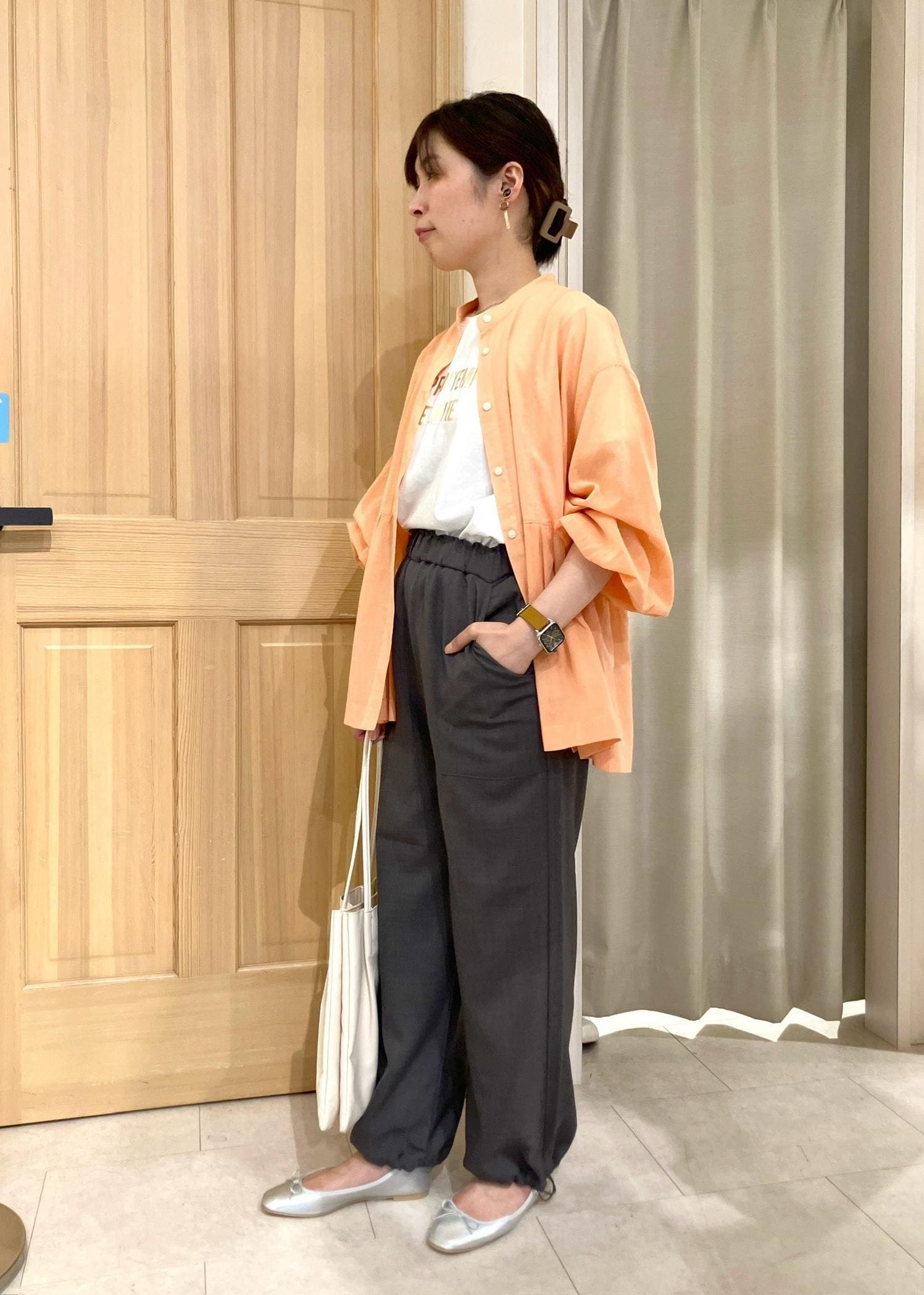 肌あたりの優しい綿ボイルシャツに、イージーパンツを合わせたリラックスコーデ。