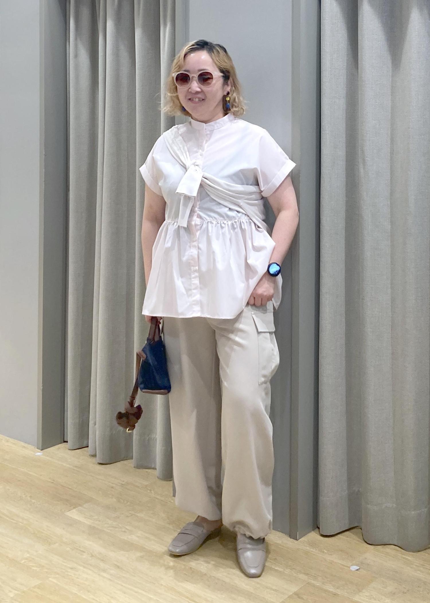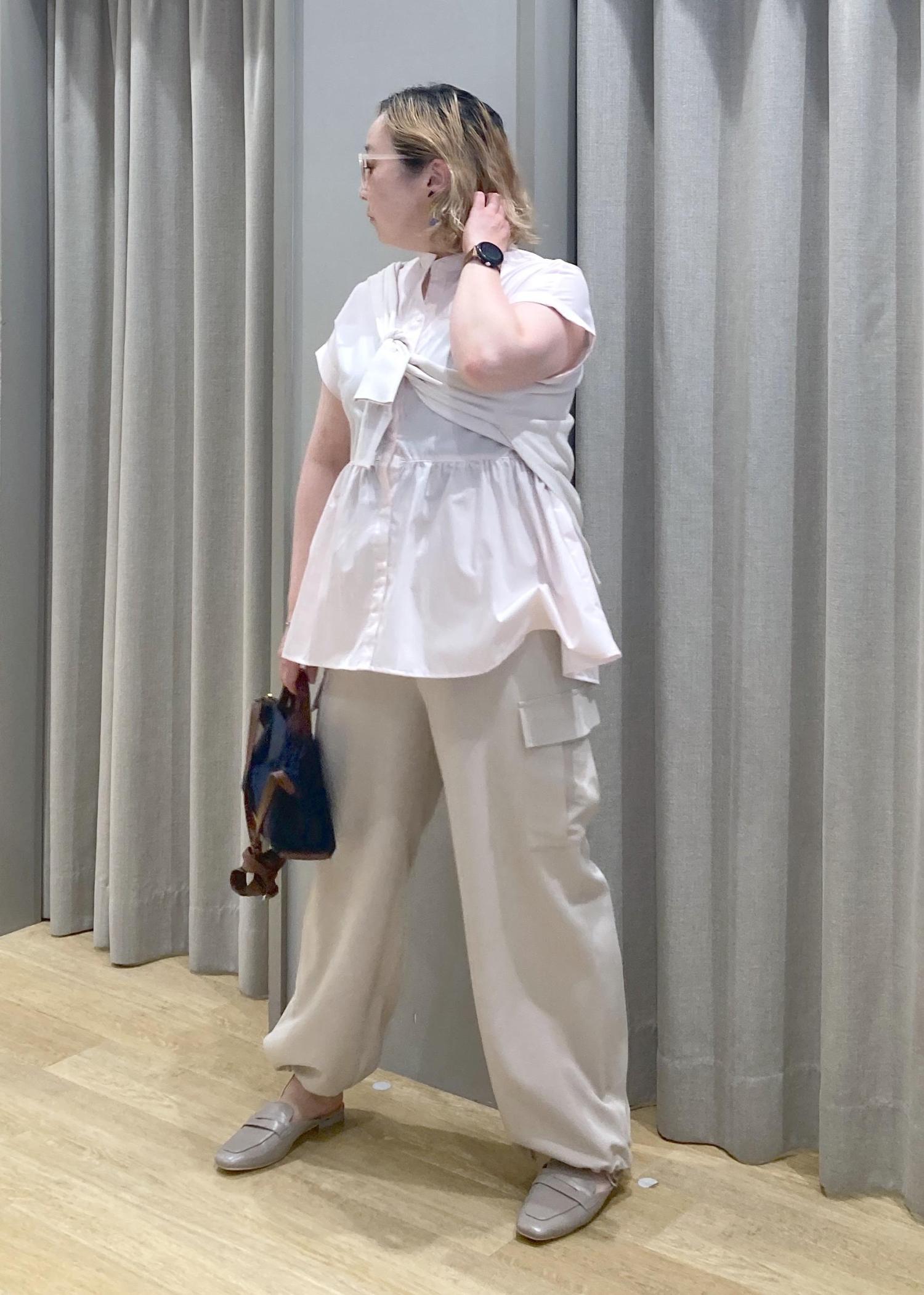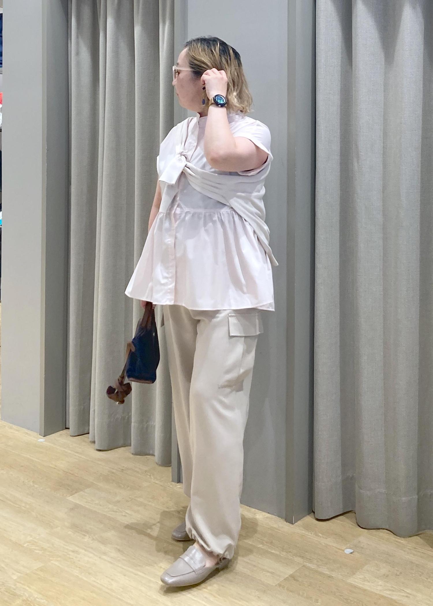 淡いピンクのペプラムブラウスに、ほんのりアース感のあるベージュのカーゴパンツを合わせた、女性らしさと程よい抜け感が絶妙なバランス。白ベージュのカーディガンをふわりと肩にかければ、柔らかな春風をまとうような印象に。ブラウスレンズのサングラスをプラスすれば、甘すぎずラフすぎない、大人のためのナチュラルフェミニンスタイルが完成。