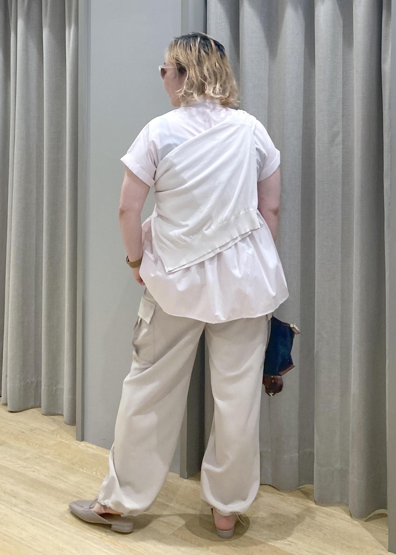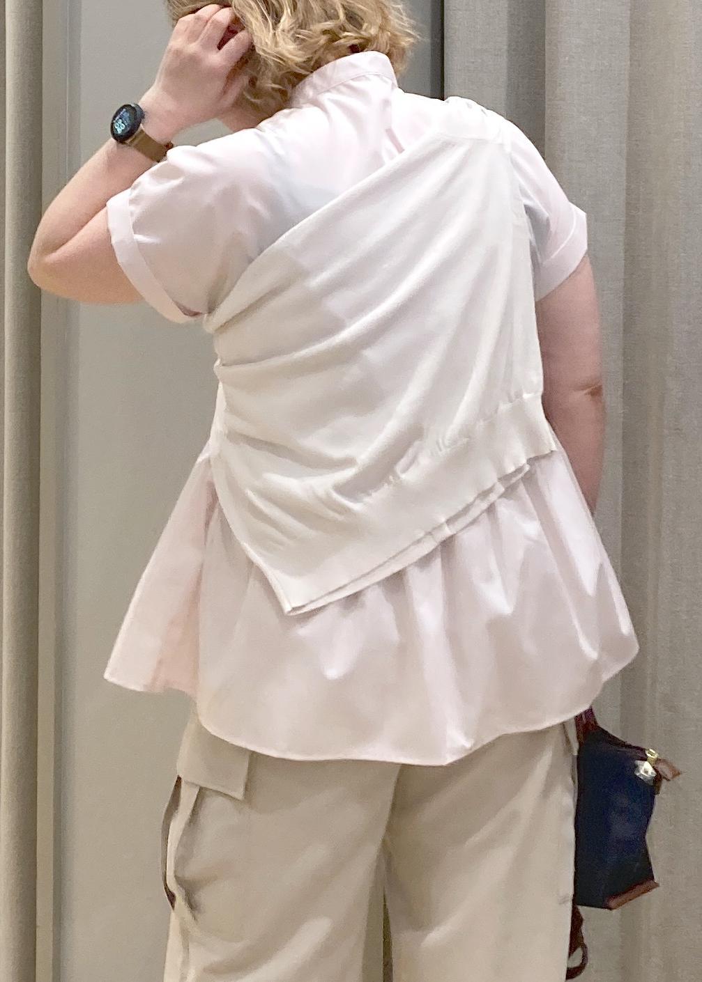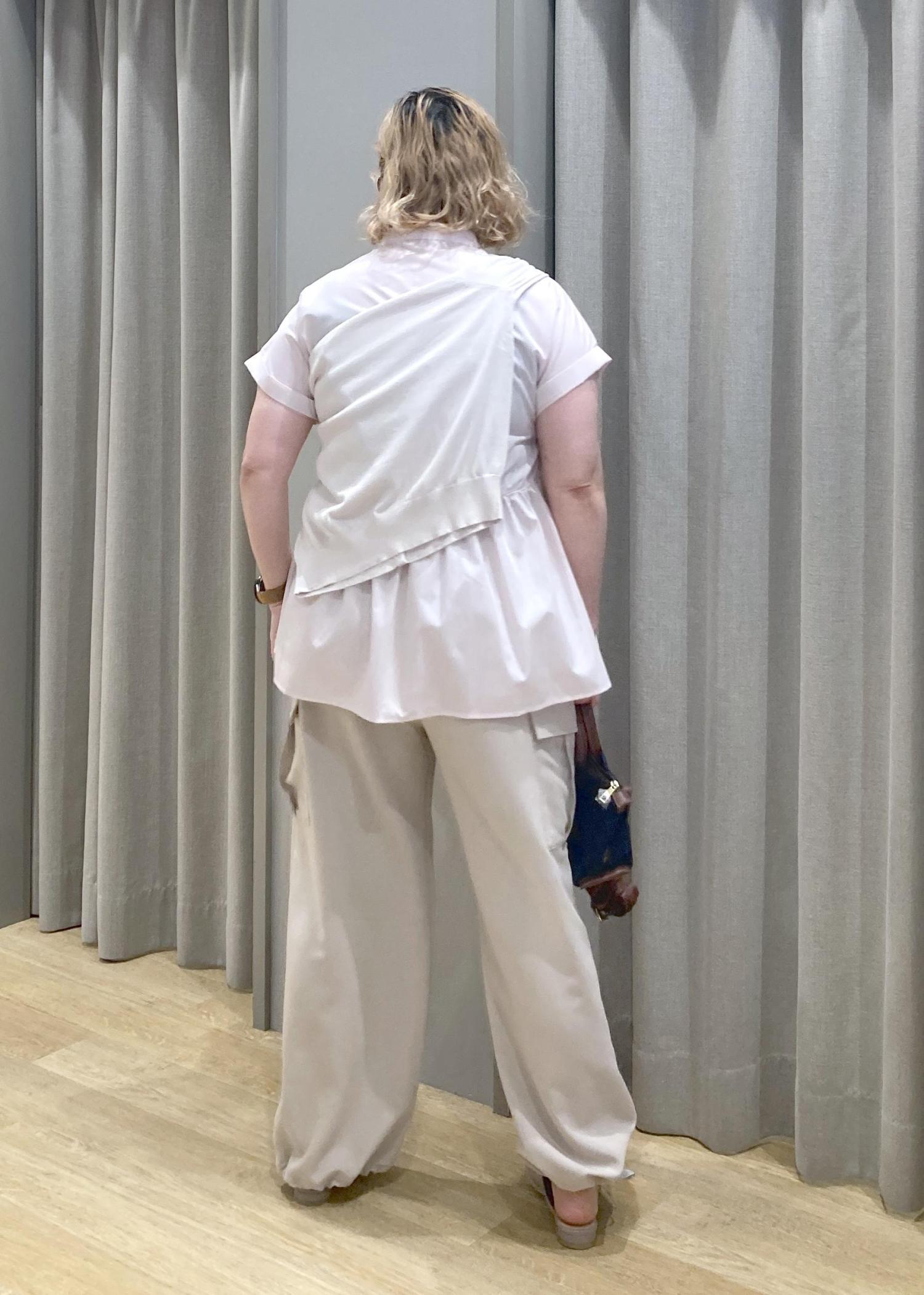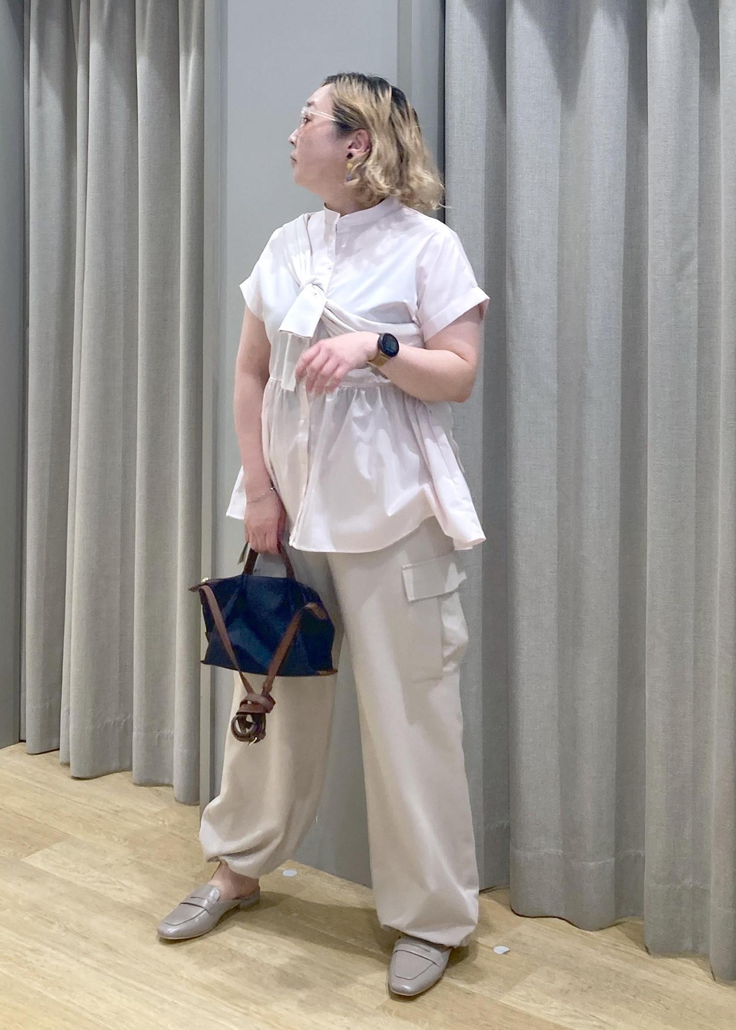 淡いピンクのペプラムブラウスに、ほんのりアース感のあるベージュのカーゴパンツを合わせた、女性らしさと程よい抜け感が絶妙なバランス。白ベージュのカーディガンをふわりと肩にかければ、柔らかな春風をまとうような印象に。ブラウスレンズのサングラスをプラスすれば、甘すぎずラフすぎない、大人のためのナチュラルフェミニンスタイルが完成。