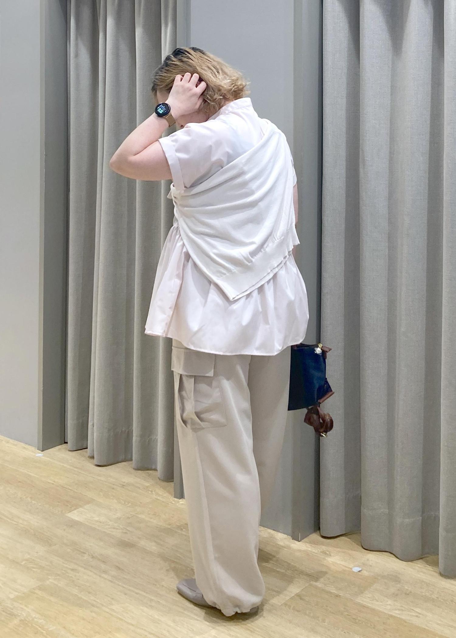 袖口が、折り返しと、カットが斜めになっているので、二の腕がすっきり見えるのでおすすめです -