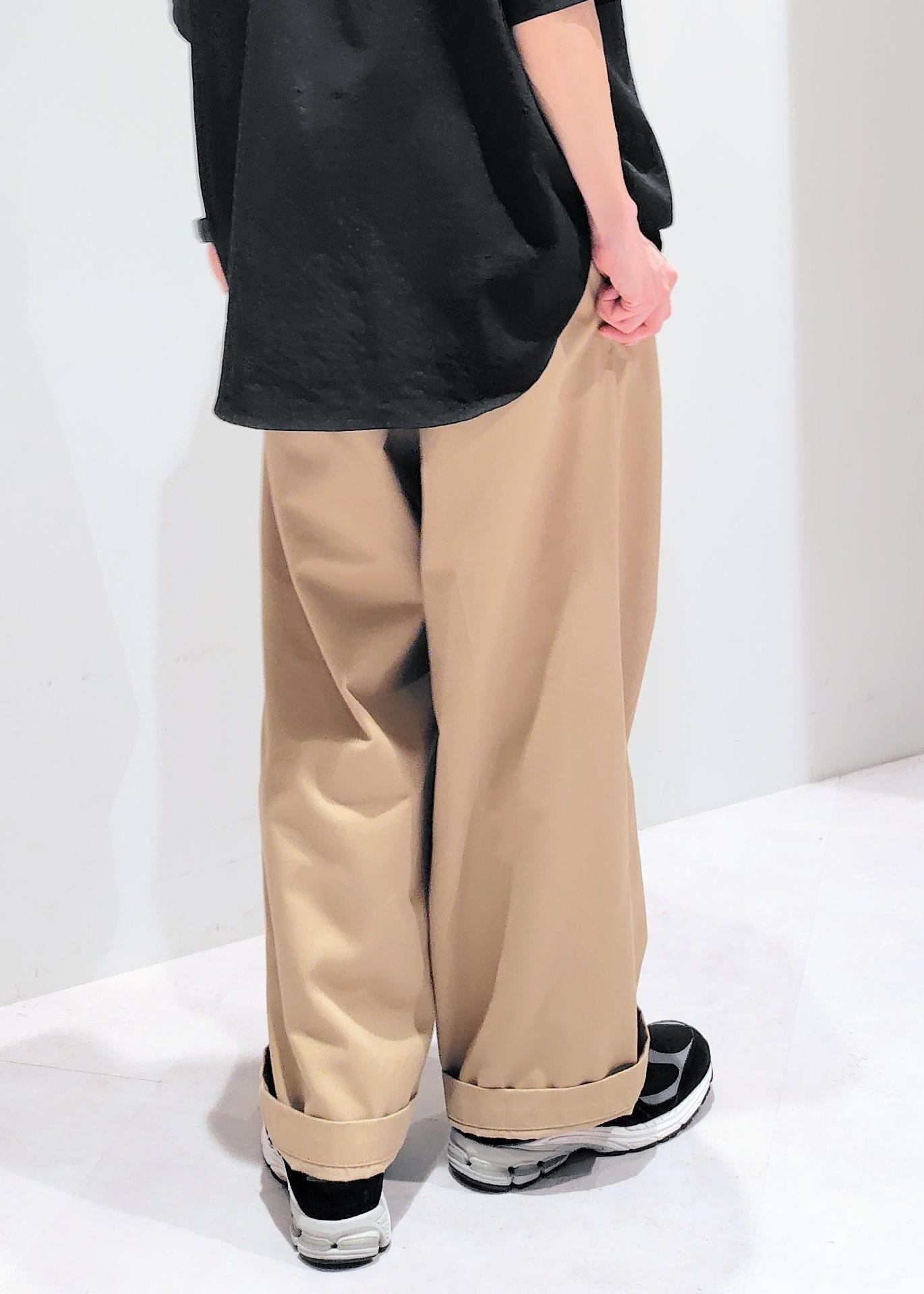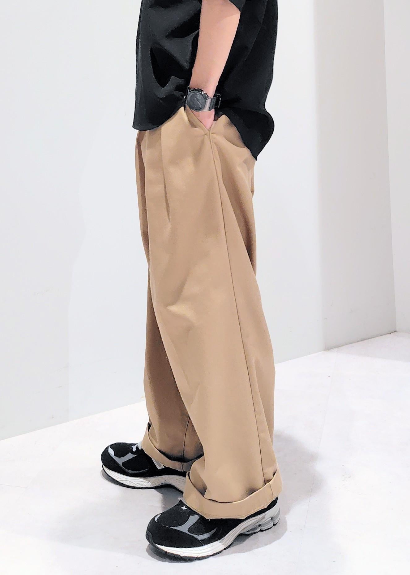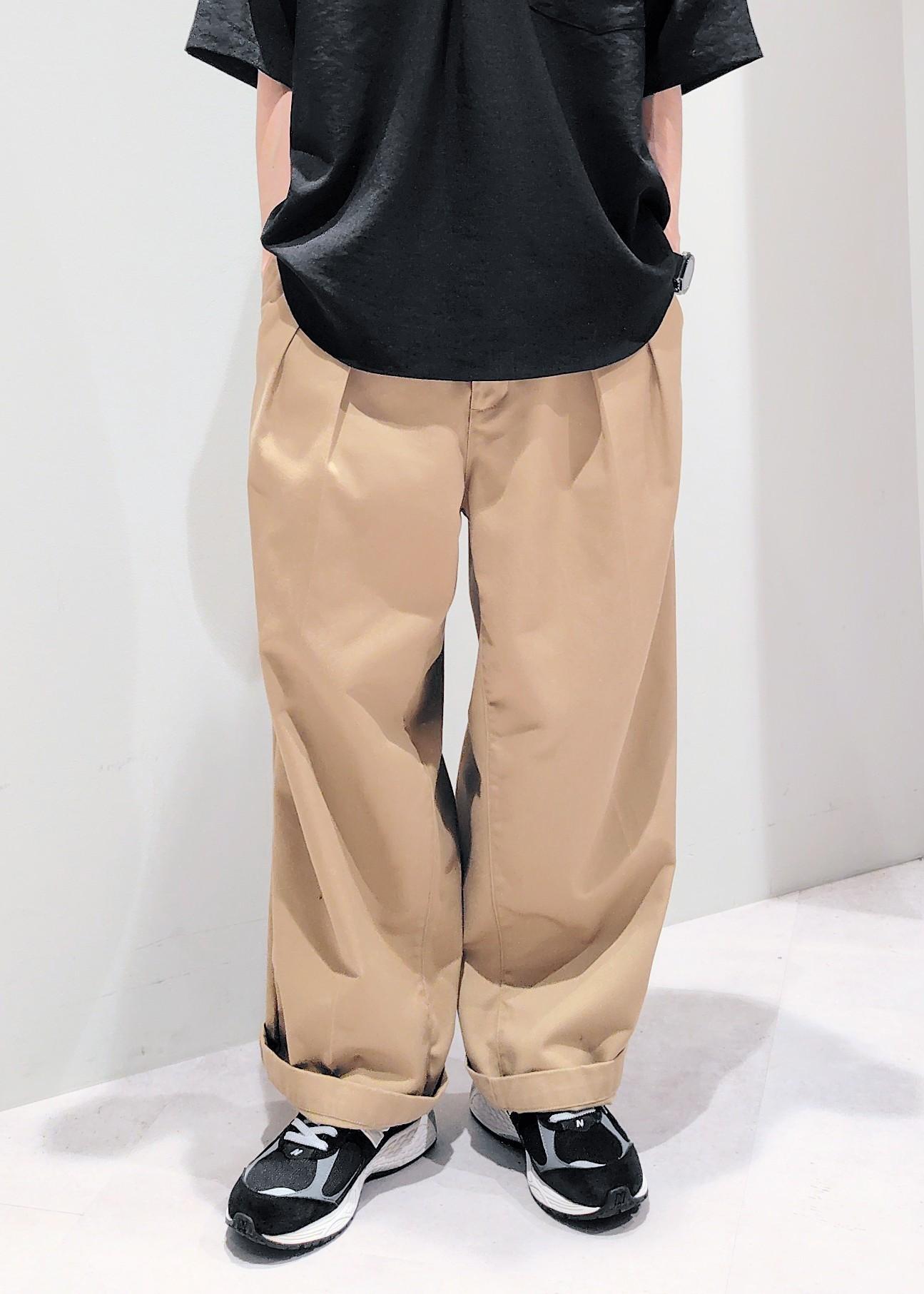 センタープレス入りのワイドストレート型パンツで2タックが深めに入っていることでよりルーズさが強調されています。
