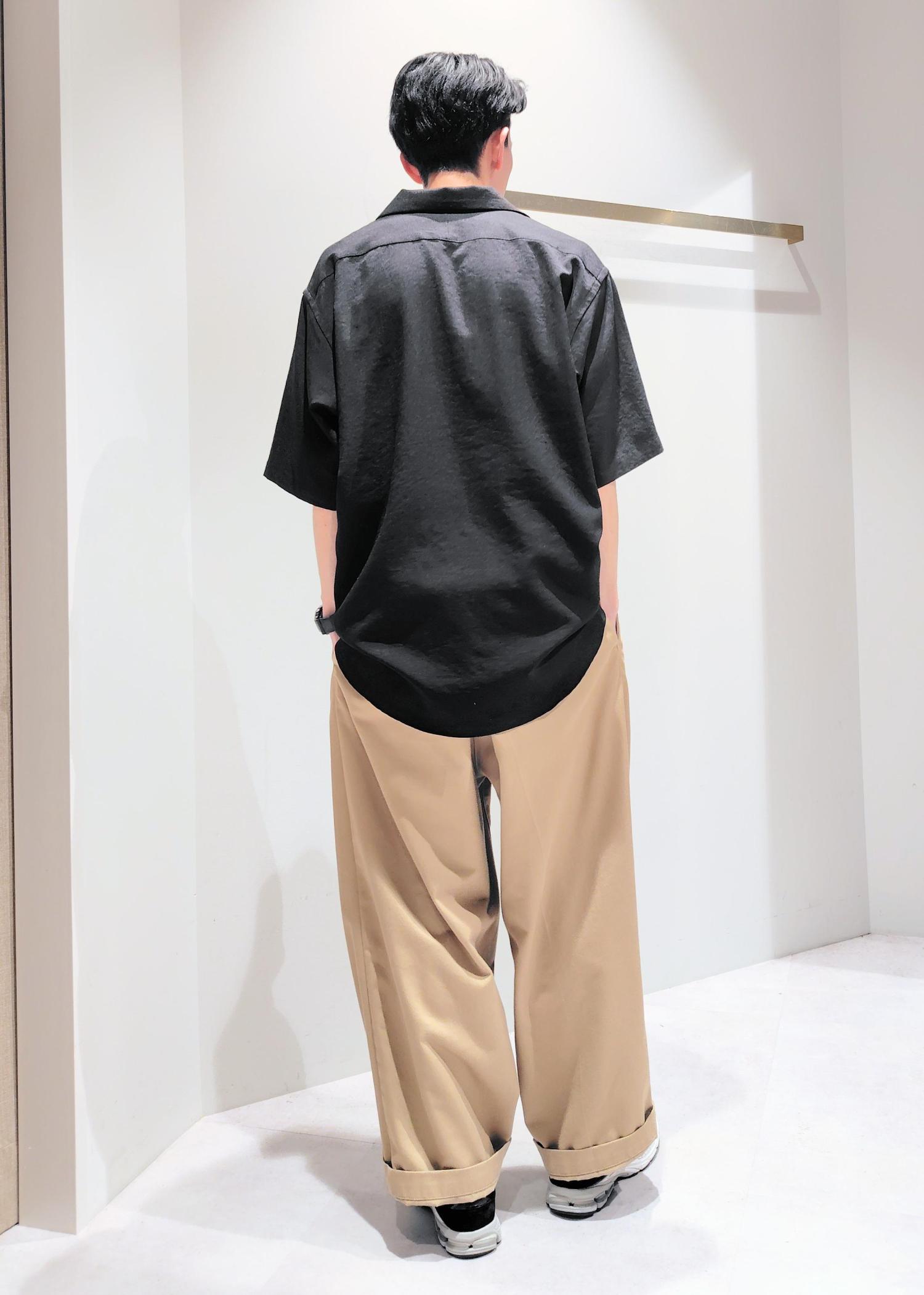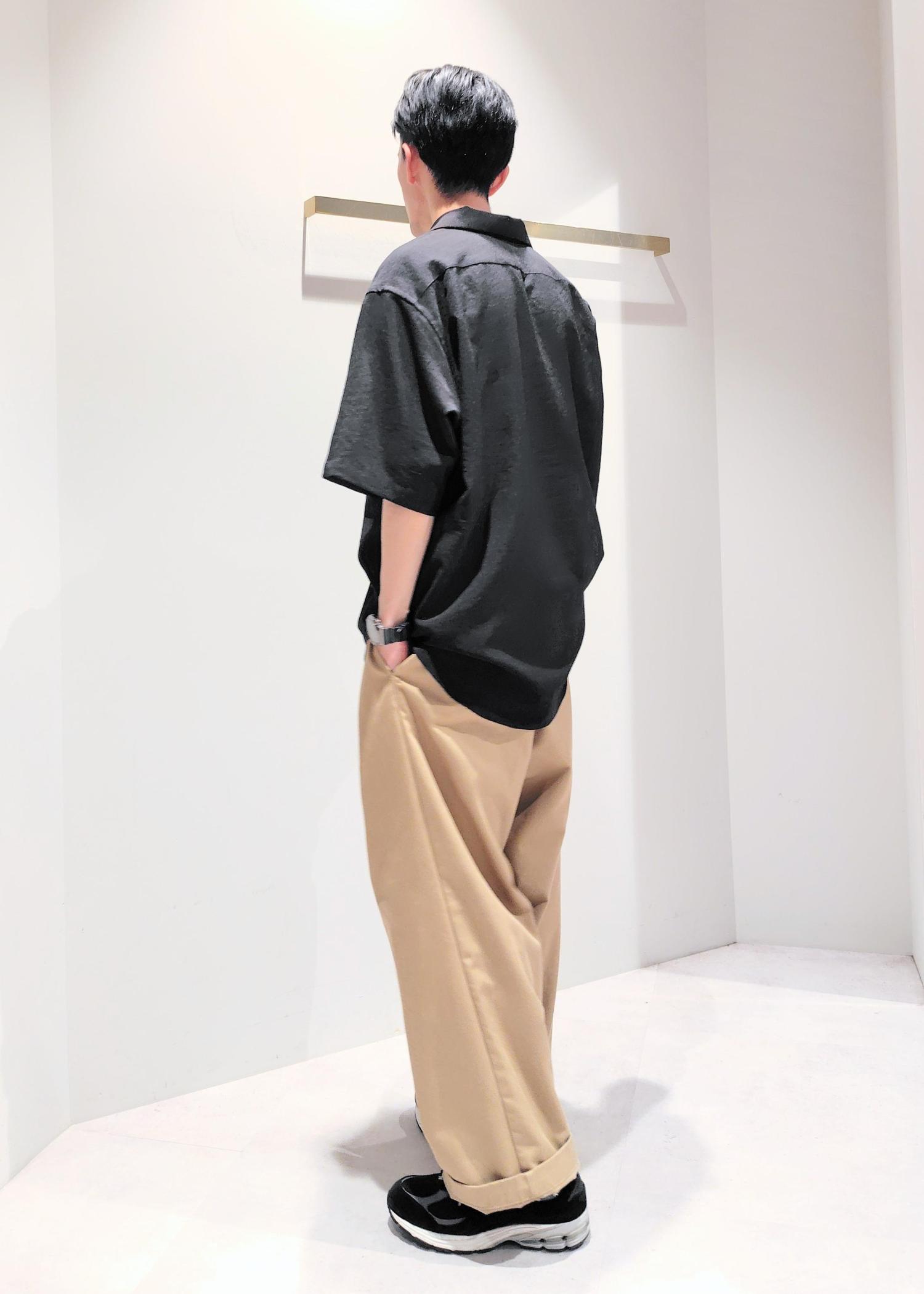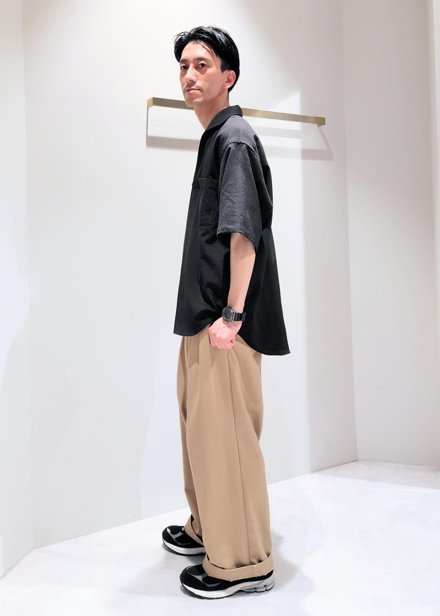 センタープレス入りのワイドストレート型パンツで2タックが深めに入っていることでよりルーズさが強調されています。