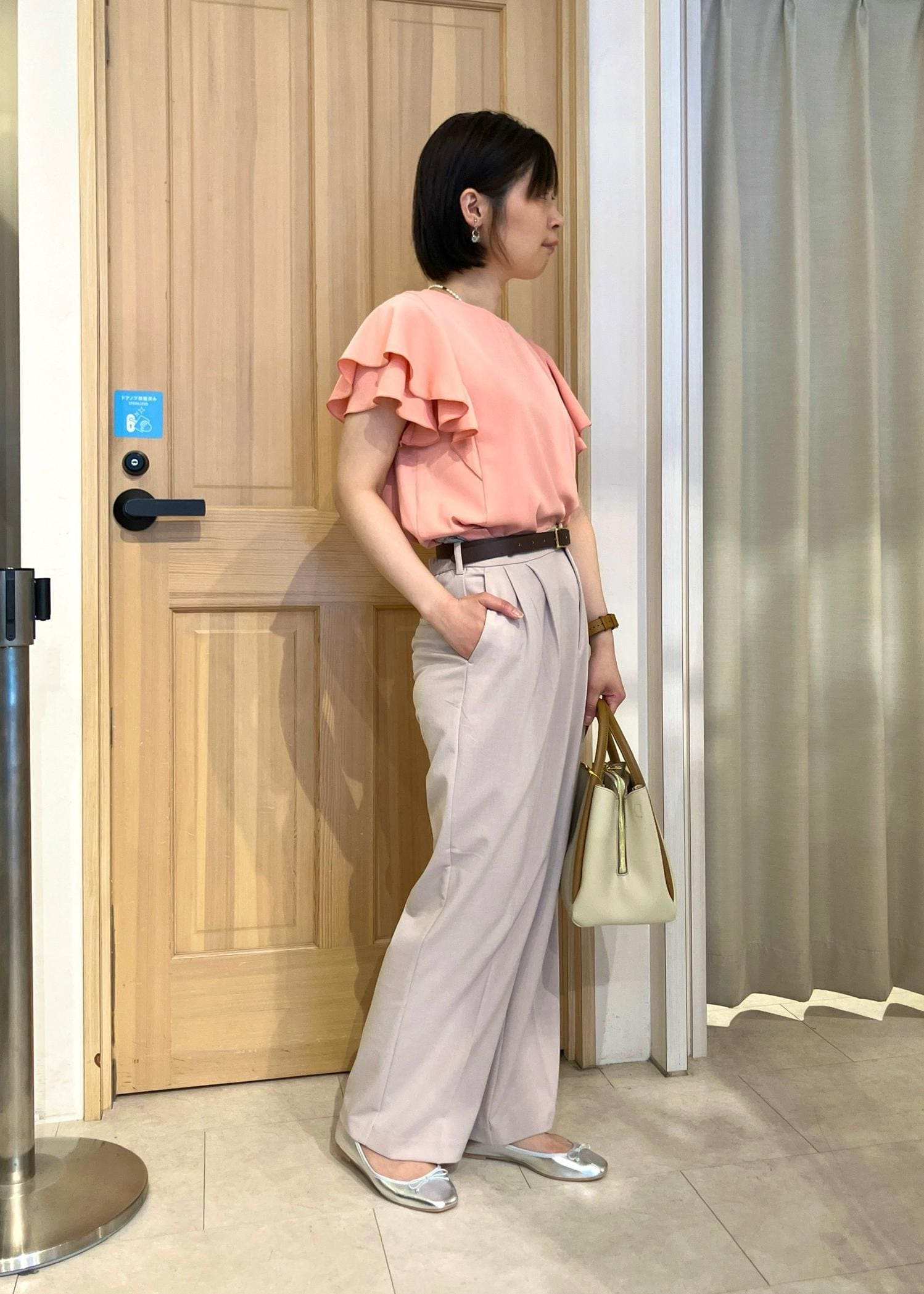 フリルスリーブのブラウスを使ったキレイめコーデ。